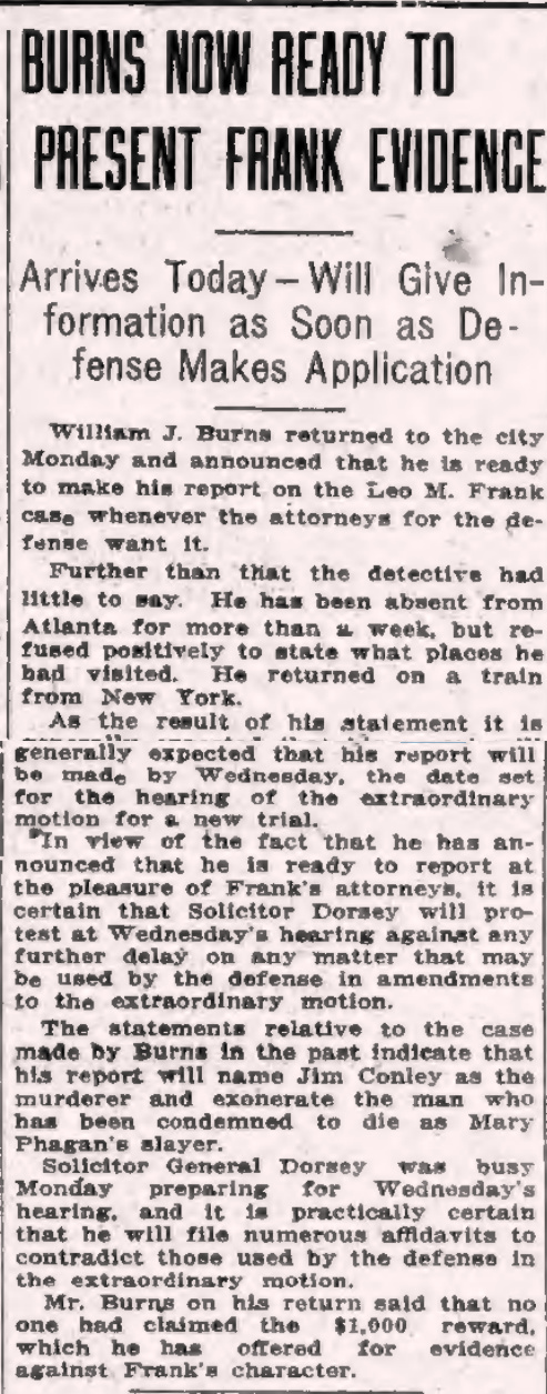 William J. Burns returned to the city on Monday and announced that he is ready to make his report on the Leo M. Frank case whenever the attorneys for the defense want it. Further than that, the detective had little to say. He has been absent from Atlanta for more than a week, but positively refused to state what places he had visited. He returned on a train from New York.