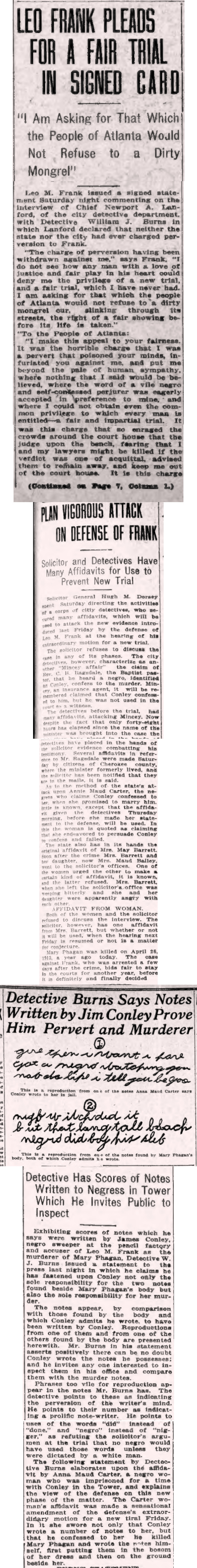 Detective W. J. Burns issued a statement to the press, claiming he had fastened upon James Conley, the Negro sweeper at the pencil factory and accuser of Leo M. Frank, the sole responsibility for both the notes found beside Mary Phagan's body and her murder. Burns exhibited scores of notes he said were written by Conley to Anna Maud Carter while in jail, which he invited the public to inspect and compare with the murder notes.