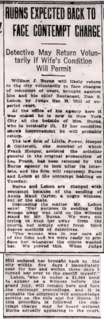 Burns and Lehon are charged with contempt because of the sending of Annie Maud Carter, a Negro witness, out of the state. Discussing the matter, Mr. Lehon says, "Our purpose in sending the woman away was told on the witness stand by Mr. Burns. We were not trying to keep her away from the courts, but simply away from third degree methods of detectives. The woman was in our care all of the time and we were ready to produce her whenever the courts wanted her. We proved this. When Judge Hill ordered her brought back to the city within five days, I immediately sent for her, and within three days, I turned her over to the sheriff myself."
