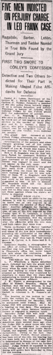 Daniel S. Lehon, lieutenant of Detective W. J. Burns in the Frank case; Carlton C. Tedder, formerly a member of the city police force, latterly engaged as a private detective; and Arthur Thurman, a lawyer of Atlanta, were indicted Friday by the Fulton grand jury for subornation of perjury. Rev. C. B. Ragsdale, a minister, who gave an affidavit to the defense that he heard one of two Negroes in an alley confess to the murder of Mary Phagan, and R. L. Barber, a stove repairer, who gave a supplementary affidavit that he recognized one of the Negroes as Jim Conley, were indicted for perjury.