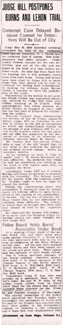 Judge Ben H. Hill postponed the trial of the contempt cases against Detective W. J. Burns and his assistant Dan S. Lehon on Saturday morning. The postponement was necessitated because Judge Arthur Powell, counsel for the two detectives, was out of the city and engaged in the trial of another case before a different court. No date has been fixed for the hearing, but it is likely to occur sometime next week. Burns and Lehon have been cited by Judge Hill to show cause why they should not be held in contempt for having been instrumental in causing the witness, Annie Maude Carter, a Negress, to leave the jurisdiction of the court.