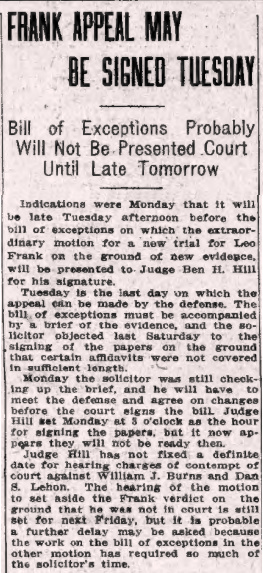 Indications were, on Monday, that it will be late Tuesday afternoon before the bill of exceptions, on which the extraordinary motion for a new trial for Leo Frank on the ground of new evidence will be based, is presented to Judge Ben H. Hill for his signature. Tuesday is the last day on which the appeal can be made by the defense. The bill of exceptions must be accompanied by a brief of the evidence, and the Solicitor objected last Saturday to the signing of the papers on the ground that certain affidavits were not covered in sufficient length. On Monday, the solicitor was still checking up on the brief, and he will have to meet the defense and agree on changes before the court signs the bill. Judge Hill set Monday at 3 o'clock as the hour for signing the papers, but it now appears they will not be ready then.