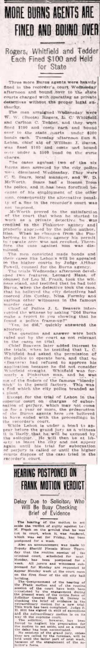 Three more Burns agents were heavily fined in the Recorder's Court Wednesday afternoon and bound over to the state courts charged with operating as private detectives without the proper legal authority. The men arraigned Wednesday were W. W. (Boots) Rogers, L. C. Whitfield, and Carlton C. Tedder, and they were fined $100 and costs each and bound over to the state courts under $200 bonds each. Tuesday afternoon Dan S. Lehon, chief aide of William J. Burns, was fined $100 and costs and bound over under a $500 bond on the same charge.