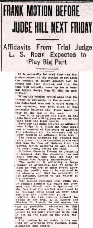 Affidavits from Trial Judge L. S. Roan are expected to play a significant role in the upcoming hearing. It is generally believed that the last postponement of the motion to set aside the verdict of guilty against Leo M. Frank has been allowed, and that the case will actually come up for a hearing before Judge Ben H. Hill on next Friday. When the motion, which asks that the verdict be set aside on the ground that the defendant was not in court when it was rendered, was first filed, it was generally believed the fight would be only on the law in the case. Now it is apparent the fight on the facts involved will be just as hot as the fight over the legal points.