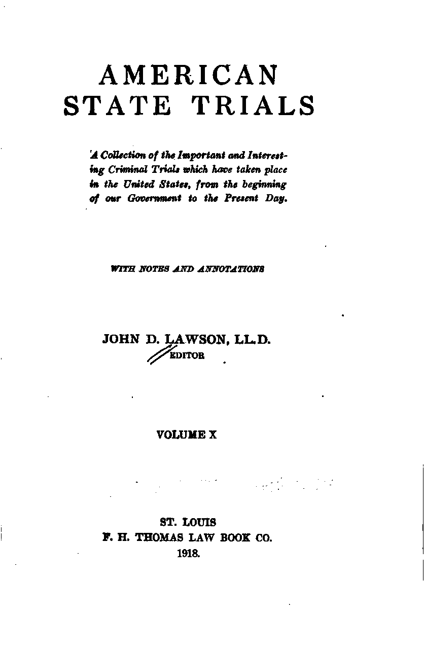 Here is the translated text as follows:AMERICAN STATE TRIALSA Collection of the Important and Interesting Criminal Trials which have taken place in the United States, from the beginning of our Government to the Present Day.WITH NOTES AND ANNOTATIONSJOHN D. LAWSON, LL.D.*Editor*VOLUME XST. LOUIS*F. H. THOMAS LAW BOOK CO.**1918*---