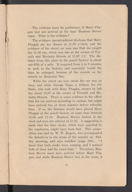 While the streetcar men swear the car was on time, and while George Epps, a witness for the State who rode with Mary Phagan, swears he left her about 12:07 at the corner of Forsyth and Marietta Streets, there is some evidence to the effect that the car arrived according to custom but might have arrived two or three minutes before schedule time. If so, the distance would have placed Mary Phagan at the pencil factory at some time between 12:05 and 12:10. Monteen Stover looked at the clock and says she entered at 12:05. A suggestion is made that the time clocks, which were punched by the employees, might have been fast. This proposition was met by W. W. Rogers, who accompanied the detectives to the scene of the murder on Sunday morning and who testified: "I know that both clocks were running, and I noticed both of them had the exact time." Therefore, Monteen Stover must have arrived before Mary Phagan, and while Monteen Stover was in the room, it