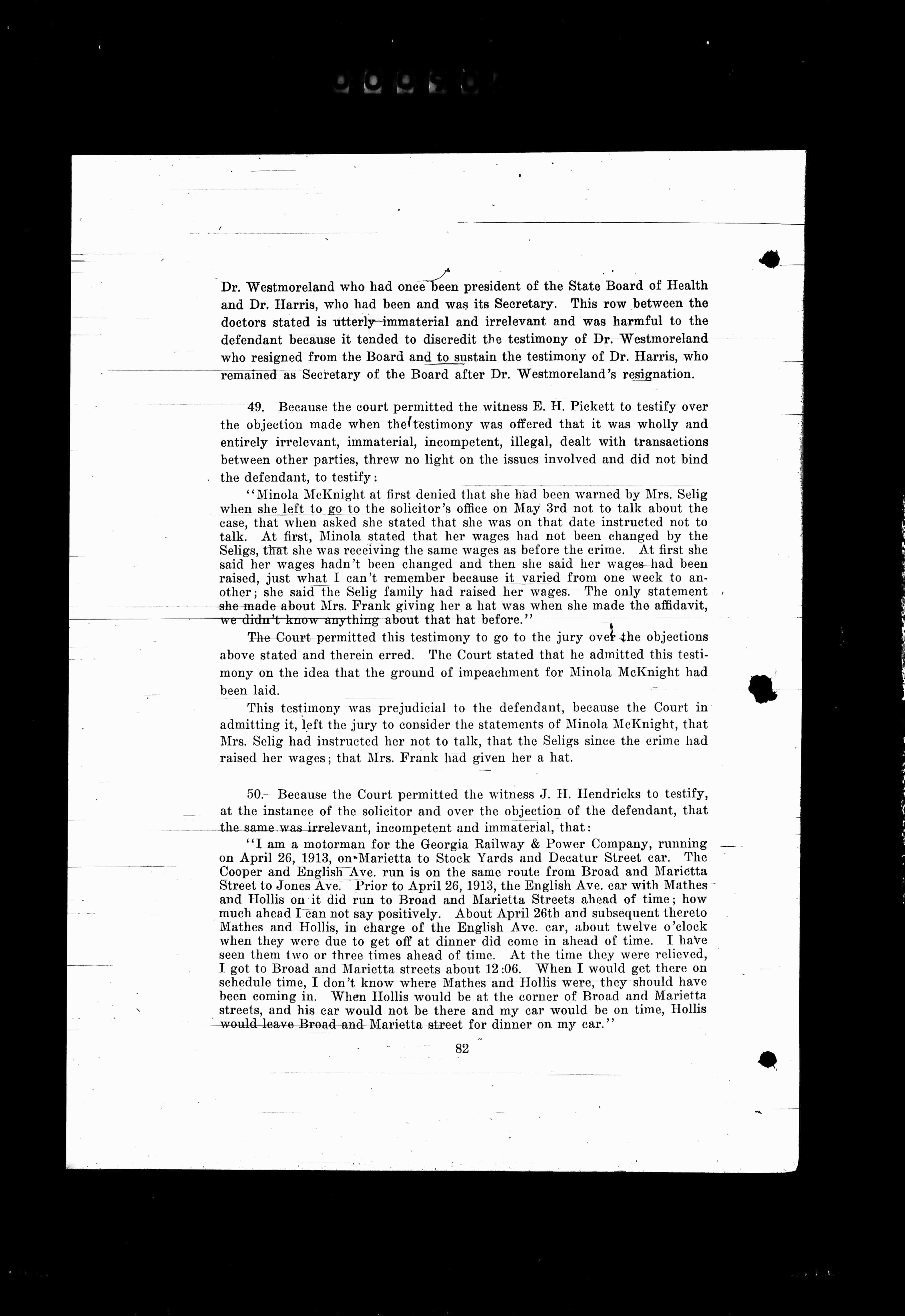 "Minola McKnight at first denied that she had been warned by Mrs. Selig when she left to go to the solicitor's office on May 3rd not to talk about the case, that when asked she stated that she was on that date instructed not to talk. At first, Minola stated that her wages had not been changed by the Seligs, that she was receiving the same wages as before the crime. At first she said her wages hadn't been changed and then she said her wages had been raised, just what I can't remember because it varied from one week to another; she said the Selig family had raised her wages. The only statement she made about Mrs. Frank giving her a hat was when she made the affidavit, we didn't know anything about that before."