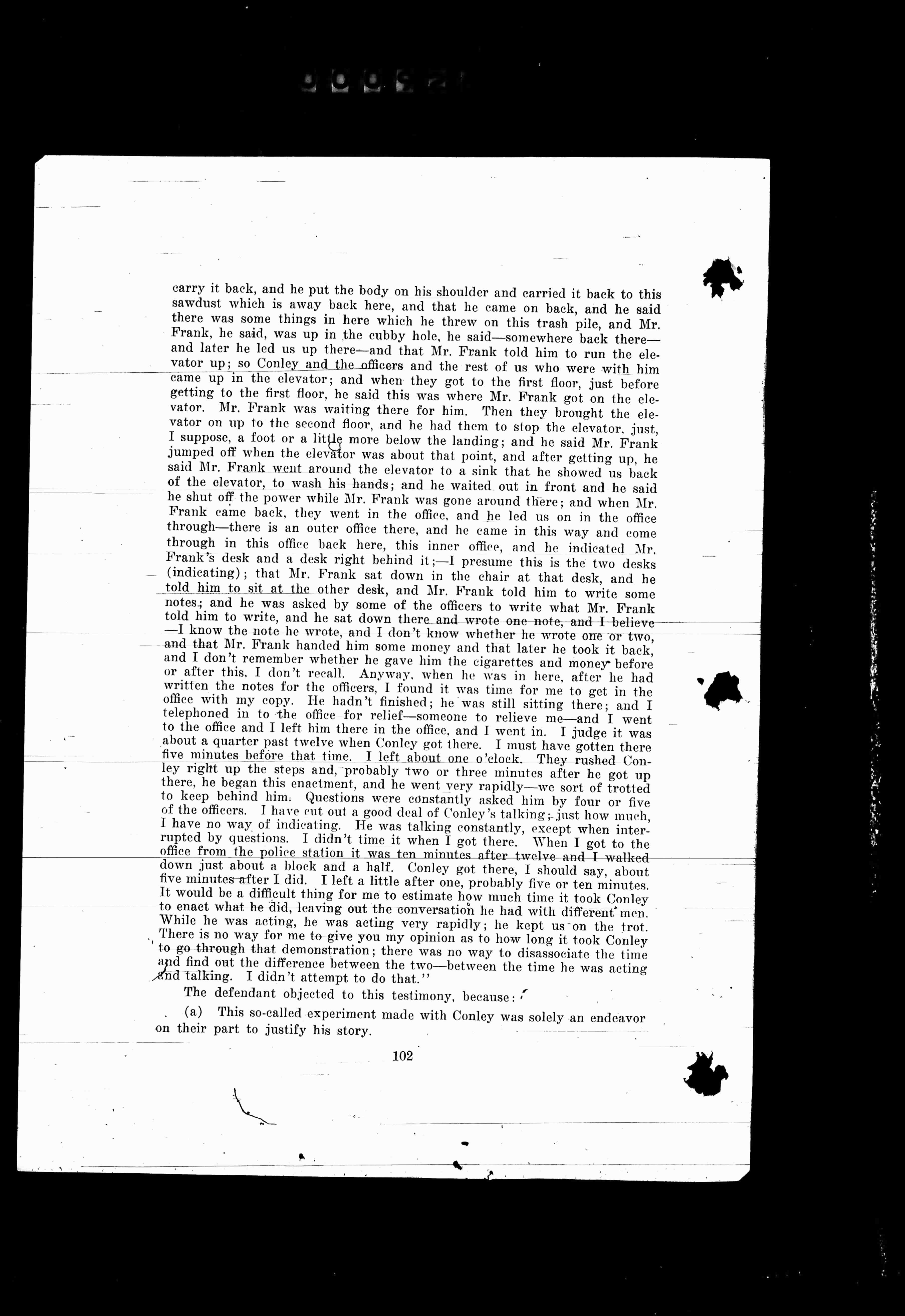 carry it back, and he put the body on his shoulder and carried it back to this sawdust which is away back here, and that he came on back, and he said there was some things in here which he threw on this trash pile, and Mr. Frank, he said, was up in the cubby hole, he came out somewhere back there— and later he led us up there—and that Mr. Frank told him to run the elevator up; so Conley and the officers and Mr. Frank got us who were with him came up in the elevator, and when they got to the first floor, just before getting to the first floor, he said this was where Mr. Frank got on the elevator. Mr. Frank was waiting there for him. Then they brought the elevator on up to the second floor, and he had them to stop the elevator, just, I suppose, a foot or a little more below the landing; and he said Mr. Frank jumped off when the elevator was about that point, and after getting up, he said Mr. Frank went around the elevator to a sink that he showed us back of the elevator, to wash his hands; and he waited out in front and he said he shut off the power while Mr. Frank was gone around there; and when Mr. Frank came back, they went in the office, and he led us on in the office through—there is an outer office there, and he came in this way and come through in this office back here, this inner office, and he indicated Mr. Frank's desk and a desk right behind it;—I presume this is the two desks (indicating); that Mr. Frank sat down in the chair at that desk, and he told him to sit at the other desk, and Mr. Frank told him to write some notes; and he wrote, and he asked by some of the officers to write what Mr. Frank —I know the note, and he sat down there and wrote one note—and I believe and that Mr. Frank watched him some time and that later he took it back, and I don't remember whether he gave him the cigarettes and money before or after this, I don't know. Anyway, when he was in here, after he had written the notes for the first time, he had him to write them over, and he wrote them over with my copy. He hadn't found it was time for me to get in the telephone in the office for relief; he was still sitting there; and I to the office and I left him there in those offices to relieve me—and I went about a quarter past twelve when Conley got there I went in. I judge it was five minutes before that time. I left about one. I must have gotten there right up the steps and, probably two or three o'clock. They rushed Conley there, he began this enactment, and he went very cautiously after he got up to keep behind him. Questions were constantly asked—we sort of trotted of the officers, I have cut out a good deal of Conley's testimony by four or five I have no way of indicating. He was talking and walking. Just how much, rupted by questions. I didn't time when I got out there, except when interrupted from the police station it was ten minutes after, when I got to the down just about a block and a half. Conley got there, I should say—walked five minutes after I did. I left a little after one, probably five or ten minutes. It would be difficult thing for me to estimate how much time it took Conley to enact what he did, leaving out the conversation, he had with different men. While he was acting, he was acting very rapidly; he kept us on the trot. There is no way for me to give you my opinion as to how long it took the trot. to go through that demonstration; there was no way to disassociate the time and find out the difference between the two—between the time he was acting and talking. I didn't attempt to do that."