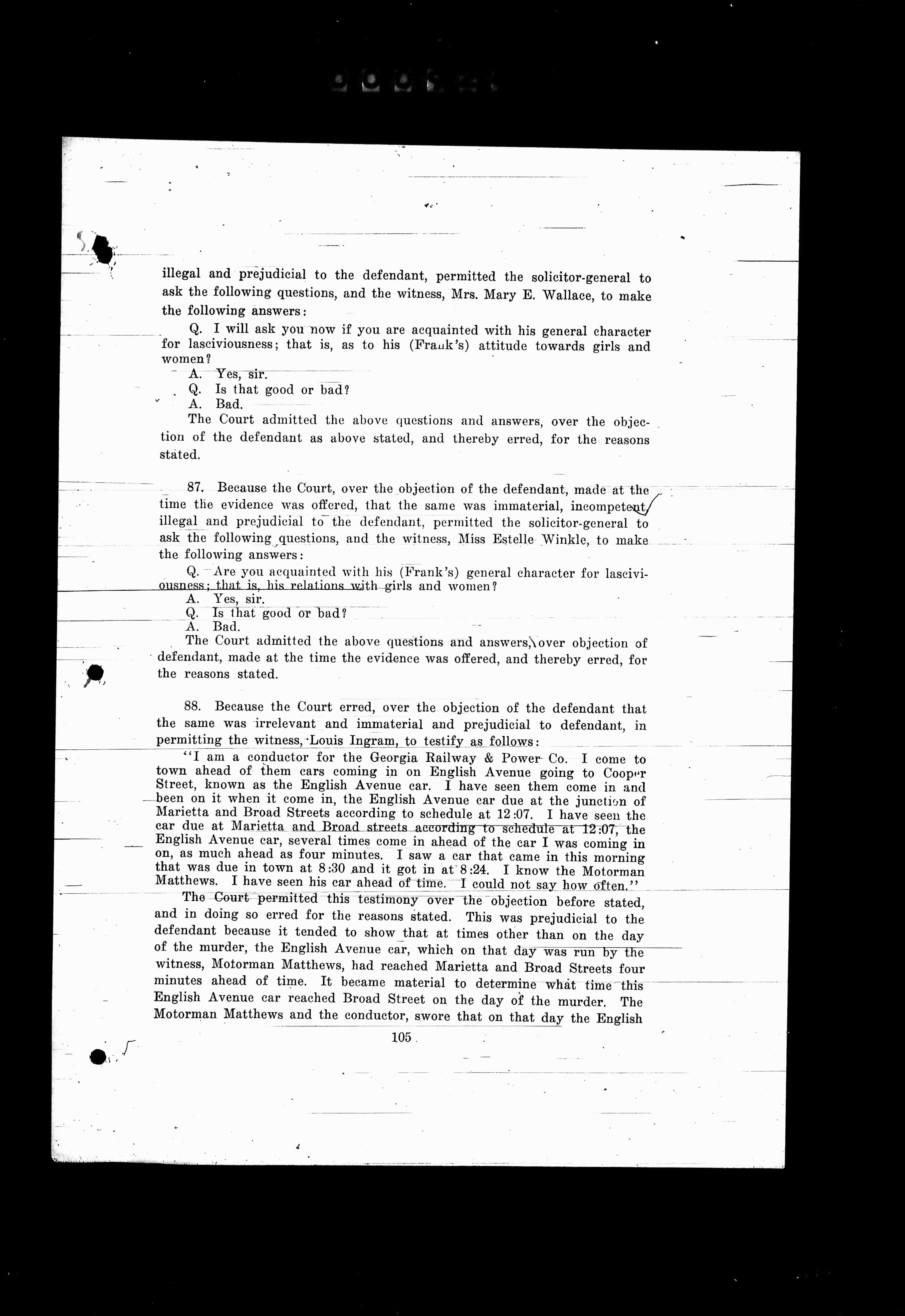 87. Because the Court, over the objection of the defendant, made at the time the evidence was offered, that the same was immaterial, incompetent, illegal and prejudicial to the defendant, permitted the solicitor-general to ask the following questions, and the witness, Miss Estelle Winkle, to make the following answers: