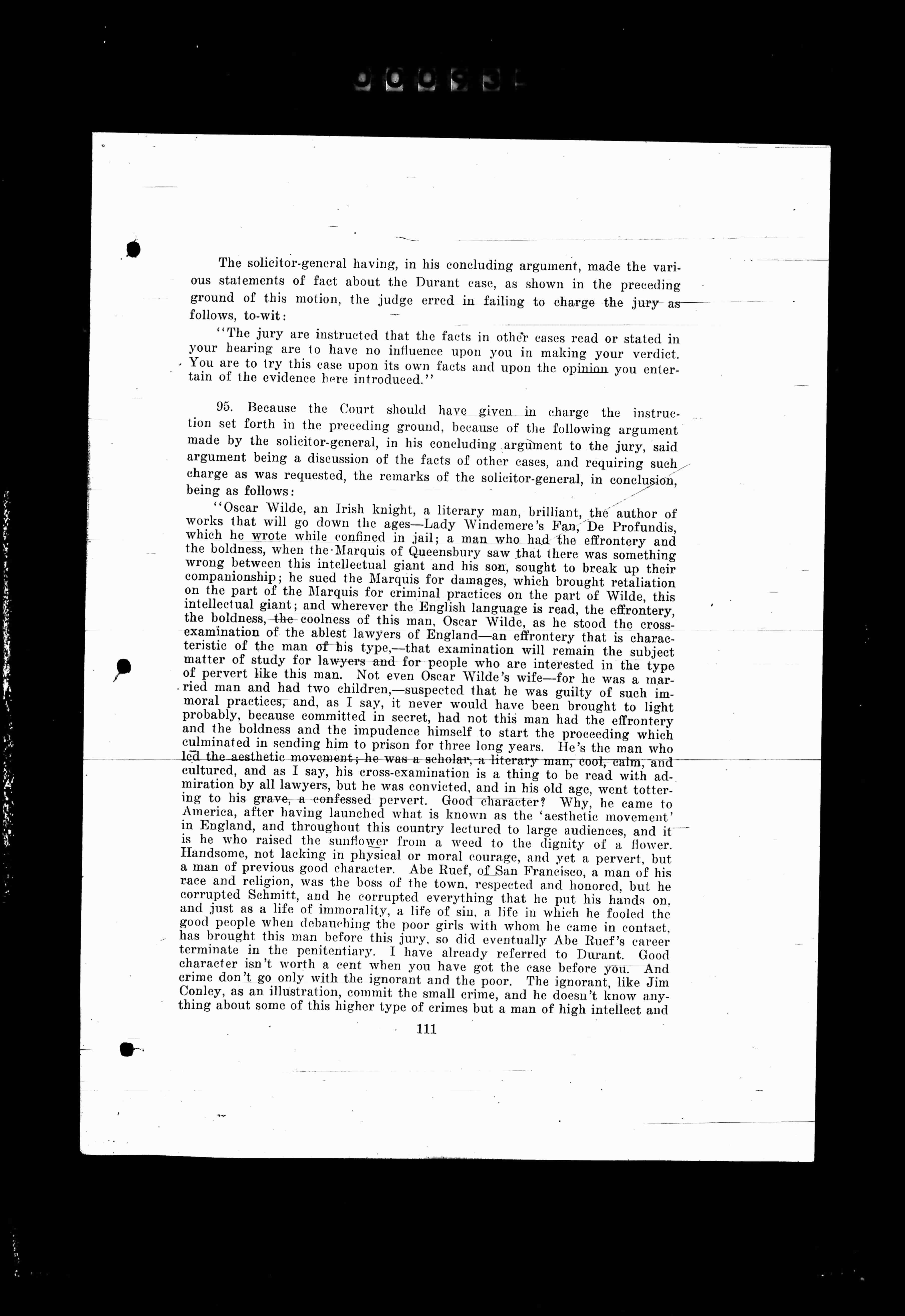 “Oscar Wilde, an Irish knight, a literary man, brilliant, the author of works that will go down the ages—Lord Windemere’s Fan, De Profundis, which he wrote while confined in jail—a man who had the effrontery and the boldness, when the Marquis of Queensbury saw that tire was something wrong between this intellectual giant and his son, sought to break up their companionship; he sued the Marquis for damages, which brought retaliation on the part of the Marquis for criminal practices on the part of Wilde, this intellectual giant; and wherever the English language is read, the vilest, the boldest, the coolest of this man, Oscar Wilde, as he stood the crossexamination of the ablest lawyers of England—an effrontery that is characteristic of the man of his type—that examination will remain the subject matter of study for lawyers and for people who are interested in the type of pervert like this man.