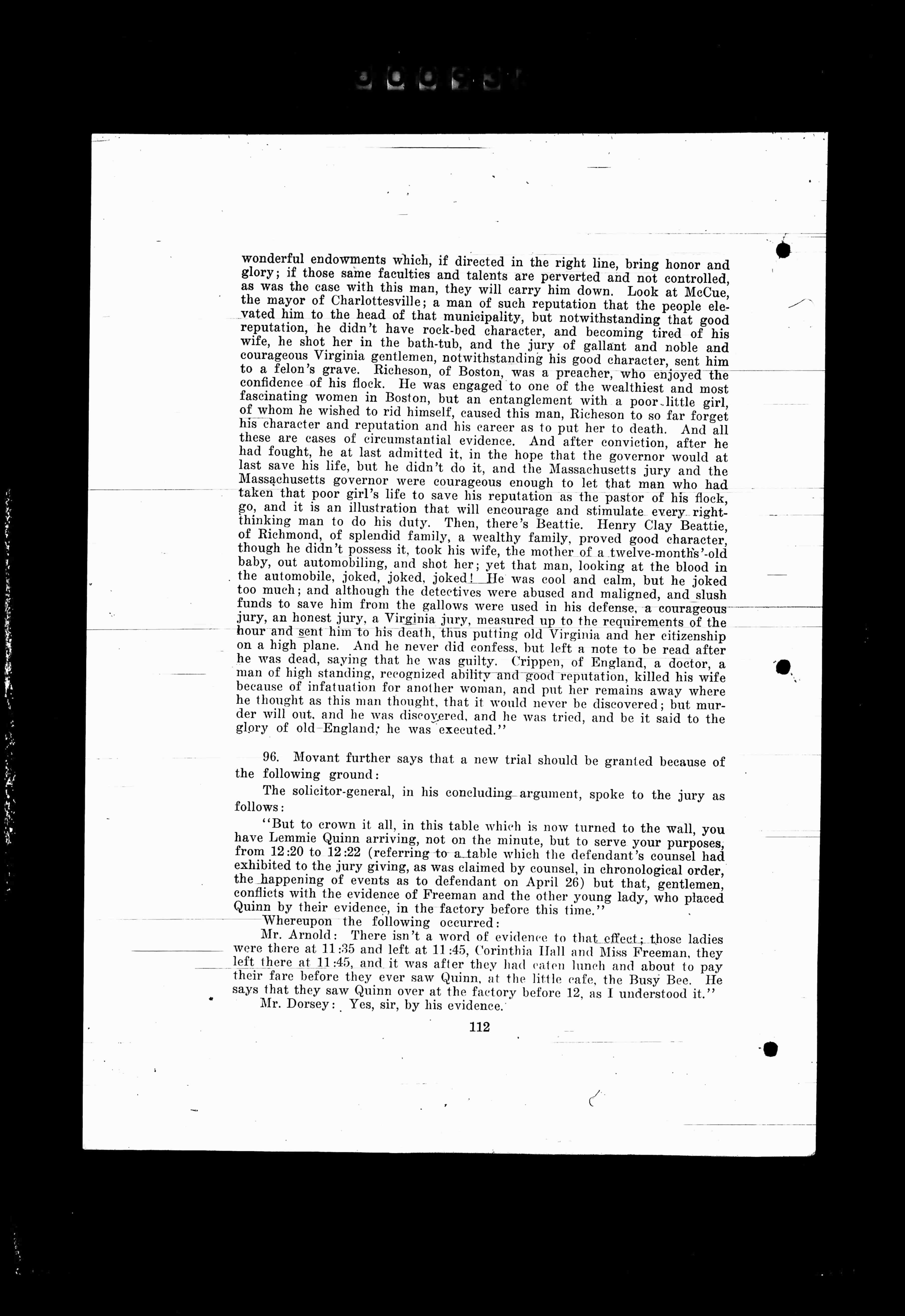 wonderful endowments which, if directed in the right line, bring honor and glory; if those same faculties and talents are perverted and not controlled, as was the case with this man, they will carry him down. Look at McCue, the mayor of Charlottesville, a man of such reputation that the people ele- vated him to the head of that municipality, but notwithstanding that good reputation, he didn't have rock-ribbed character, and becoming tired of his wife, he shot her in the bath-tub, and the jury of gallant and noble and courageous Virginia gentlemen, noting the shining of his good character, sent him to a felon's grave. Richeson, of Boston, was a preacher, who enjoyed the confidence of his flock. He was engaged to one of the wealthiest and most fascinating women in Boston, but an entanglement with a poor little girl, of whom he wished to rid himself, caused this man, Richeson, to so far forget his character and reputation and his career as to put her to death. And all these are cases of circumstantial evidence. And after conviction, after he had fought, he at last admitted it, in the hope that the governor would at last save his life, but he didn't do it, and the Massachusetts jury and the Massachusetts governor were courageous enough to let that man who had taken that poor girl's life to save his reputation as the pastor of his flock, go, and it is an illustration that will encourage and stimulate every right- thinking man to do his duty. Then, there's Beattie. Henry Clay Beattie, of Richmond, of splendid family, wealthy family, proved good character, though he didn't possess it, took his wife, the mother of a twelve-months'-old baby, out automobileing, and shot her; yet that man, looking at the blood in the automobile, joked, joked, joked! He was cool and calm, but he joked too much; and although the detectives were abused and maligned, and slush funds to save him from the gallows were used in his defense, a courageous jury, an honest jury, a Virginia jury, measured up to the requirements of the law, and sent him to his death, thus putting old Virginia and her citizenship on high plane. And he never did confess, but left a note to be read after he was dead, saying that he was guilty. Crippen, of England, a doctor, a man of high standing, recognized ability and good reputation, killed his wife because of infatuation for another woman, and put her remains away where he thought as this man thought, it would never be discovered; but mur- der will out, and he was discovered, and he was tried, and he said to the glory of old England; he was executed."