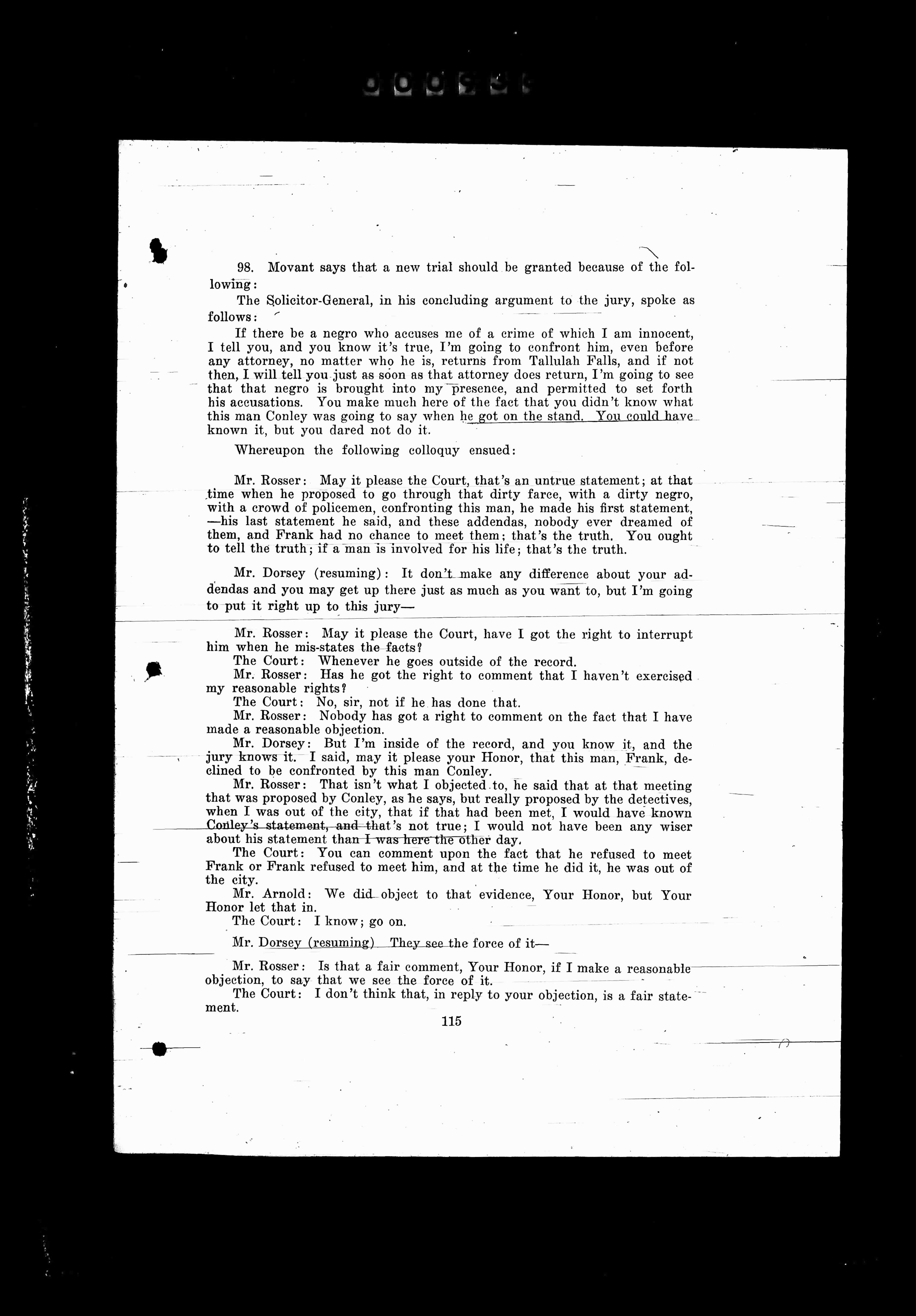 If there be a negro who accuses me of a crime of which I am innocent, I tell you, and you know it's true, I'm going to confront him, even before any attorney, no matter who he is, returns from Tallulah Falls, and if not then, I will tell you just as soon as that attorney does return, I'm going to see that that negro is brought into my presence, and permitted to set forth his accusations. You make much here of the fact that you didn't know what this man Conley was going to say when he got on the stand. You could have known it, but you dared not do it.