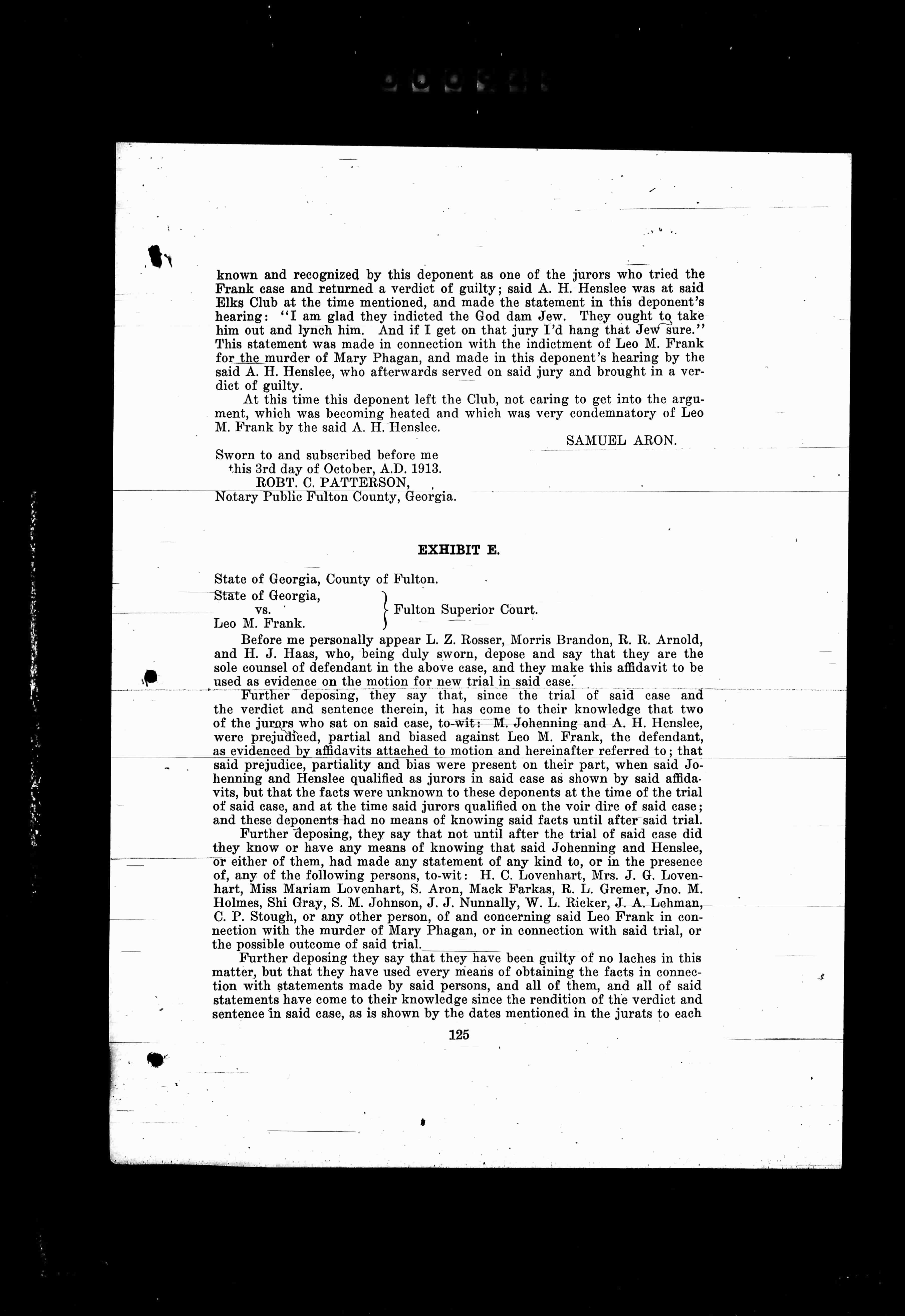 known and recognized by this deponent as one of the jurors who tried the Frank case and returned a verdict of guilty; said A. H. Henslee was at said Elks Club at the time mentioned, and made the statement in this deponent's hearing: "I am glad they indicted the God dam Jew. They ought to take him out and lynch him. And if I get on that jury I'd hang that Jew sure." This statement was made in connection with the indictment of Leo M. Frank for the murder of Mary Phagan, and made in this deponent's hearing by the said A. H. Henslee, who afterwards served on said jury and brought in a verdict of guilty.