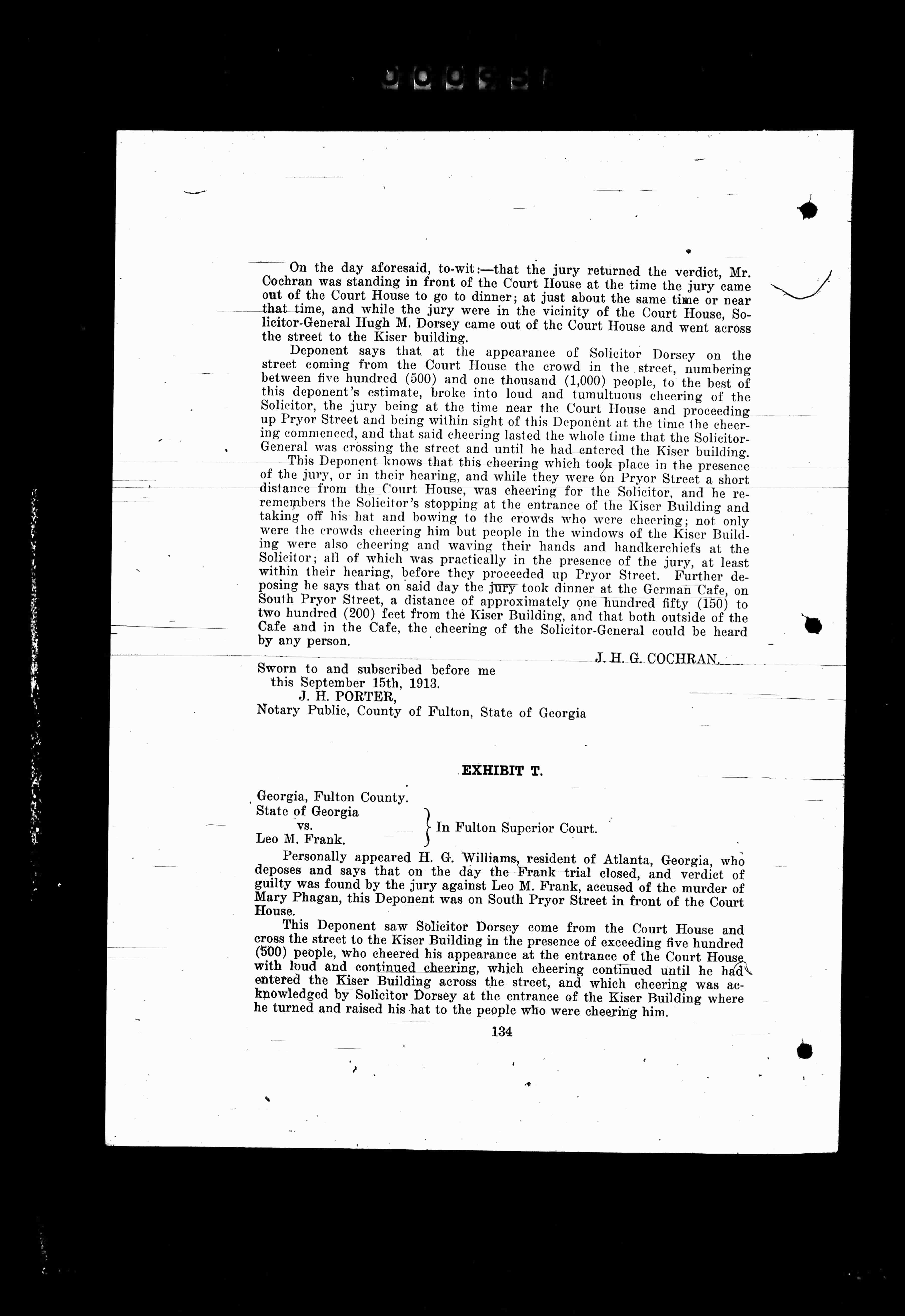 Personally appeared H. G. Williams, resident of Atlanta, Georgia, who deposes and says that on the day the Frank trial closed, and verdict of guilty was found by the jury against Leo M. Frank, accused of the murder of Mary Phagan, this Deponent was on South Pryor Street in front of the Court House.