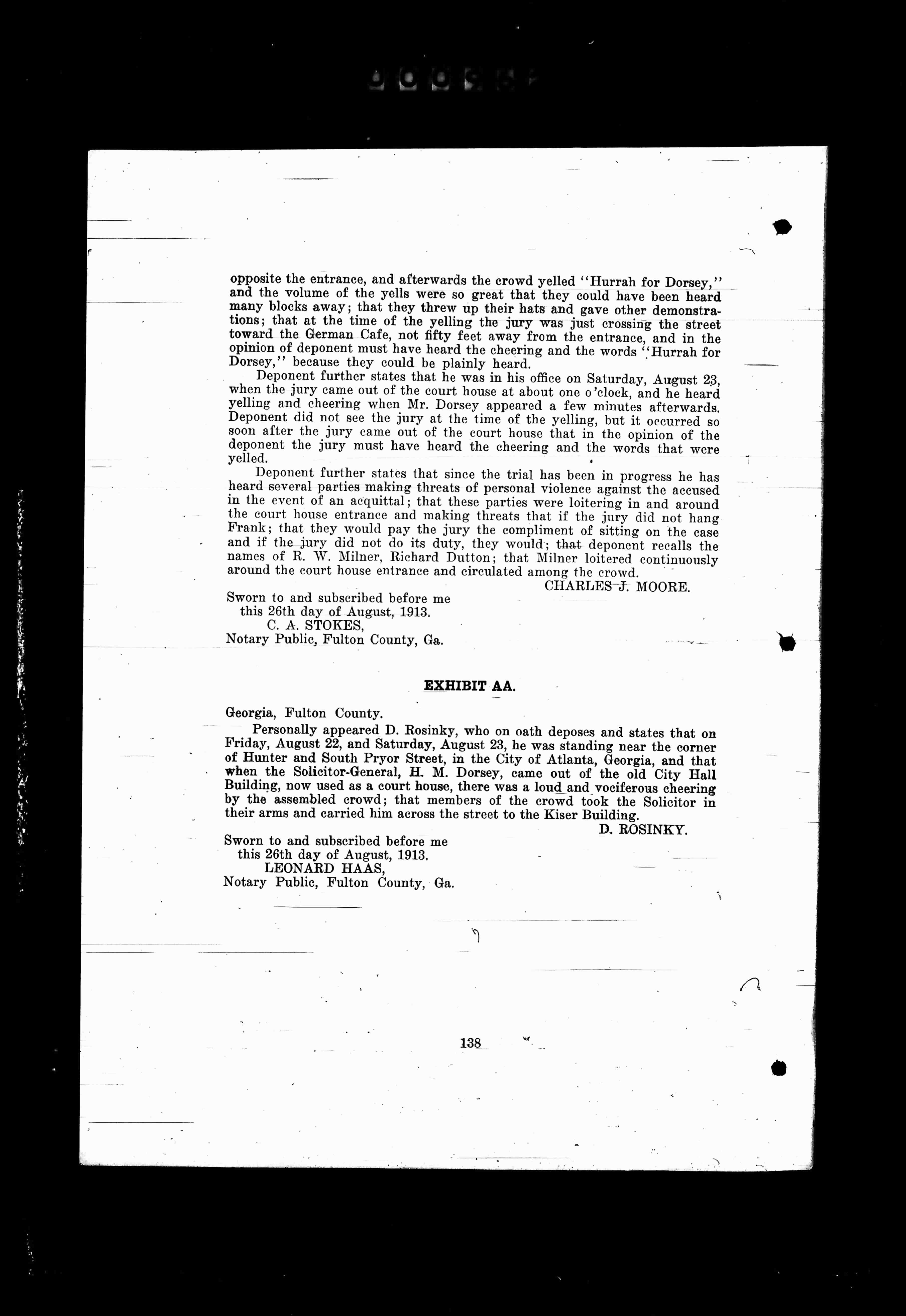 Personally appeared D. Roosinky, who on oath deposes and states that on Friday, August 22, and Saturday, August 23, he was standing near the corner of Hunter and South Pryor Street, in the City of Atlanta, Georgia, and that when the Solicitor-General, H. M. Dorsey, came out of the old City Hall Building, now used as a court house, there was a loud and vociferous cheering by the assembled crowd; that members of the crowd took the Solicitor in their arms and carried him across the street to the Riser Building.