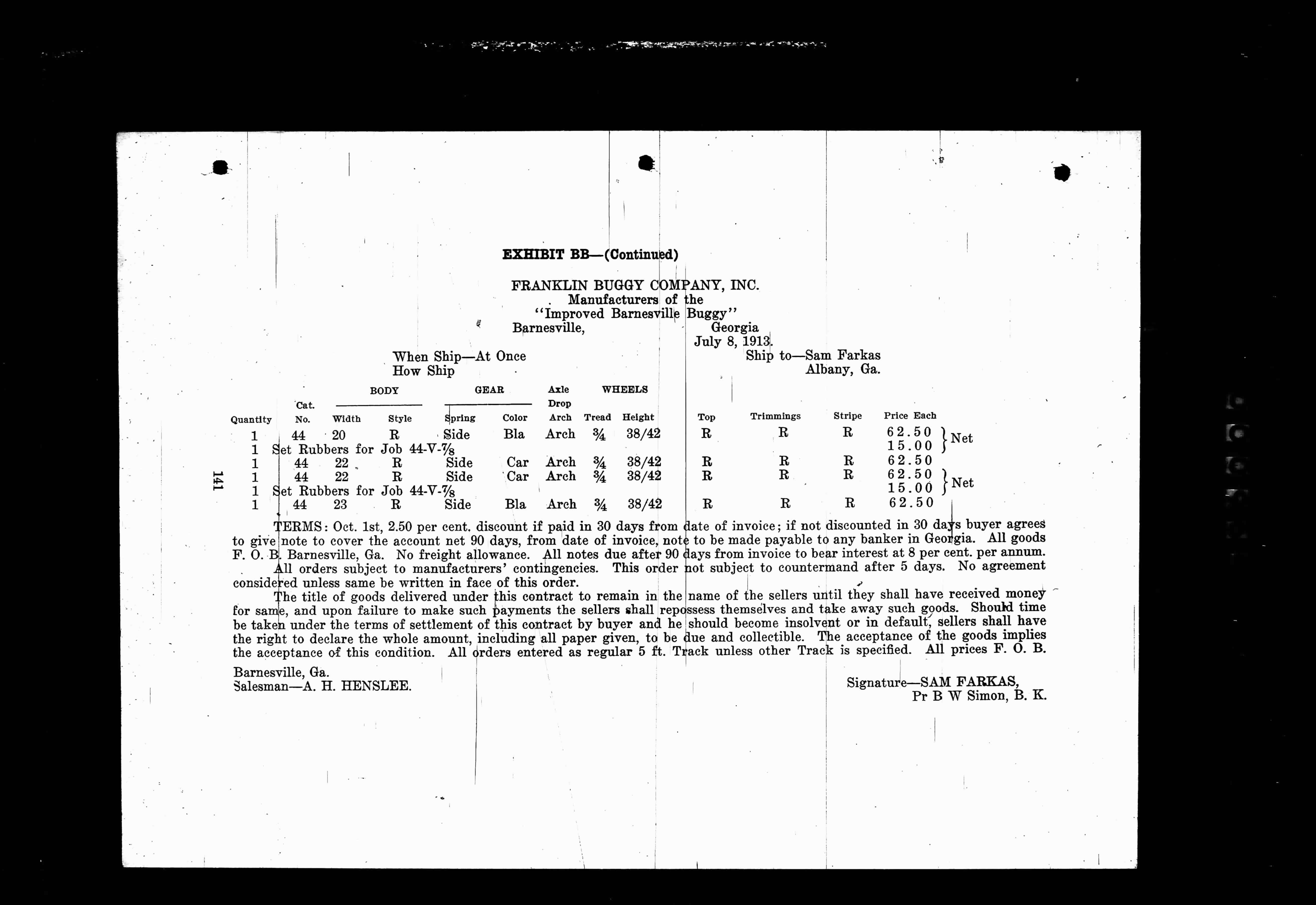 Salesman—A. H. HENSLEE. Signature—SAM FARKAS,