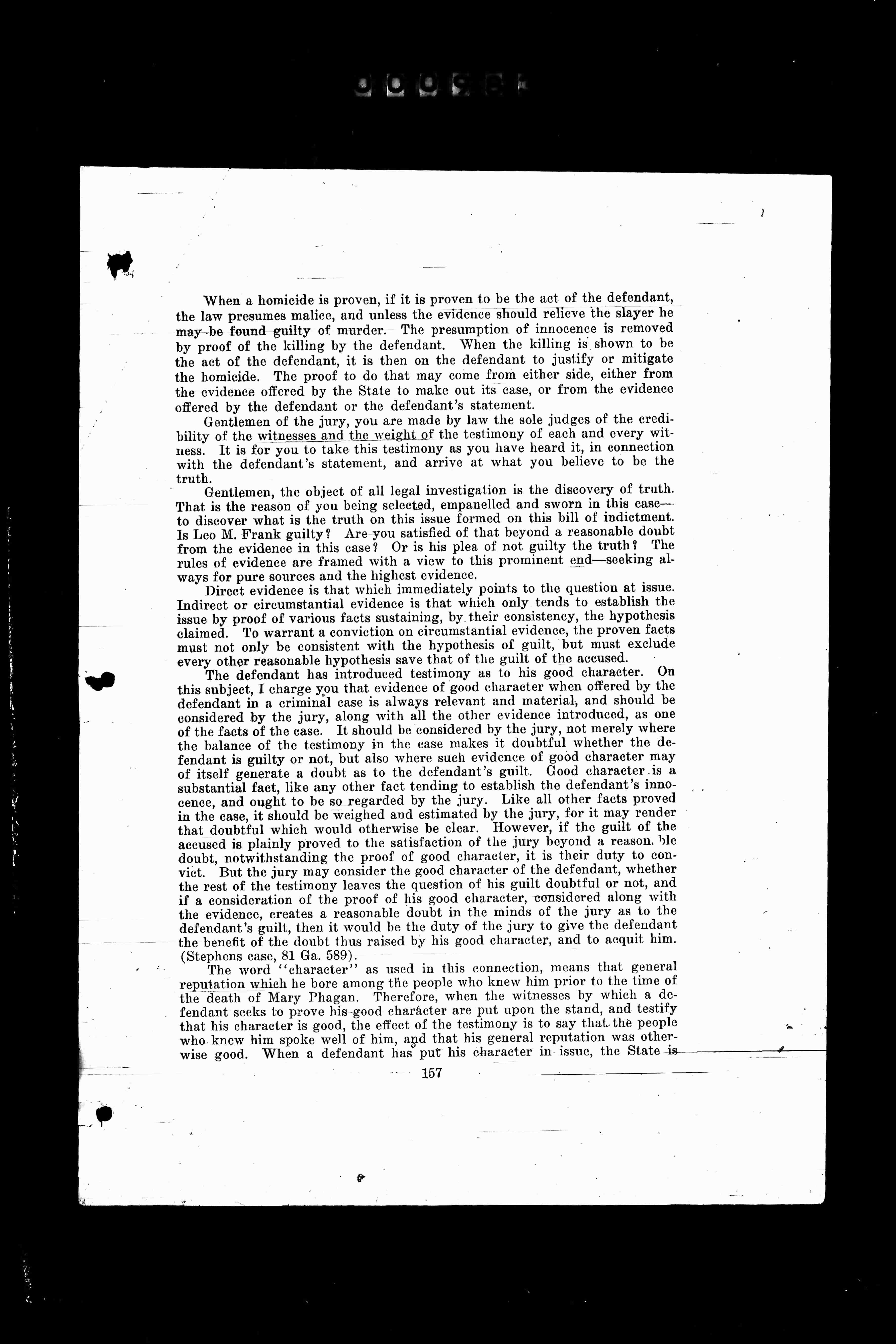 Gentlemen, the object of all legal investigation is the discovery of truth. That is the reason of you being selected and sworn in this case--to discover what is the truth on this issue formed on this bill of indictment. Is Leo M. Frank guilty? Are you satisfied that beyond a reasonable doubt from the evidence in this case? Or is his plea of not guilty the truth? The rules of evidence are framed with a view to this prominent end--seeking always for pure sources and the highest evidence.