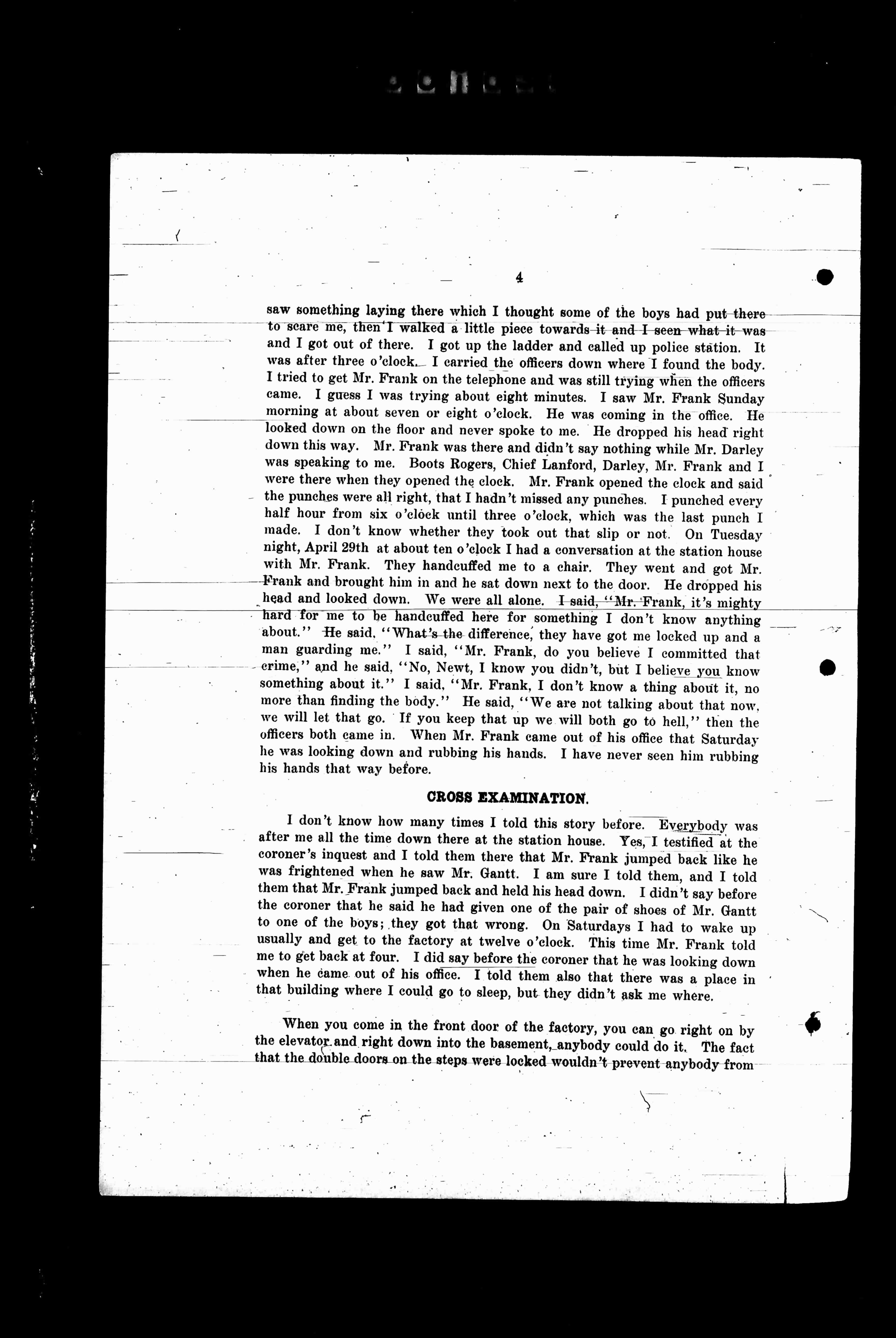saw something laying there which I thought some of the boys had put there to scare me, then I walked a little piece towards it and I seen what it was and I got out of there. I got the ladder and called up police station. It was after three o'clock. I carried the officers down where I found the body. I tried to get Mr. Frank on the telephone and was still trying when the officers came. I guess I was trying about eight minutes. I saw Mr. Frank Sunday morning at about seven or eight o'clock. He was coming in the office. He looked down on the floor and never spoke to me. He dropped his head right down this way. Mr. Frank was there and didn't say nothing while Mr. Darley was speaking to me. Boots Rogers, Chief Lanford, Darley, Mr. Frank and I were there when they opened the clock. Mr. Frank opened the clock and said the punches were all right, that I hadn't missed any punches. I punched every half hour from six o'clock until three o'clock, which was the last punch I made. I don't know whether they took out that slip or not. On Tuesday night, April 29th at about ten o'clock I had a conversation at the station house with Mr. Frank. They handcuffed me to a chair. They went and got Mr. Frank and brought him in and he sat down next to the door. He dropped his head and looked down. We were all alone. I said, "Mr. Frank, it's mighty hard for me to be handcuffed here for something I don't know anything about." He said, "What's the difference, they have got me locked up and a man guarding me." I said, "Mr. Frank, do you believe I committed that crime," and he said, "No, Newt, I know you didn't, but I believe you know something about it." I said, "Mr. Frank, I don't know a thing about it, no more than finding the body." He said, "We are not talking about that now, we will let that go. If you keep that up we will both go to hell," then the officers both came in. When Mr. Frank came out of his office that Saturday he was looking down and rubbing his hands. I have never seen him rubbing his hands that way before.