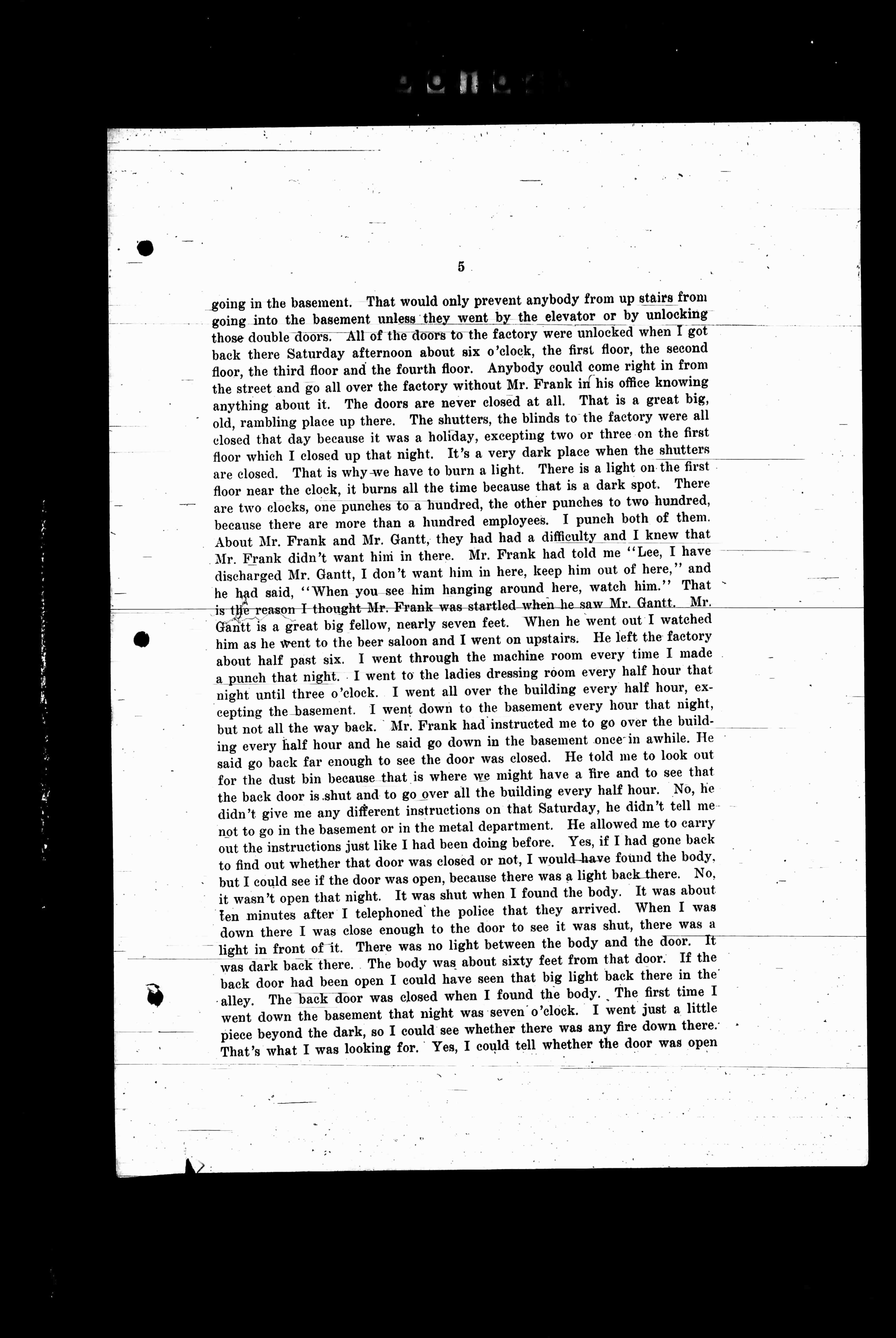 going in the basement. That would only prevent anybody from up stairs from going into the basement unless they went by the elevator or by unlocking those double doors. All of the doors to the factory were unlocked when I got back there Saturday afternoon about six o'clock, the first floor, the second floor, the third floor and the fourth floor. Anybody could come right in from the street and go all over the factory without Mr. Frank in his office knowing anything about it. The doors are never closed at all. That is a great big, old, rambling place up there. The shutters, the blinds to the factory were all closed that day because it was a holiday, excepting two or three on the first floor which I closed up that night. It's a very dark place when the shutters are closed. That is why we have to burn a light. There is a light on the first floor near the clock, it burns all the time because that is a dark spot. There are two clocks, one punches to a hundred, the other punches to two hundred, because there are more than a hundred employees. I punch both of them. About Mr. Frank and Mr. Gantt, they had had a difficulty and I knew that Mr. Frank didn't want him in there. Mr. Frank had told me "Lee, I have discharged Mr. Gantt, I don't want him in here, keep him out of here," and he had said, "When you see him hanging around here, watch him." That is the reason I thought Mr. Frank was startled when he saw Mr. Gantt. Mr. Gantt is a great big fellow, nearly seven feet. When he went out I watched him as he went to the beer saloon and I went upstairs. He left the factory about half past six. I went through the machine room every time I made a punch that night. I went to the ladies' dressing room every half hour that night until three o'clock. I went all over the building every half hour, excepting the basement. I went down to the basement every hour that night, but not all the way back. Mr. Frank had instructed me to go over the building every half hour and he said go down in the basement once in awhile. He said go back far enough to see the door was closed. He told me to look out for the dust bin because that is where we might have a fire and to see that the back door is shut and to go over all the building every half hour. No, he didn't give me any different instructions that Saturday, he didn't tell me not to go in the basement or in the metal department. He allowed me to carry out the instructions just like I had been doing before. Yes, if I had gone back to find out whether that door was closed or not, I would have found the body, but I could see if the door was open, because there was a light back there. No, it wasn't open that night. It was shut when I found the body. It was about ten minutes after I telephoned the police that they arrived. When I was down there I was close enough to the door to see it was shut, there was a light in front of it. There was no light between the body and the door. It was dark back there. The body was about sixty feet from that door. If the back door had been open I could have seen that big light back there in the alley. The back door was closed when I found the body. The first time I went down the basement that night was seven o'clock. I went just a little piece beyond the dark, so I could see whether there was any fire down there. That's what I was looking for. Yes, I could tell whether the door was open