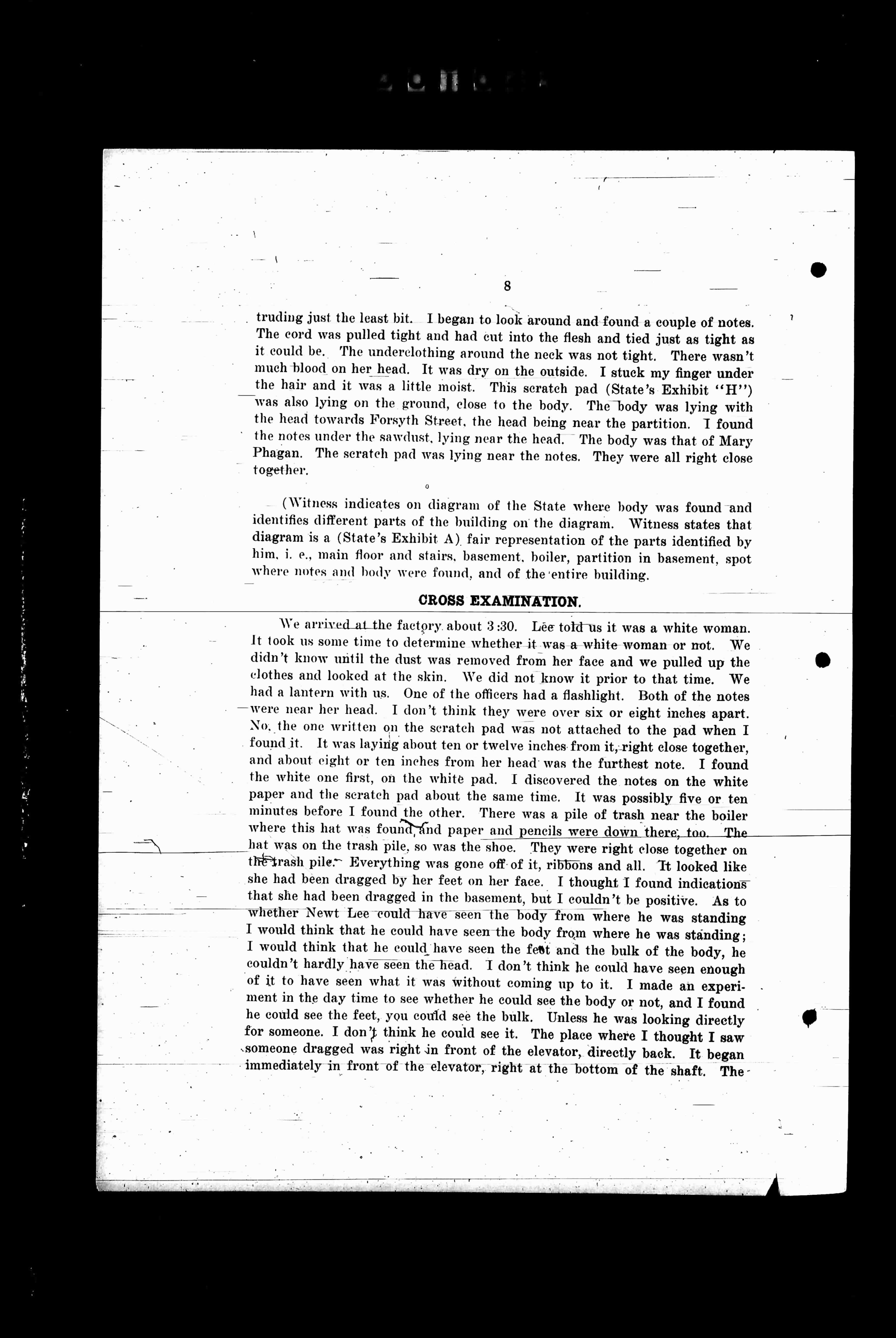 We arrived at the factory about 3:30. Lee told us it was a white woman. It took us some time to determine whether it was a white woman or not. We didn't know until the dust was removed from her face and we pulled up the clothes and looked at the skin. We did not know it prior to that time. We had a lantern with us. One of the officers had a flashlight. Both of the notes were near her head. I don't think they were over six or eight inches apart. No, the one written on the scratch pad was not attached to the pad when I found it. It was laying about ten or twelve inches from it, right close together, and about eight or ten inches from her head was the furthest note. I found the white one first, on the white pad. I discovered the notes on the white paper and the scratch pad about the same time. It was possibly five or ten minutes before I found the other one. There was a pile of trash near the boiler where this hat was found, and paper and pencils were down there, too. The hat was on the trash pile, so was the shoe. They were right close together on the trash pile. Everything was gone off of it, ribbons and all. It looked like she had been dragged by her feet on her face, I thought I found indications that she had been dragged in the basement, but I couldn't be positive. As to whether Newt Lee could have seen the body from where he was standing, I would think that he could have seen the body from where he was standing; I would think that he could have seen the feet and the bulk of the body, he couldn't hardly have seen the head. I don't think he could have seen enough of it to have seen what it was without coming up to it. I made an experiment in the day time to see whether he could see the body or not, and I found he could see the feet, you could see the bulk. Unless he was looking directly for someone, I don't think he could see it. The place where I thought I saw someone dragged was right in front of the elevator, directly back. It began immediately in front of the elevator, right at the bottom of the shaft. The