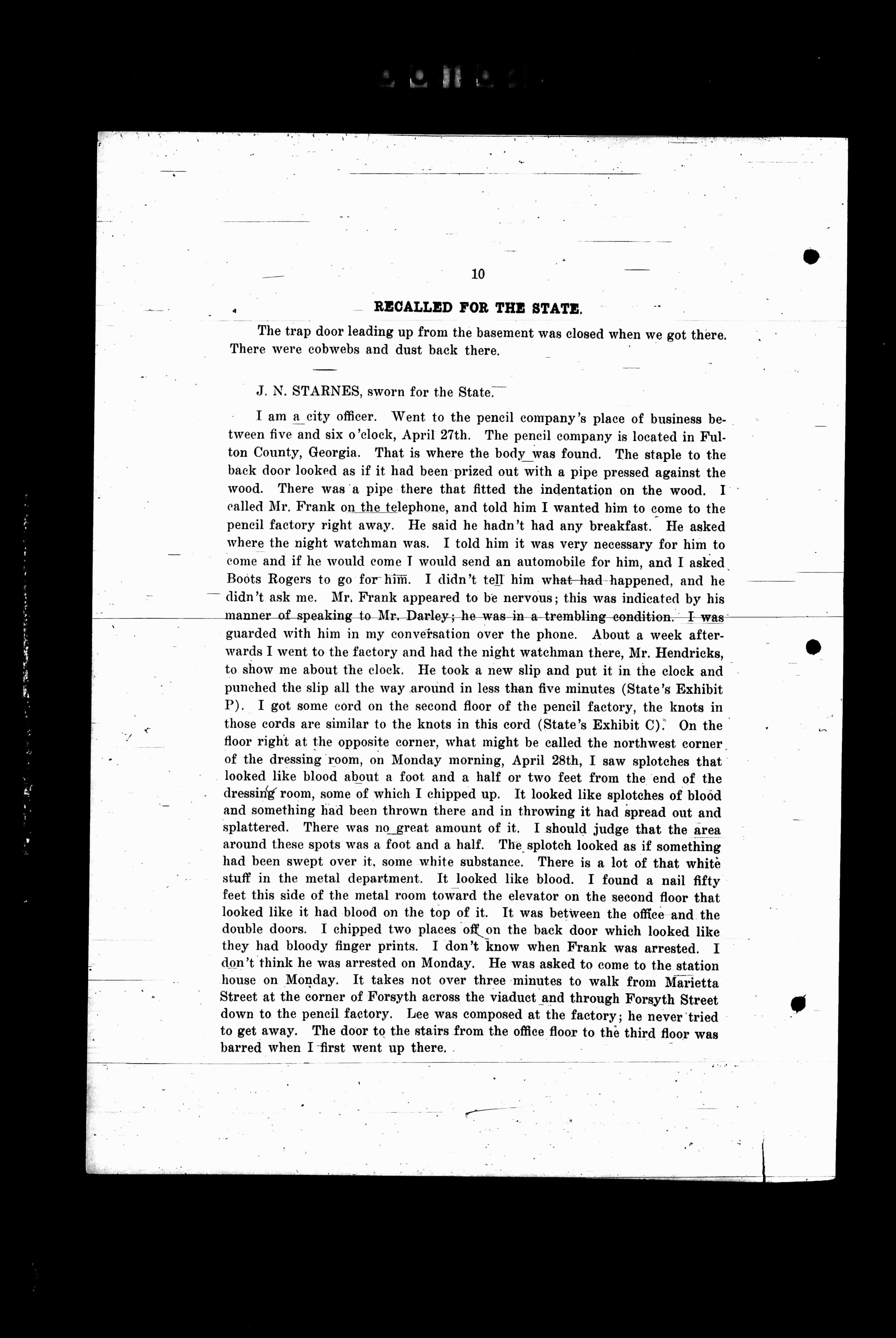 I am a city officer. Went to the pencil company’s place of business between five and six o’clock, April 27th. The pencil company is located in Fulton County, Georgia. That is where the body was found. The staple to the back door looked as if it had been prized out with a pipe pressed against the wood. There was a pipe there that fitted the indentation on the wood. I called Mr. Frank on the telephone, and told him I wanted him to come to the pencil factory right away. He said he hadn’t had any breakfast. He asked where the night watchman was. I told him it was very necessary for him to come and if he would come I would send an automobile for him, and I asked Boots Rogers to go for him. I didn’t tell him what had happened, and he didn’t ask me. Mr. Frank appeared to be nervous; this was indicated by his manner of speaking to Mr. Darley; he was in a trembling condition. I was guarded with him in my conversation over the phone. About a week afterwards I went to the factory and had the night watchman there, Mr. Hendricks, to show me about the clock. He took a new slip and put it in the clock and punched the slip all the way around in less than five minutes (State’s Exhibit P). I got some cord on the second floor of the pencil factory, the knots in those cords are similar to the knots in this cord (State’s Exhibit C). On the floor right at the opposite corner, what might be called the northwest corner of the dressing room, on Monday morning, April 28th, I saw splotches that looked like blood about a foot and a half or two feet from the end of the dressing room, some of which I chipped off. It looked like splotches of blood and something had been thrown there and in throwing it had spread out and splattered. There was no great amount of it. I should judge that the area around these spots was a foot and a half. The splotches looked as if something had been swept over it, some white substance. There is a lot of that white stuff in the metal department. It looked like blood. I found a nail fifty feet this side of the metal room toward the elevator on the second floor that looked like it had blood on the top of it. It was between the office and the double doors. I chipped two places off on the back door which looked like they had bloody finger prints. I don’t know when Frank was arrested. I don’t think he was arrested on Monday. He was asked to come to the station house on Monday. It takes not over three minutes to walk from Marietta Street at the corner of Forsyth across the viaduct and through Forsyth Street down to the pencil factory. Lee was composed at the factory; he never tried to get away. The door to the stairs from the office floor to the third floor was barred when I first went up there.