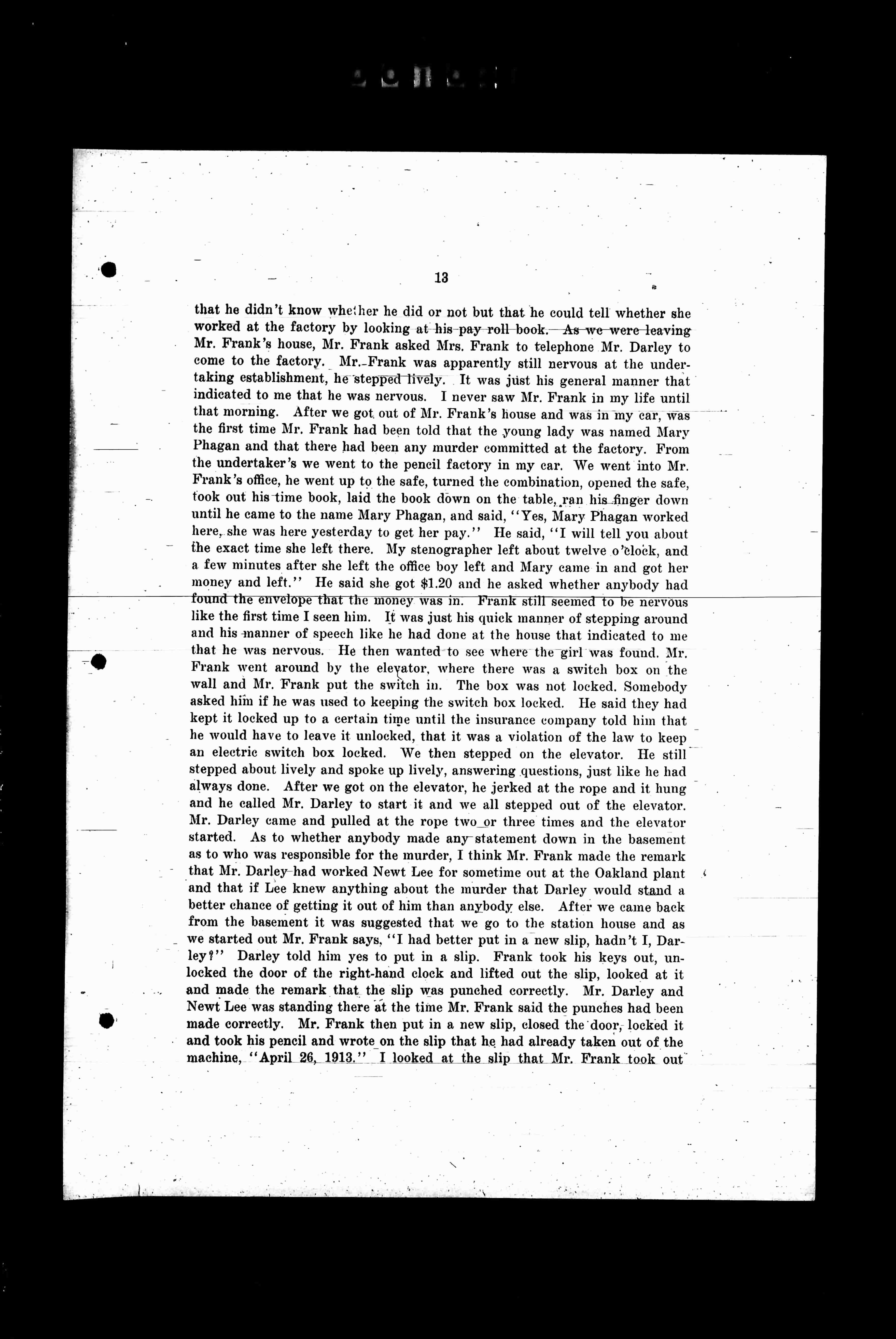 that he didn't know whether he did or not but that he could tell whether she worked at the factory by looking at his pay roll book - As we were leaving Mr. Frank's house, Mr. Frank asked Mrs. Phagan to telephone Mr. Darley to come to the factory. Mr.-Frank was apparently still nervous at the under- taking establishment, he stepped lively. He was just his general manner that indicated to me that he was nervous. I never saw Mr. Frank in my life until that morning. After we got out of Mr. Frank's house and was in my car, was the first time Mr. Frank had been told that the young lady was named Mary Phagan and that there had been any murder committed at the factory. From the undertaker's we went to the pencil factory in my car. We went into Mr. Frank's office, he went up to the safe, turned the combination, opened the safe, took out his time book, laid the book down on the table, ran his finger down until he came to the name Mary Phagan and said, "Yes, Mary Phagan worked here, she was here yesterday to get her pay." He said, "I will tell you about the exact time she left there. My stenographer left about twelve o'clock, and a few minutes after she left the office boy left and Mary came in and got her money and left." He said she got $1.20 and he asked whether anybody had found the envelope that the money was in. Frank still seemed to be nervous like the first time I seen him. It was just his quick manner of stepping around and his manner of speech like he had done at the house that indicated to me that he was nervous. He then wanted to see where the girl was found. Mr. Frank went around by the elevator, where there was a switch box on the wall and Mr. Frank put the switch in. The box was not locked. Somebody asked him if he was used to keeping the switch box locked. He said they had kept it locked up to a certain time until the insurance company told him that he would have to leave it unlocked, that it was a violation of the law to keep an electric switch box locked. We then stepped on the elevator. He still stepped about lively and spoke up lively, answering questions, just like he had always done. After we got on the elevator, I jerked at the rope and it hung and he called Mr. Darley to start it and we stepped out of the elevator. Mr. Darley came and pulled at the rope two or three times and the elevator started. As to whether anybody made any statement down in the basement as to who was responsible for the murder, I think Mr. Frank made the remark that Mr. Darley had worked Newt Lee for sometime out at the Oakland plant and that if Lee knew anything about the murder that Darley would stand a better chance of getting it out of him than anybody else. After we came back from the basement it was suggested that we go to the station house and as we started out Mr. Frank says, "I had better put in a new slip, hadn't I, Dar- ley?" Darley told him yes to put in a slip. Frank took his keys out, un- locked the door of the right-hand clock and lifted out the slip, looked at it and made the remark that the slip was punched correctly. Mr. Darley and Newt Lee was standing there at the time. Mr. Frank said the punches had been made correctly. Mr. Frank then put in a new slip, closed the door, locked it and took his pencil and wrote on the slip that he had already taken out of the machine, 'April 26, 1913.' I looked at the slip that Mr. Frank took out