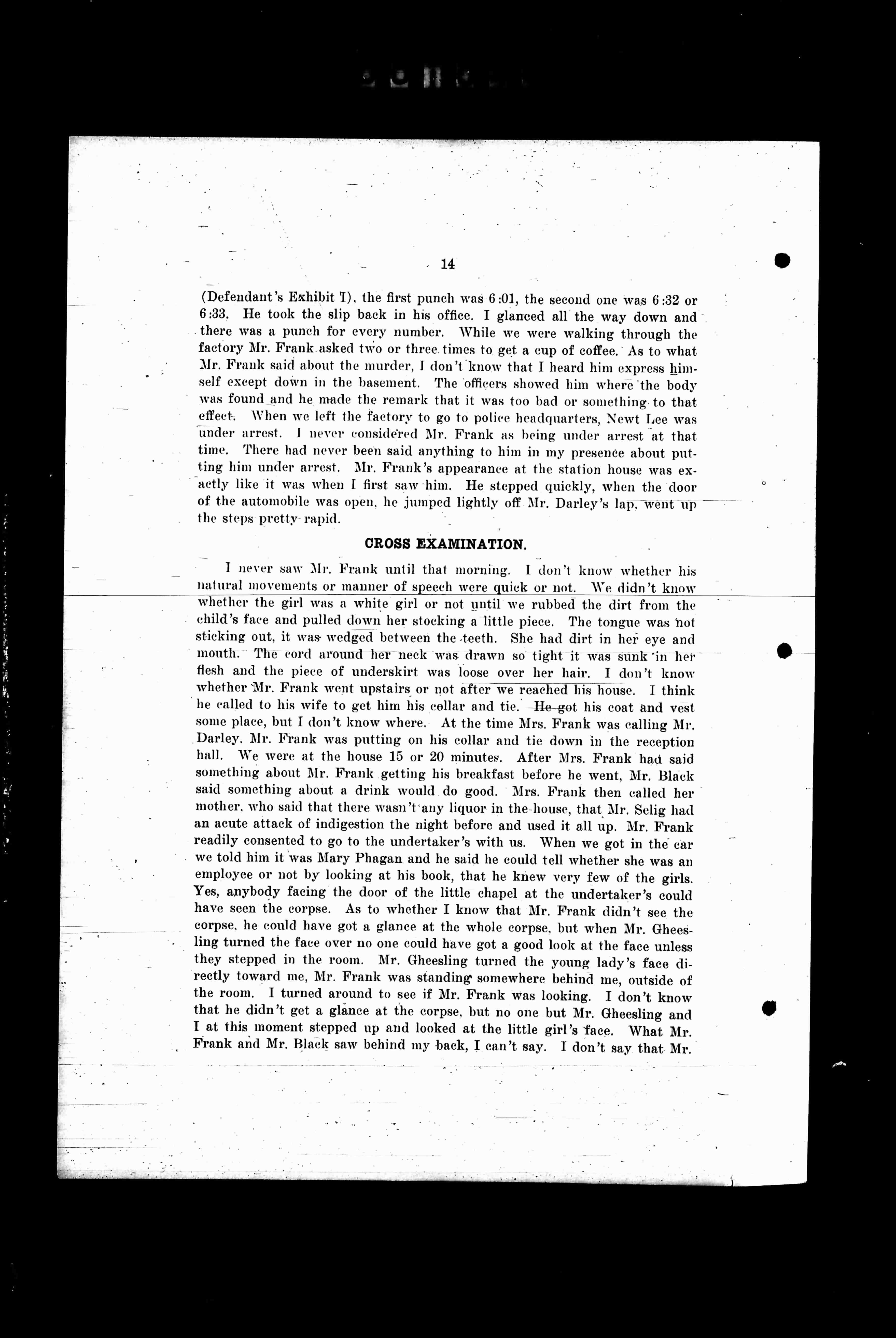 I never saw Mr. Frank until that morning. I don't know whether his natural movements or manner of speech were quick or not. We didn't know whether the girl was a white girl or not until we rubbed the dirt from the child's face and pulled down her stocking a little piece. The tongue was not sticking out, it was wedged between the teeth. She had dirt in her eye and mouth. The cord around her neck was drawn so tight it was sunk in her flesh and the piece of underskirt was loose over her hair. I don't know whether Mr. Frank went upstairs or not after we reached his house. I think he called to his wife to get him his collar and tie. He got his coat and vest some place, but I don't know where. At the time Mrs. Frank was calling Mr. Darley, Mr. Frank was putting on his collar and tie down in the reception hall. We were at the house 15 or 20 minutes. After Mrs. Frank had said something about Mr. Frank getting his breakfast before he went, Mr. Black said something about a drink would do good. Mrs. Frank then called her mother, who said that there wasn't anything in the house, that Mr. Selig had an acute attack of indigestion the night before and used it all up. Mr. Frank readily consented to go to the undertaker's with us. When we got in the car we told him it was Mary Phagan and he said he could tell whether she was an employee or not by looking at his books, that he knew very few of the girls. Yes, anybody facing the door of the little chapel at the undertaker's could have seen the corpse. As to whether I know that Mr. Frank didn't see the corpse, he could have got a glance at the whole corpse, but when Mr. Gheesling turned the face over no one could have got a good look at the face unless they stepped in the room. Mr. Gheesling turned the young lady's face directly toward me. Mr. Frank was standing somewhere behind me, outside of the room. I turned around to see if Mr. Frank was looking. I don't know that he didn't get a glance at the corpse but no one but Mr. Gheesling and I at this moment stepped up and looked at the little girl's face. What Mr. Frank and Mr. Black saw behind my back, I can't say. I don't say that Mr.