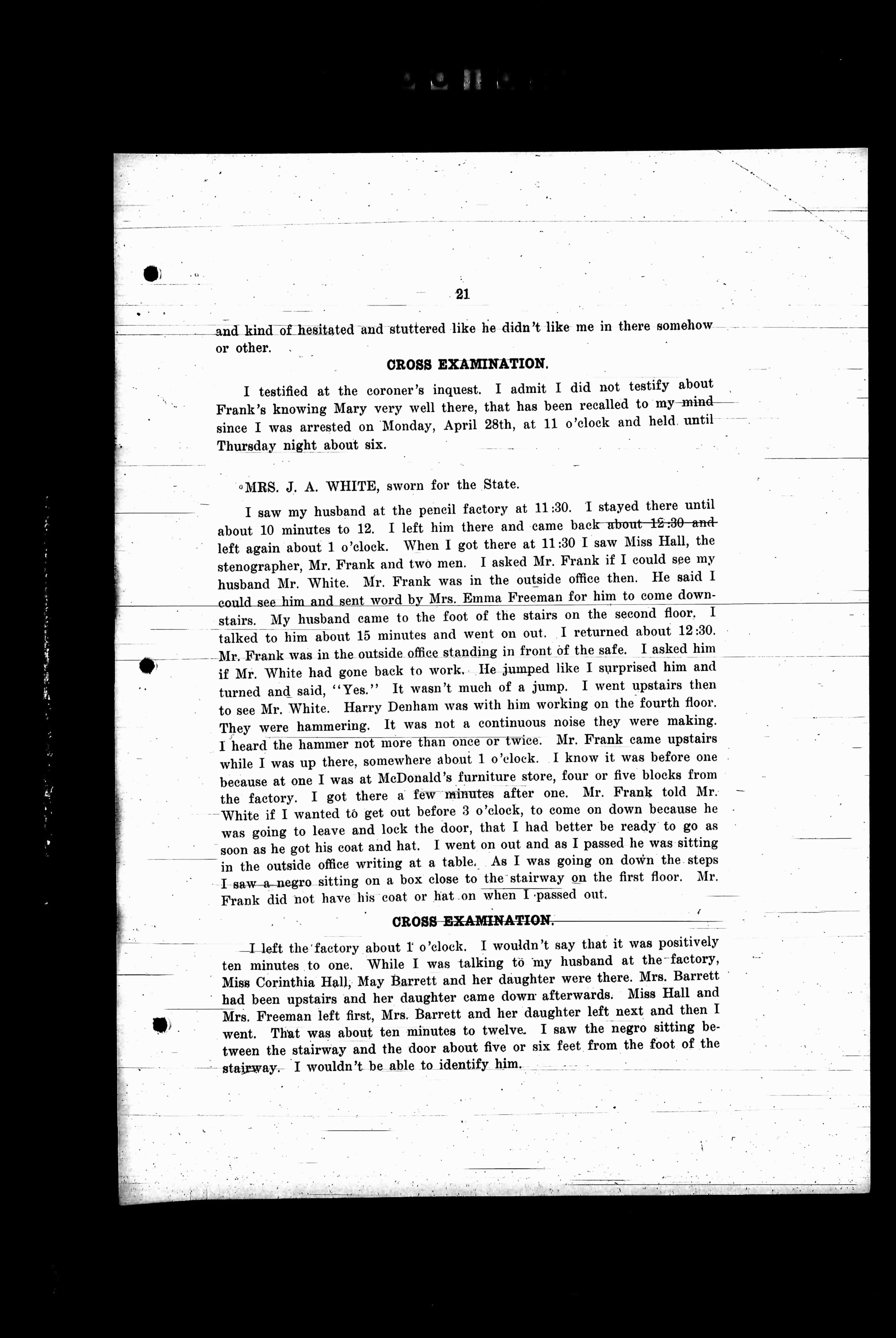 I saw my husband at the pencil factory at 11:30. I stayed there until about 10 minutes to 12. I left him there and came back about 12:30 and left again about 1 o'clock. When I got there at 11:30 I saw Miss Hall, the stenographer, Mr. Frank and two men. I asked Mr. Frank if I could see my husband Mr. White. Mr. Frank was in the outside office then. He said I could see him and sent word by Mrs. Emma Freeman for him to come downstairs. My husband came to the foot of the stairs on the second floor. I talked to him about 15 minutes and went on out. I returned about 12:30. Mr. Frank was in the outside office standing in front of the safe. I asked him if Mr. White had gone back to work. He jumped like I surprised him and turned and said, 'Yes.' It wasn't much of a jump. I went upstairs then to see Mr. White. Harry Denham was with him working on the fourth floor. They were hammering. It was not a continuous noise they were making. I heard the hammer not more than once or twice. Mr. Frank came upstairs while I was up there, somewhere about 1 o'clock. I know it was before one because at one I was at McDonald's furniture store, four or five blocks from the factory. I got there a few minutes after one. Mr. Frank told Mr. White if I wanted to get out before 3 o'clock, to come on down because he was going to leave and lock the door. I had better be ready to go as soon as he got his coat and hat. I went on out and as I passed he was sitting in the outside office writing at a table. As I was going down the steps I saw a negro sitting on a box close to the stairway on the first floor. Mr. Frank did not have his coat or hat on when I passed out.