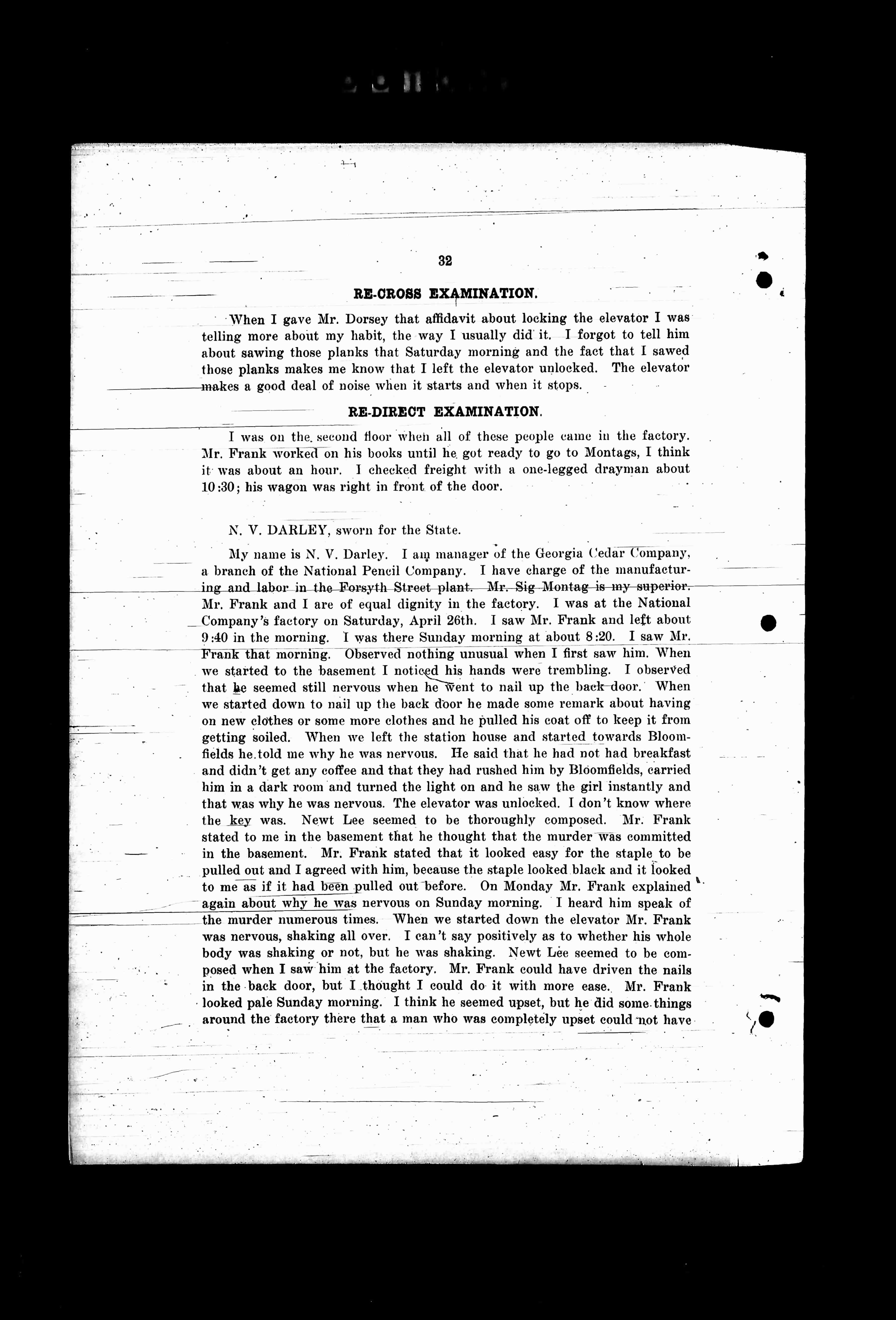 My name is N. V. Darley. I am manager of the Georgia Cedar Company, a branch of the National Pencil Company. I have charge of the manufacturing and labor in the Forsyth Street plant. Mr. Sig Montag is my superior. Mr. Frank and I are of equal dignity in the factory. I was at the National Company's factory on Saturday, April 26th. I saw Mr. Frank and left about 9:40 in the morning. I was there Sunday morning at about 8:20. I saw Mr. Frank that morning. Observed nothing unusual when I first saw him. When we started to the basement I noticed his hands were trembling. I observed that he seemed still nervous when he went to nail up the back door. When we started down to nail up the back door he made some remark about having on new clothes or some more clothes and he pulled his coat off to keep it from getting soiled. When we left the station house and started towards Bloomfield he told me why he was nervous. He said that he had not had breakfast and didn't get any coffee and that they had rushed him by Bloomfields, carried him in a dark room and turned the light on him, he saw the girl instantly and that was why he was nervous. The elevator was unlocked. I don't know where the key was. Newt Lee seemed to be thoroughly composed. Mr. Frank stated to me in the basement that he thought that the murder was committed in the basement. Mr. Frank stated that he looked easy for the staple to be pulled out and I agreed with him, because the staple looked black and it looked to me as if it had been pulled out before. On Monday Mr. Frank explained again about why he was nervous on Sunday morning. I heard him speak of the murder numerous times. When we started down the elevator Mr. Frank was nervous, shaking all over. I can't say positively as to whether his whole body was shaking or not, but he was shaking. Newt Lee seemed to be composed when I saw him at the factory. Mr. Frank could have driven the nails in the back door, but I thought I could do it with more ease. Mr. Frank looked pale Sunday morning. I think he seemed upset, but he did some things around the factory there that a man who was completely upset could not have