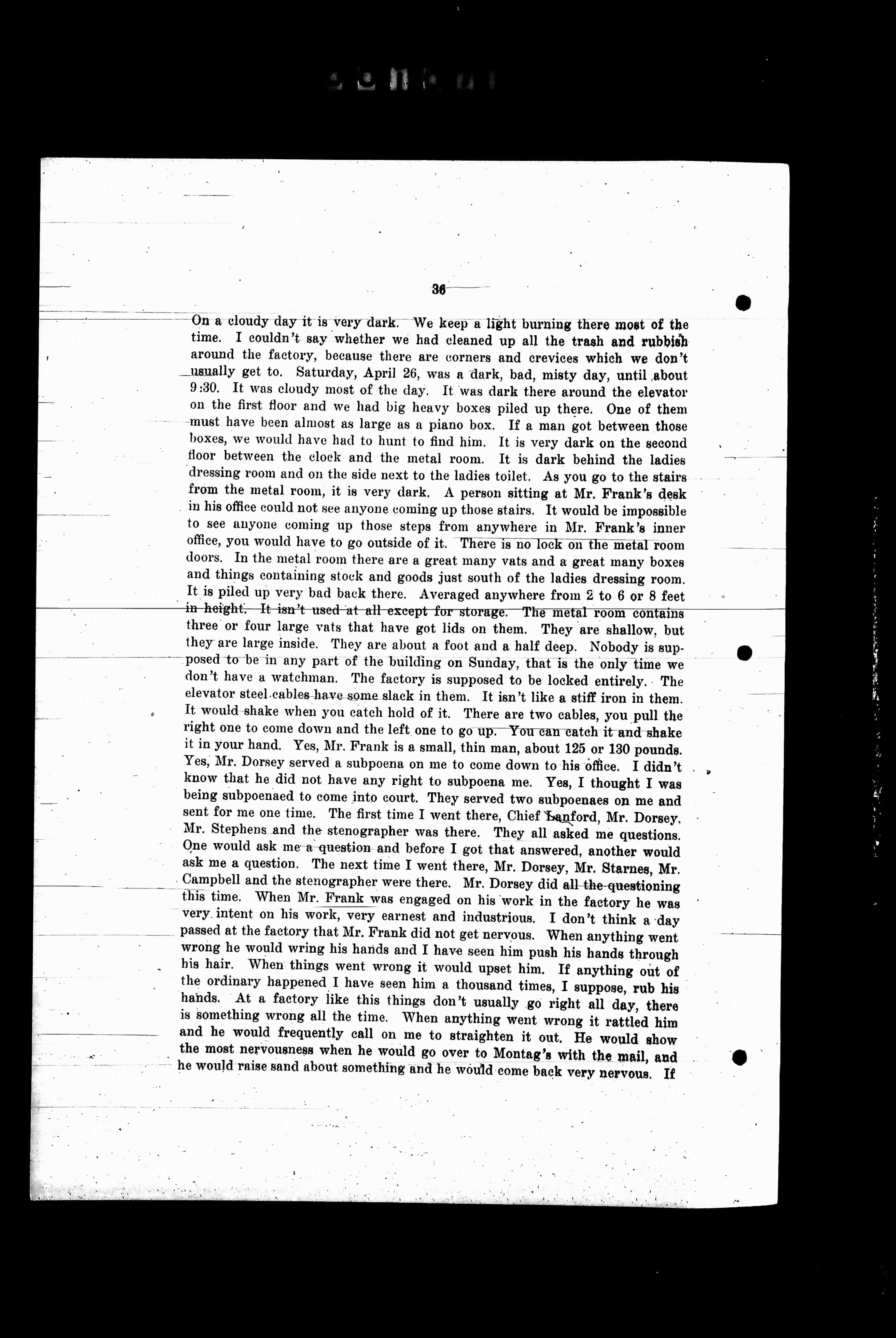 On a cloudy day it is very dark. We keep a light burning there most of the time. I couldn't say whether we had cleaned up all the trash and rubbish around the factory, because there are corners and crevices which we don't usually get to. Saturday, April 26, was a very bad, misty day, until about 9:30. It was cloudy most of the day. It was dark there around the elevator on the first floor and we had big heavy boxes piled up there. One of them must have been almost as large as a piano box. If a man got between those boxes, we would have had to hunt to find him. It is very dark on the second floor between the clock and the metal room. It is dark behind the ladies dressing room and on the side next to the ladies toilet. As you go to the stairs from the metal room, it is very dark. A person sitting at Mr. Frank's desk in his office could not see anyone coming up those stairs. It would be impossible to see anyone coming up those steps from anywhere in Mr. Frank's inner office, you would have to go outside of it. There is no lock on the metal room doors. In the metal room there are a great many vats and a great many boxes and things containing stock and goods just south of the ladies dressing room. It is piled up very bad back there. Averaged anywhere from 2 to 6 or 8 feet in height. It isn't used at all except for storage. The metal room contains three or four large vats that have got lids on them. They are shallow, but they are large inside. They are about a foot and a half deep. Nobody is supposed to be in any part of the building on Sunday, that is the only time we don't have a watchman. The factory is supposed to be locked entirely. The elevator steel cables have some slack in them. It isn't like a stiff iron in them. It would shake when you catch hold of it. There are two cables, you pull the right one to come down and the left one to go up. You can catch it and shake it in your hand. Yes, Mr. Frank is a small, thin man, about 125 or 130 pounds. Yes, Mr. Dorsey served a subpoena on me to come down to his office. I didn't know that he did not have any right to subpoena me. Yes, I thought I was being subpoenaed to come into court. They sent two subpoenas on me and sent for me one time. The first time I went with Chief Lanford, Mr. Dorsey, Mr. Stephens and the stenographer was there. They all asked me questions. One would ask me a question and before I got that answered, another would ask me a question. The next time I went there, Mr. Dorsey, Mr. Starnes, Mr. Campbell and the stenographer were there. Mr. Dorsey did all the questioning this time. When Mr. Frank was engaged on his work in the factory he was very intent on his work, very earnest and industrious. I don't think a day passed at the factory that Mr. Frank did not get nervous. When anything went wrong he would wring his hands and I have seen him push his hands through his hair. When things went wrong it would upset him. If anything out of the ordinary happened I have seen him do this thousand times, I suppose, rub his hands. At a factory like this things don't usually go right all day, there is something wrong all the time. When anything went wrong it rattled him and he would frequently call on me to straighten it out. He would show the most nervousness when he would go over to Montag's with the mail, and he would raise sand about something and he would come back very nervous. If