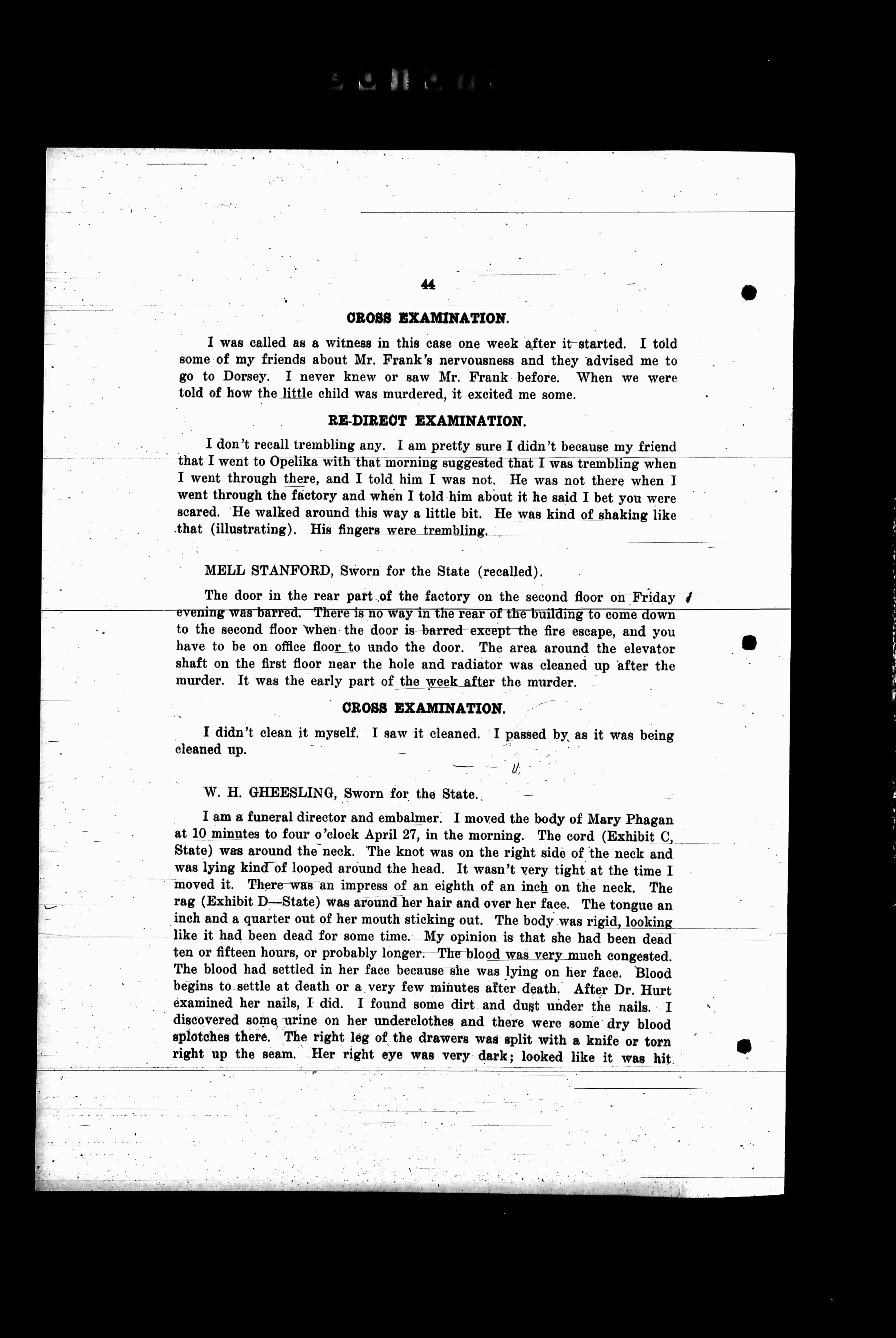 I was called as a witness in this case a week after it started. I told some of my friends about Mr. Frank's nervousness and they advised me to go to Dorsey. I never knew or saw Mr. Frank before. When we were told of how the little child was murdered, it excited me some.