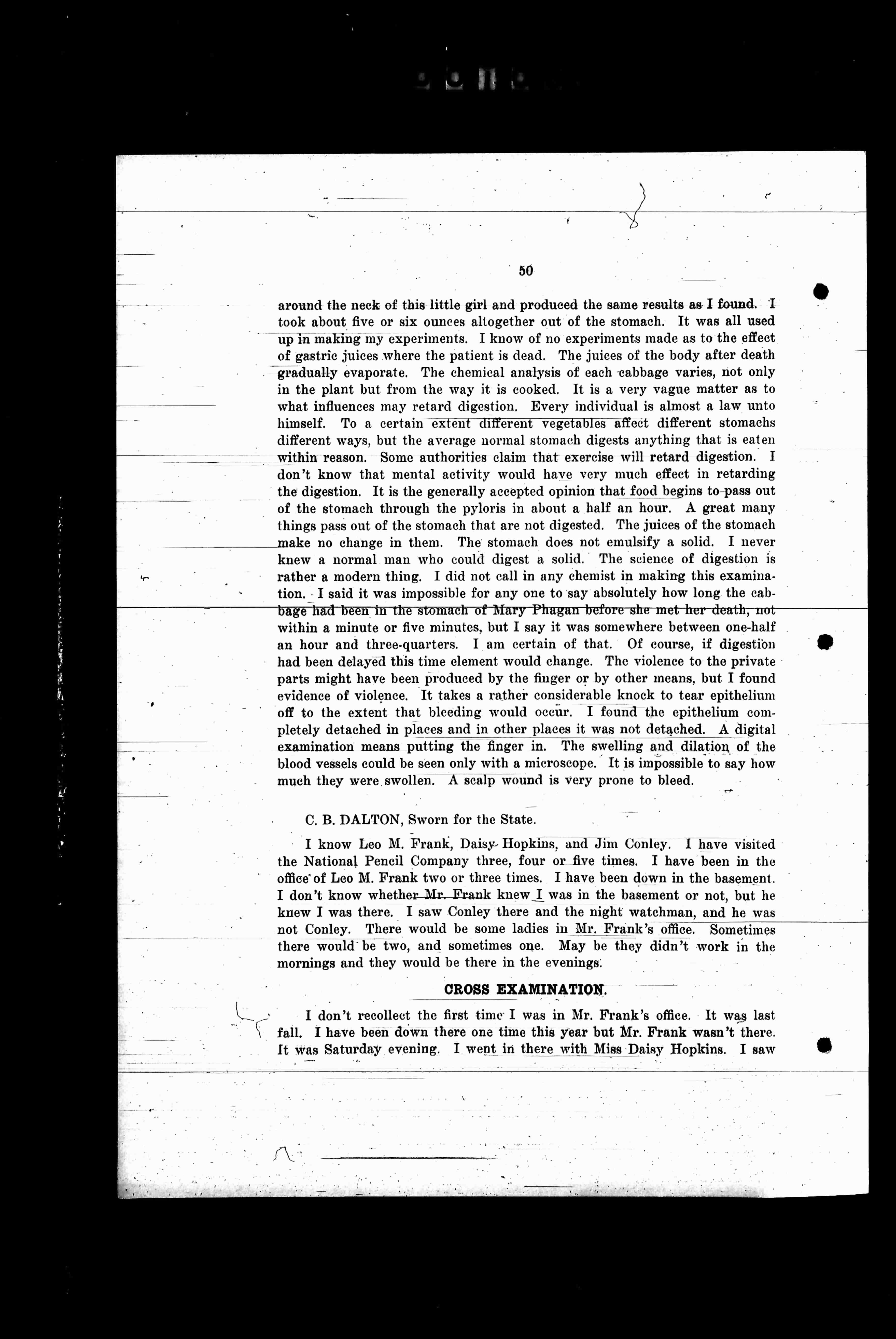around the neck of this little girl and produced the same results as I found. I took about five or six ounces altogether out of the stomach. It was all used up in making my experiments. I know of no experiments made as to the effect of gastric juices where the patient is dead. The juices of the body after death gradually evaporate. The chief analysis of each cabbage varies, not only in the plant but from the way it is cooked. It is a very vague matter as to what influences may retard digestion. Every individual is almost a law unto himself. To a certain extent different vegetables affect different stomachs different ways, but the average normal stomach digests anything that is eaten within reason. Some authorities claim that exercise will retard digestion. I don't know that mental activity would have very much effect in retarding the digestion. It is the generally accepted opinion that food begins to pass out of the stomach through the pyloris in about a half an hour. A great many things pass out of the stomach that are not digested. The juices of the stomach make no change in them. The stomach does not emulsify a solid. I never knew a normal man who could digest a solid. The science of digestion is rather a modern thing. I did not call in any chemist in making this examination. I said it was impossible for any one to say absolutely how long the cabbage had been in the stomach of Mary Phagan before she met her death, not within a minute or five minutes, but I say it was somewhere between one-half an hour and three-quarters. I am certain of that. Of course, if digestion had been delayed this time element would change. The violence to the private parts might have been produced by the finger or by other means, but I found evidence of violence. It takes a rather considerable knock to tear epithelium off to the extent that bleeding would occur. I found the epithelium completely detached in places and in other places it was not detached. A digital examination means putting the finger in. The swelling and dilation of the blood vessels could be seen only with a microscope. It is impossible to say how much they were swollen. A scalp wound is very prone to bleed.