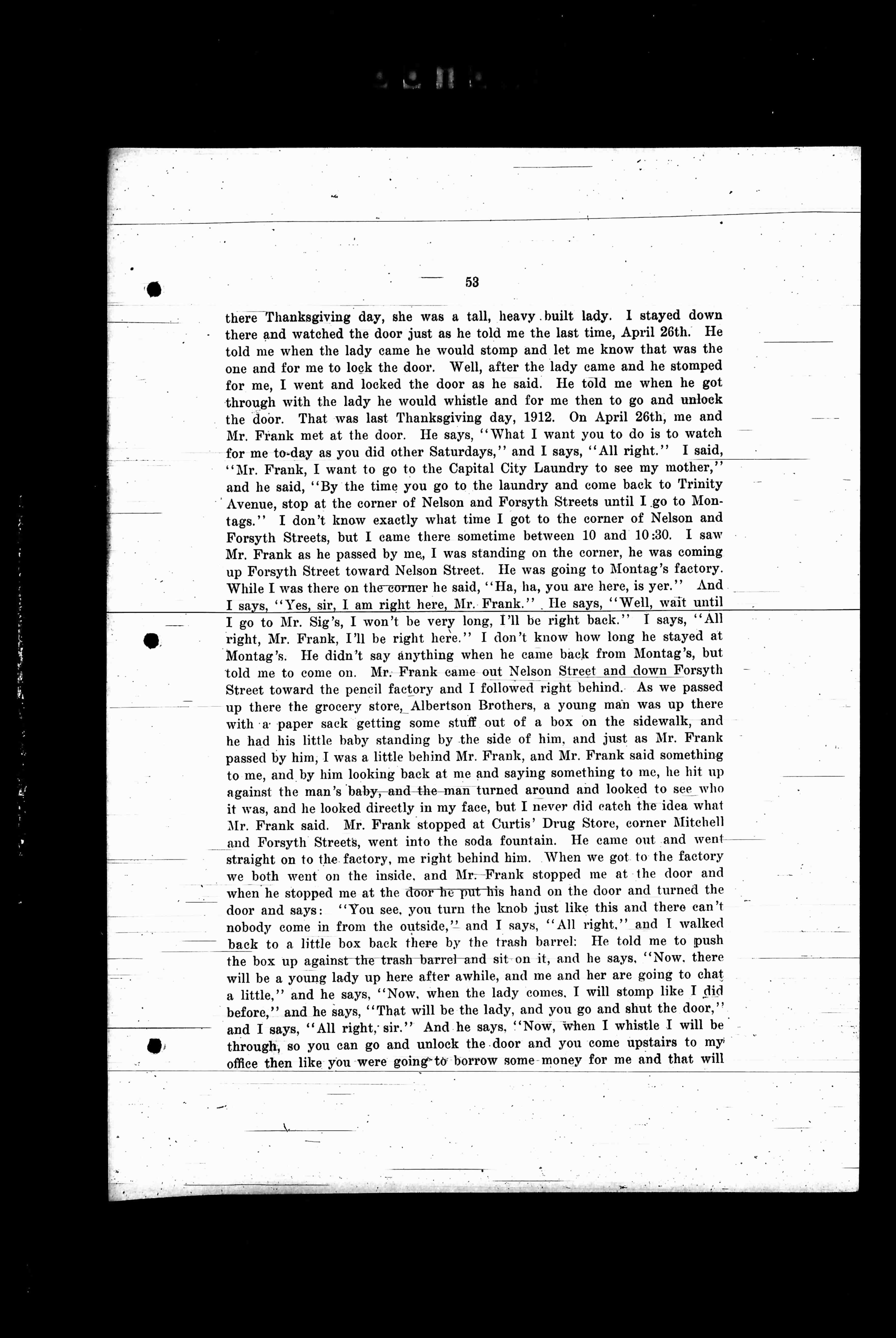 there Thanksgiving day, she was a tall, heavy built lady. I stayed down there and watched the door just as he told me the last time, April 26th. He told me when the lady came he would come and let me know that was the one and for me to lock the door. When he told me the lady came and he stomped for me, I went and locked the door. He told me. He told me when he got through with the lady he would whistle and for me then to go and unlock the door. That was last Thanksgiving day, 1912. On April 26th, me and Mr. Frank met at the door. He says, "What I want you to do is to watch for me to-day as you did other Saturdays," and I says, "All right." I said, "Mr. Frank, I want to go to the Capital City Laundry to see my mother," and he said, "By the time you go to the laundry and come back to Trinity Avenue, stop at the corner of Nelson and Forsyth Streets until I go to Montags." I don't know exactly what time I got to the corner of Nelson and Forsyth Streets, but I came there sometime between 10 and 10:30. I saw Mr. Frank as he passed by me. I was standing on the corner, he was coming up Forsyth Street toward Nelson Street. He was going to Montag's factory. While I was there on the corner he said, "Ha, ha, you are here, is yer." And I says, "Yes, sir, I am right here, Mr. Frank." He says, "Well, wait until I go to Mr. Sig's, I won't be very long, I'll be right back." I says, "All right, Mr. Frank, I'll be right here." I don't know how long he stayed at Montag's. He didn't say anything when he came back from Montag's, but told me to come on. Mr. Frank came out Nelson Street and down Forsyth Street toward the pencil factory and I followed right behind. As we passed up there the grocery store, Albertson Brothers, a young man was up there with a paper sack getting some stuff out of a box on the sidewalk, and he had his little baby standing by the side of him, and just as Mr. Frank passed by him, I was a little behind Mr. Frank, and Mr. Frank said something to me, and by him looking back at me and saying something to me, he hit up against the man's baby, and the man turned around and looked to see who it was, and he looked directly in my face. I never did catch the idea what Mr. Frank said. Mr. Frank stopped at Sig's Drug Store, corner Mitchell and Forsyth Streets, went into the store Mountain. He came out and went straight on to the factory, me right behind him. When we got to the factory we both went on the inside, and Mr. Frank stopped me at the door and when he stopped me at the door he put his hand on the door and turned the door and says, "You see, you turn the knob just like this and there can't nobody come in from the outside," and I says, "All right," and I walked back to a little box back there by the trash barrel. He told me to push the box up against the trash barrel and sit on it, and he says, "Now, there will be a young lady up here after awhile, and me and her are going to chat a little," and he says, "Now, when the lady comes, I will stomp like I did before," and he says, "That will be the lady, and you go and shut the door," and I says, "All right, sir." And he says, "Now, when I whistle I will be through, so you can go and unlock the door and you come upstairs to my office then like you were going to borrow some money for me and that will