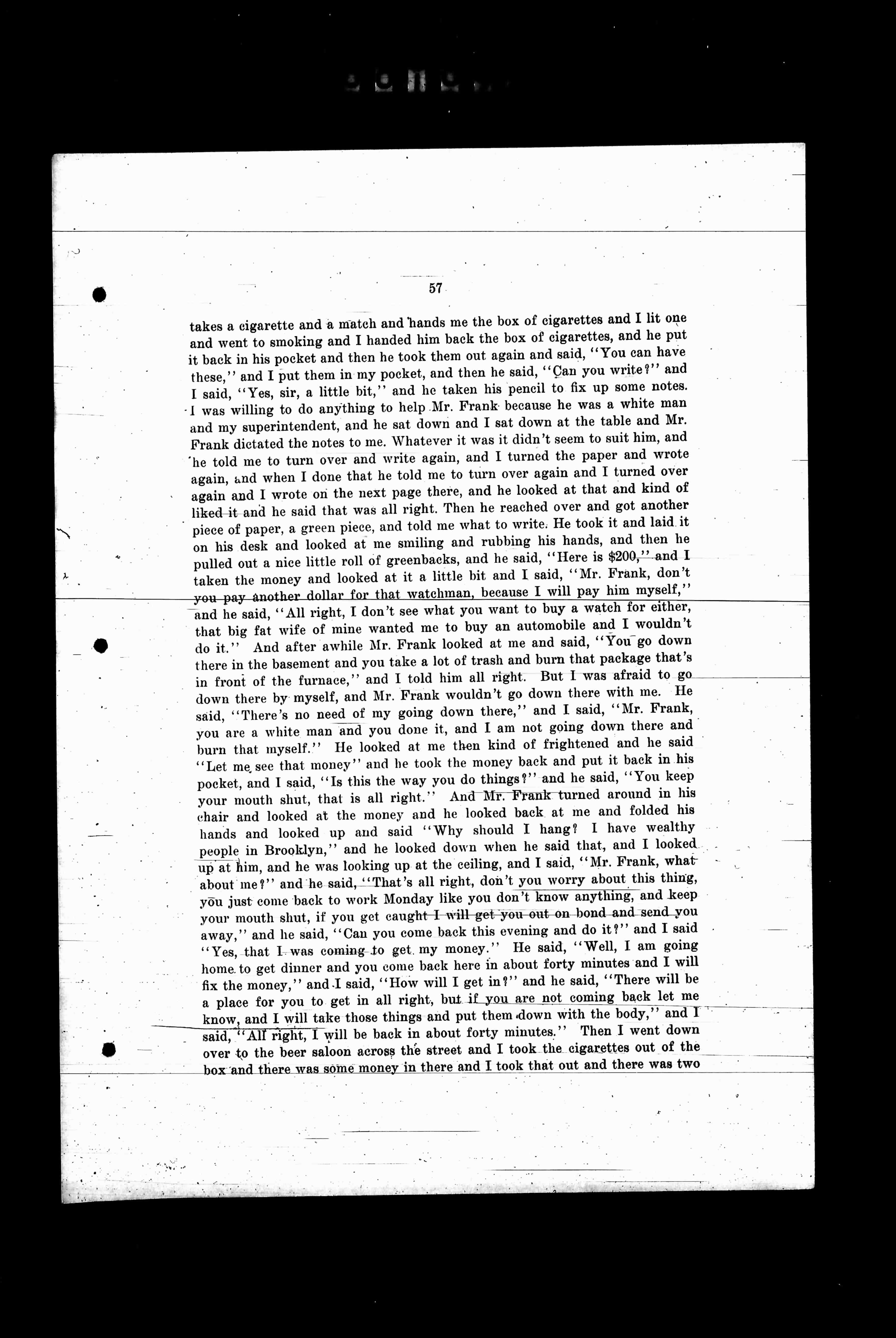 takes a cigarette and a match and hands me the box of cigarettes and I lit one and went to smoking and I handed him back the box of cigarettes, and he put it back in his pocket and then he took them out again and said, "You can have these," and I put them in my pocket, and he said, "Can you write?" and I said, "Yes, sir, a little bit," and he taken his pencil to fix up some notes. I was willing to do anything to help Mr. Frank because he was a white man and my superintendent, and he sat down and I sat down at the table and Mr. Frank dictated the notes to me. Whatever it was it didn't seem to suit him, and he told me to turn over and write again, and I turned the paper and wrote again, and when I done that he told me to turn over again and I turned over again and I wrote on the next page there, and he looked at that and kind of liked it and he said that was all right. Then he reached over and got another piece of paper, a green piece, and told me to write. He took it and laid it on his desk and looked at me smiling and rubbing his hands, and then he pulled out a nice little roll of greenbacks, and he said, "Here is $200." and I taken the money and looked at it a little bit and I said, "Mr. Frank, don't you-pay-another dollar for that watchman, because I will pay him myself," and he said, "All right, I don't see what you want to buy a watch for either, that big fat wife of mine wanted me to buy an automobile and I wouldn't do it." And after awhile Mr. Frank looked at me and said, "You go down there in the basement and you take a lot of trash and burn that package that's in front of the furnace," and I told him all right. But I was afraid to go down there by myself, and Mr. Frank wouldn't go down there with me. He said, "There's no need of my going down there," and I said, "Mr. Frank, you are a white man and you done it, and I am not going down there and burn that myself." He looked at me then kind of frightened and he said "Let me see that money" and he took the money back and put it back in his pocket, and I said, "Is this the way you do things?" and he said, "You keep your mouth shut, that is all right." And Mr. Frank turned around in his chair and looked at the money and looked back at me and folded his hands and looked up and said "Why didn't I hang? I have wealthy people in Brooklyn," and he looked down when he said that, and I looked up at him, and he was looking up at the ceiling, and I said, "Mr. Frank, what about me?" and he said, "That's all right, don't you worry about this thing, you just come back to work Monday like you don't know anything, and keep your mouth shut, if you get caught I will get you out on bond, and send you away," and he said, "Can you come back this evening and do it?" and I said "Yes, that I was coming to get my money." He said, "Well, I am going home to get dinner and you come back here in about forty minutes and I will fix the money," and I said, "How will I get in?" and he said, "There will be a place for you to get in all right, but if you are not coming back let me know, and I will take those things and put them down with the body," and I said, "All right, I will be back in about forty minutes." Then I went down over to the beer saloon across the street and I took the cigarettes out of the box and there was some money in there and I took that out and there was two