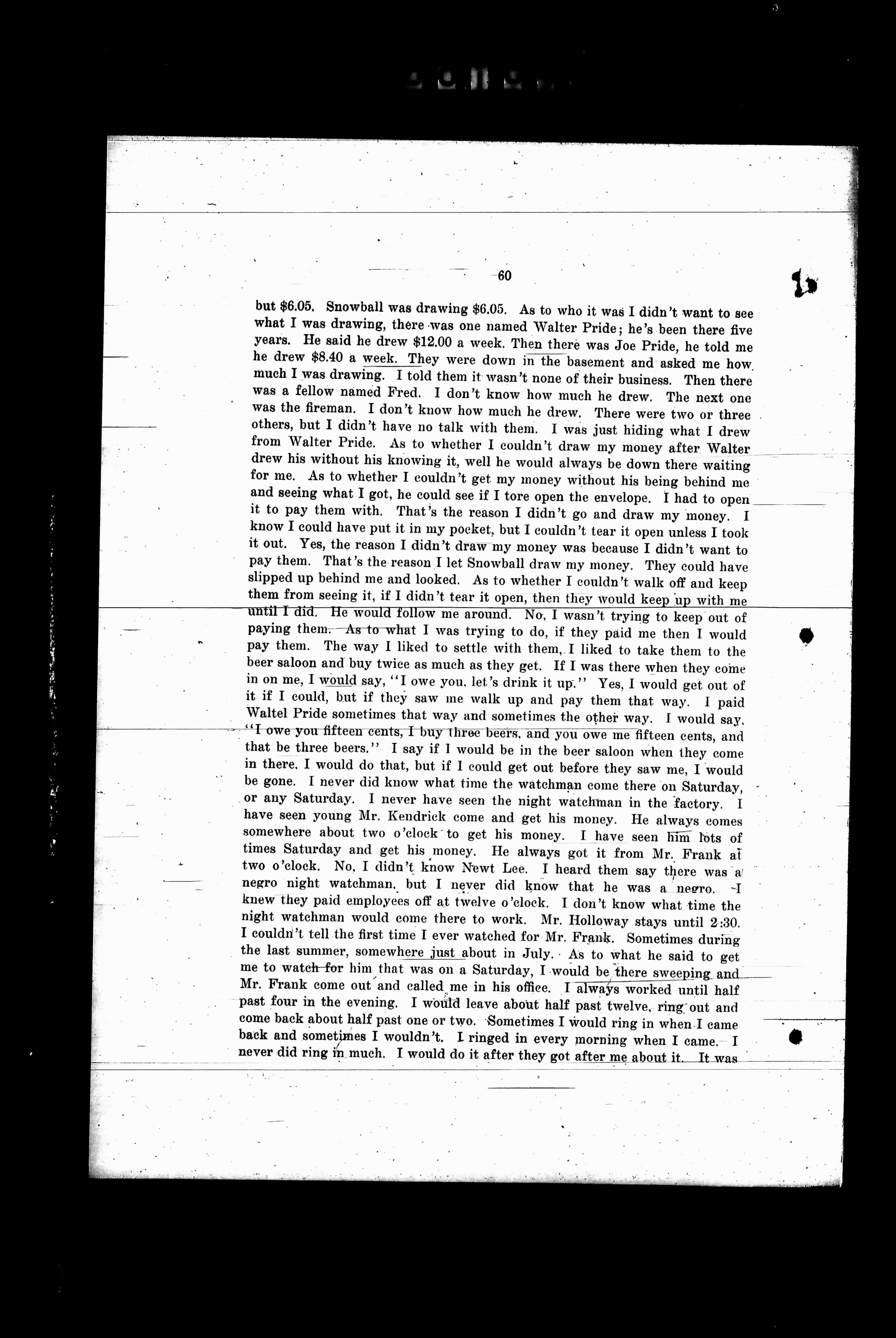 but $6.05. Snowball was drawing $6.05. As to who it was I didn't want to see what I was drawing, there was one named Walter Pride; he's been there five years. He said he drew $12.00 a week. Then there was Joe Pride, he told me he drew $8.40 a week. They were down in the basement and asked me how much I was drawing. I told them I didn't know none of their business. Then there was a fellow named Fred. I don't know how much he drew. The next one was the fireman. I don't know how much he drew. There were two or three others, but I didn't have no talk with them. I was just hiding what I drew from Walter Pride. As to whether I could not draw my money after Walter drew his without his knowing it, well he would always be down there waiting for me. As to whether I couldn't get my money without his being behind me and seeing what I got, he could see if I tore open the envelope. I had to open it to pay them with. That's the reason I didn't go and draw my money. I knew I could have put it in my pocket, but I couldn't tear it open unless I took it out. Yes, the reason I didn't draw my money was because I didn't want to pay them. That's the reason I let Snowball draw my money. They could have slipped up behind me and looked. As to whether I couldn't walk off and keep them from seeing it, if I didn't tear it open, then they would keep up with me until I did. He would follow me around. No, I wasn't trying to keep out of paying them. -As to what I was trying to do, if they paid me then I would pay them. The way I liked to settle with them, I liked to take them to the beer saloon and buy twice as much as they get. If I was there when they come in on me, I would say, "I owe you, let's drink it up." Yes, I would get out of it if I could, but if they saw me walk up and pay them, that way. I paid Walter Pride sometimes that way and sometimes the other way. I would say, "I owe you fifteen cents," I buy three beers, and you owe me fifteen cents, and that be three beers." I say if I would be in the beer saloon when they come in there, I would do that, but if I could get out before they saw me, I would be gone. I never did know what time the watchman come there on Saturday, or any Saturday. I never have seen no night watchman in the factory. I have seen young Mr. Kendrick come and get his money. He always comes sometime about two o'clock to get his money. I have seen him lots of times Saturday and get his money. He always got it from Mr. Frank at two o'clock. No, I didn't know Newt Lee. I heard them say there was a negro night watchman, but I never did know that he was a negro. -I know they paid employees off at twelve o'clock. I don't know what time the night watchman would come there to work. Mr. Holloway stays until 2:30. I couldn't tell the first time I ever watched for Mr. Frank. Sometimes during the last summer, somewhere just about in July. As to what he said to get me to watch-for him that was on a Saturday. I would be there sweeping and Mr. Frank come out and called me in his office. I always worked until half past four in the evening. I would leave about half past twelve, ring out and come back about half past one or two. Sometimes I would ring in when I came back and sometimes I wouldn't. I ringed in every morning when I came. I never did ring in much. I would do it after they got after me about it. It was