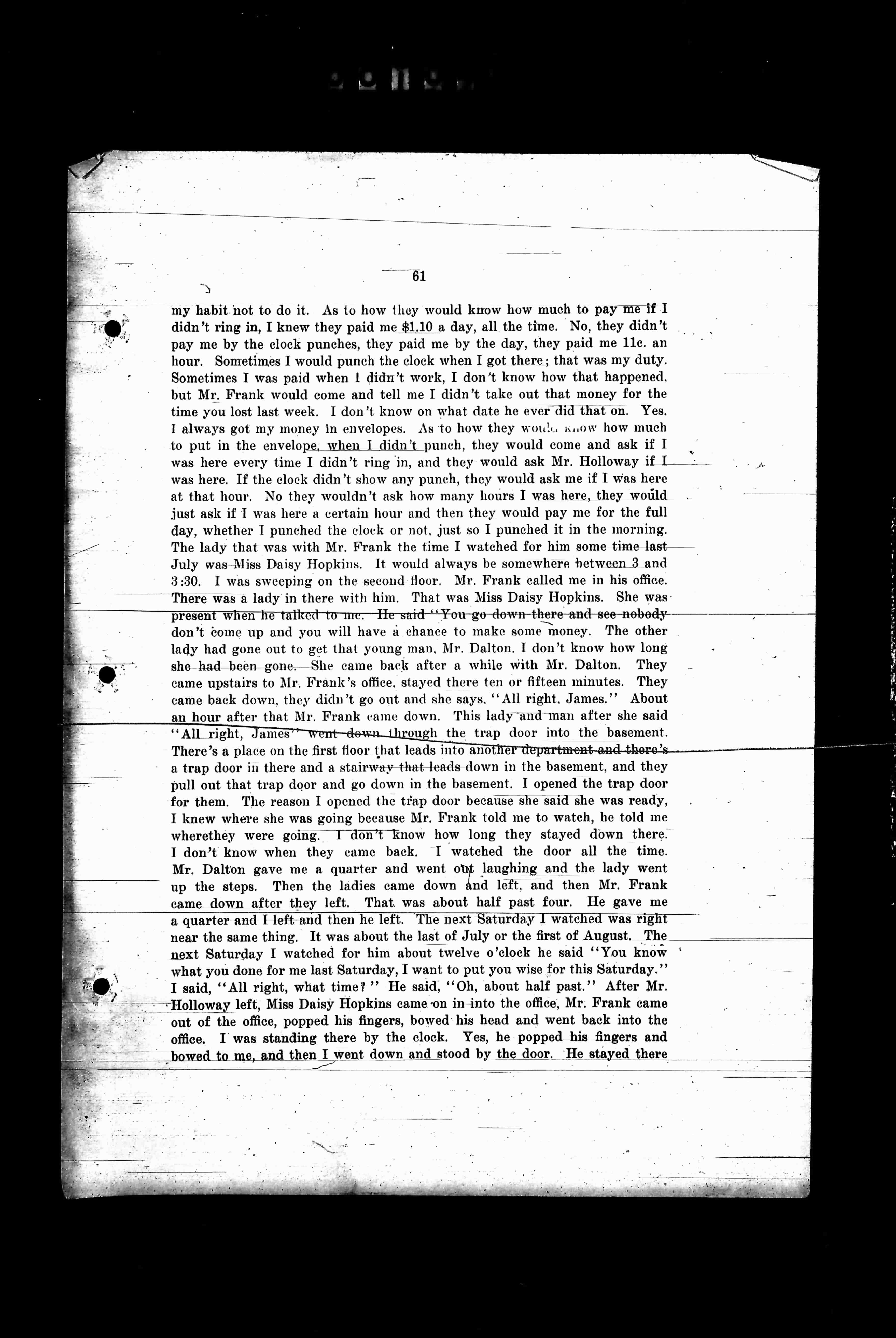 my habit not to do it. As to how they would know how much to pay me if I didn't ring in, I knew they paid me $1.10 a day all the time. No, they didn't pay me by the clock punches, they paid me by the day, they paid me 11c. an hour. Sometimes I would punch the clock when I got there; that was my duty. Sometimes I was paid when I didn't work, I don't know how that happened, but Mr. Frank would come and tell me I didn't take out that money for the time you lost last week. I don't know on what date he ever did that on. Yes, I always got my money in envelopes. As to how they would... know how much to put in the envelope, when I didn't punch, they would come and ask if I was here every time I didn't ring in, and they would ask Mr. Holloway if I was here. If the clock didn't show any punch, they would ask me if I was here at that hour. No they wouldn't ask how many hours I was here, they would just ask if I was here a certain hour and then they would pay me for the full day, whether I punched the clock or not. Just so I punched it in the morning. The lady that was with Mr. Frank the time he watched for him some time last July was Miss Daisy Hopkins. It would always be somewhere between 3 and 3:30. I was sweeping on the second floor. Mr. Frank called me in his office. There was a lady in there with him. That was Miss Daisy Hopkins. She was present when he talked to me. He said "You go down there and see nobody don't come up and you will have a chance to make some money." The other lady had gone out to get that young man, Mr. Dalton. I don't know how long she had been gone. She came back after a while with Mr. Dalton. They came upstairs to Mr. Frank's office, stayed there ten or fifteen minutes. They came back down, they didn't go out and she says, "All right, James." About an hour after that Mr. Frank came down. This lady and man after she said "All right, James" went down through the trap door into the basement. There's a place on the first floor that leads into another department and there's a trap door in there and a stairway that leads down in the basement, and they pull out that trap door and go down in the basement. I opened the trap door for them. The reason I opened the trap door for her, she said she was ready, I knew where she was going because Mr. Frank told me to watch, he told me where they were going. I don't know how long they stayed down there. I don't know when they came back. I watched the door all the time. Mr. Dalton gave me a quarter and went off laughing and the lady went up the steps. Then the ladies came down and left, and then Mr. Frank came down after they left. That was about half past four. He gave me a quarter and I left and then he left. The next Saturday I watched was right near the same thing. It was about the last of July or the first of August. The next Saturday I watched for him about twelve o'clock he said "You know what you done for me last Saturday, I want you to put your wise for this Saturday." I said, "All right, what time?" He said, "Oh, about half past." After Mr. Holloway left, Miss Daisy Hopkins came on into the office, Mr. Frank came out of the office, popped his fingers, bowed his head and went back into the office. I was standing there by the clock. Yes, he popped his fingers and bowed to me, and then I went down and stood by the door. He stayed there