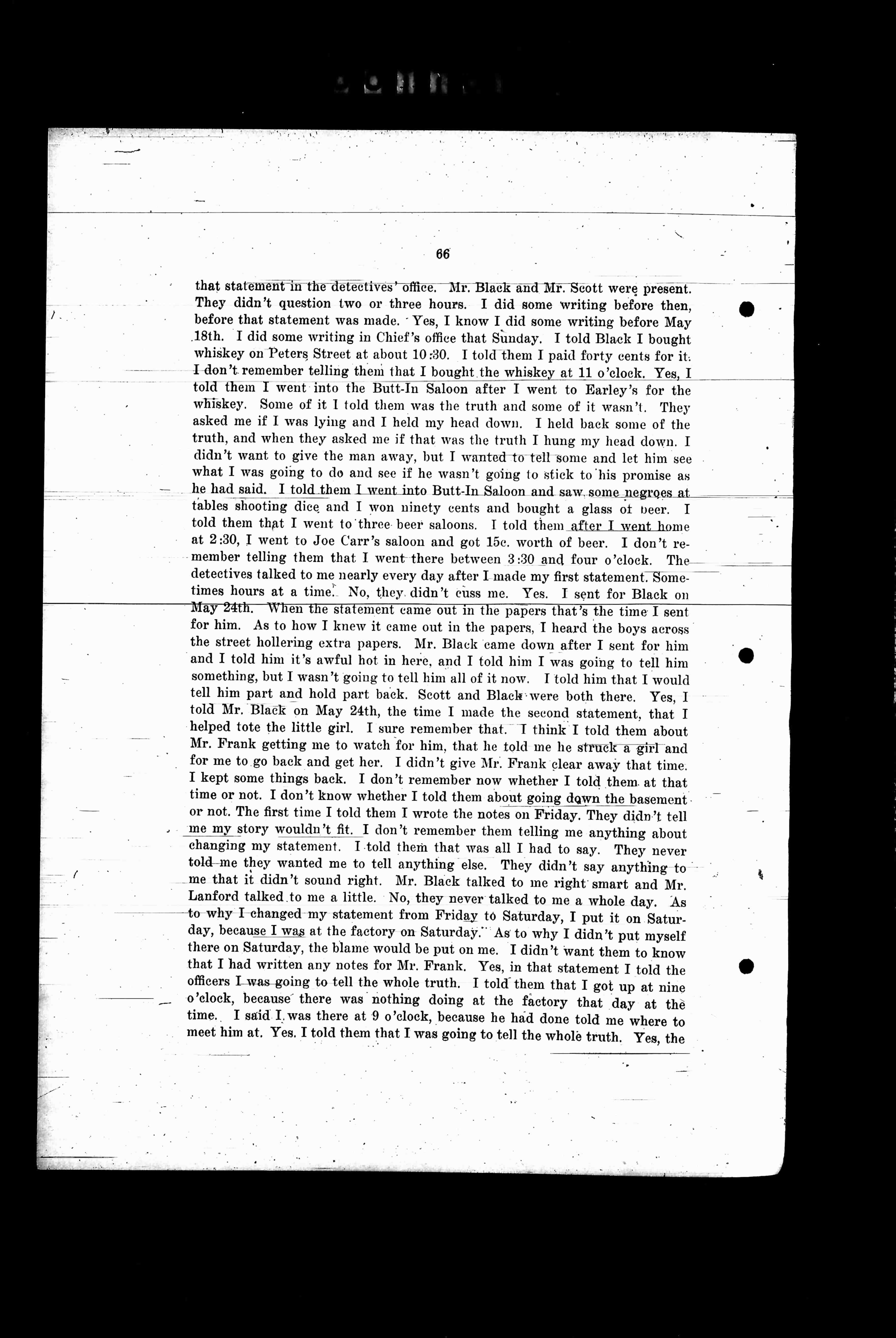that statement in the detectives' office. Mr. Black and Mr. Scott were present. They didn't question two or three hours. I did some writing before then, before that statement was made. Yes, I know I did some writing before May 18th. I did some writing in Chief's office that Sunday. I told Black I bought whiskey on Peters Street at about 10.30. I told them I paid forty cents for it. I don't remember telling them that I bought the whiskey at 11 o'clock. Yes, I told them I went into the Butt-In Saloon after I went to Earley's for the whiskey. Some of it I told them was the truth and some of it wasn't. They asked me if I was lying and I held my head down. I held back some of the truth, and when they asked me if that was the truth I hung my head down. I didn't want to give the man away, but I wanted to tell some and let him see what I was going to do and see if he wasn't going to stick to his promise as he had said. I told them I went into Butt-In Saloon and saw some negroes at tables shooting dice and I won ninety cents and bought a glass of beer. I told them that I went to three beer saloons. I told them after I went home at 2.30, I went to Joe Carrs's saloon and got 15c. worth of beer. I don't remember telling them that I went there between 3.30 and four o'clock. The detectives talked to me nearly every day after I made my first statement. Sometimes hours at a time. No, they didn't cuss me. Yes, I sent for Black on May 24th. When the statement came out in the papers that's the time I sent for him. As to how I knew it came out in the papers, I heard the boys across the street hollering extra papers. Mr. Black came down after I sent for him and I told him it's awful hot in here, and I told him I was going to tell him something, but I wasn't going to tell him all of it now. I told him that I would tell him part and hold part back. Scott and Black were both there. Yes, I told Mr. Black on May 24th, the time I made the second statement, that I helped tote the little girl. I sure remember that. I think I told them about Mr. Frank getting me to watch for him, that he told me he struck a girl and for me to go back and get her. I didn't give Mr. Frank clear away that time. I kept some things back. I don't remember now whether I told them that time or not. I don't know whether I told them about going down the basement or not. The first time I told them I wrote the notes on Friday. They didn't tell me my story wouldn't fit. I don't remember them telling me anything about changing my statement. I told them that was all I had to say. They never told me they wanted me to tell anything else. They didn't say anything to me that it didn't sound right. Mr. Black talked to me right smart and Mr. Lanford talked to me a little. No, they never talked to me a whole day. As to why I changed my statement from Friday to Saturday, I put it on Saturday, because I was at the factory on Saturday. As to why I didn't put on myself there on Saturday, the blame would be put on me. I didn't want them to know that I had written any notes for Mr. Frank. Yes, in that statement I told the officers I was going to tell the whole truth. I told them that I got up at nine o'clock, because there was nothing doing at the factory that day at the time. I said I was there at 9 o'clock, because he had done told me where to meet him at. Yes, I told them that I was going to tell the whole truth. Yes, the