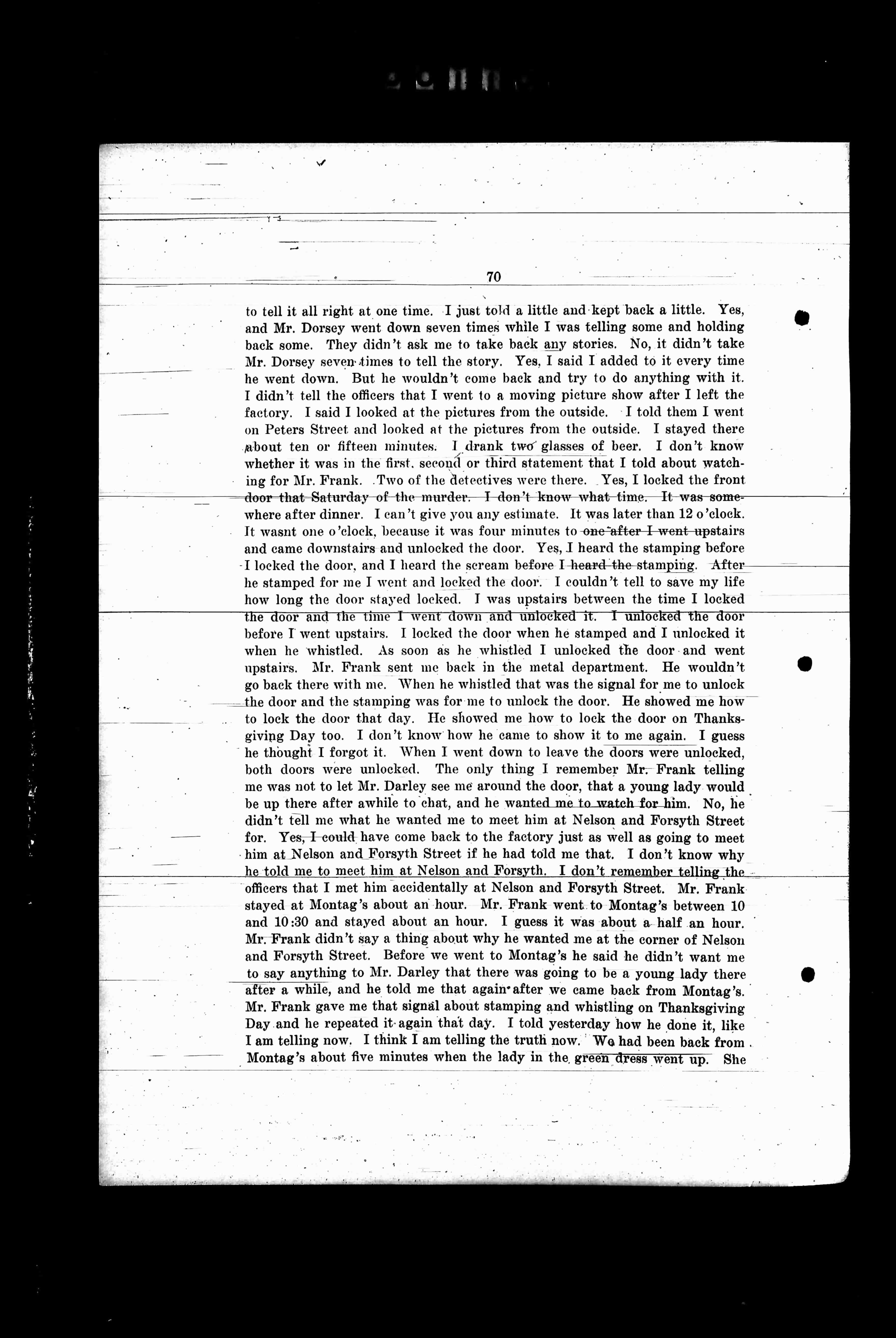 to tell it all right at one time. I just told a little and kept back a little. Yes, and Mr. Dorsey went down seven times while I was telling some and holding back some. They didn't ask me to back any stories. No, it didn't take Mr. Dorsey seven-times to tell the truth. Yes, I said I added to it every time he went down. But he wouldn't go back and try to do anything with it. I didn't tell the officers that I went to a moving picture show after I left the factory. I said I looked at the pictures from the outside. I told them I went on Peters Street and looked at the pictures from the outside. I stayed there about ten or fifteen minutes. I drank two glasses of beer. I don't know whether it was in the first, second or third statement that I told about watching for Mr. Frank. Two of the detectives were there. Yes, I locked the front door that Saturday of the murder. I don't know what time. It was some- where after dinner. I can't give you any estimate. It was later than 12 o'clock. It wasn't one o'clock, because it was four minutes to one-after-I-went-upstairs and came downstairs and unlocked the door. Yes, I heard the stamping before I locked the door, and I heard the scream before I heard the stamping. After he stamped for me I went and locked the door. I couldn't tell to save my life how long the door stayed locked. I was upstairs between the time I locked the door and the time I went down and unlocked it. I unlocked the door before I went upstairs. I locked the door when he stamped and I unlocked it when he whistled. As soon as he whistled I unlocked the door and went upstairs. Mr. Frank sent me back in the metal department. He wouldn't go back there with me. When he whistled that was the signal for me to unlock the door and the stamping was for me to unlock the door. He showed me how to lock the door that day. He showed me how to lock the door on Thanksgiving Day too. I don't know how he came to show it to me again. I guess he thought I forgot it. When I went down to leave the doors were unlocked, both doors were unlocked. The only thing I remember Mr. Frank telling me was not to let Mr. Darley see me around the door, that a young lady would be up there after awhile to chat, and I wanted me to watch for him. No, he didn't tell me what he wanted to see him at Nelson and Forsyth Street for. Yes-I-could have come back to the factory just as well as going to meet him at Nelson and Forsyth Street if he had told me that. I don't know why he told me to meet him at Nelson and Forsyth. I don't remember telling the officers that I met him accidentally at Nelson and Forsyth Street. Mr. Frank stayed at Montag's about an hour. Mr. Frank went to Montag's between 10 and 10:30 and stayed about an hour. I guess it was about a half an hour. Mr. Frank didn't say a thing about why he wanted me at the corner of Nelson and Forsyth Street. Before we went to Montag's he said he didn't want me to say anything to Mr. Darley that there was going to be a young lady there after a while, and he told me that again after we came back from Montag's. Mr. Frank gave me that signal on Thanksgiving Day and he repeated it again that day. I told yesterday how he done it, like I am telling now. I think I am telling the truth now. We had been back from Montag's about five minutes when the lady in the green dress went up. She