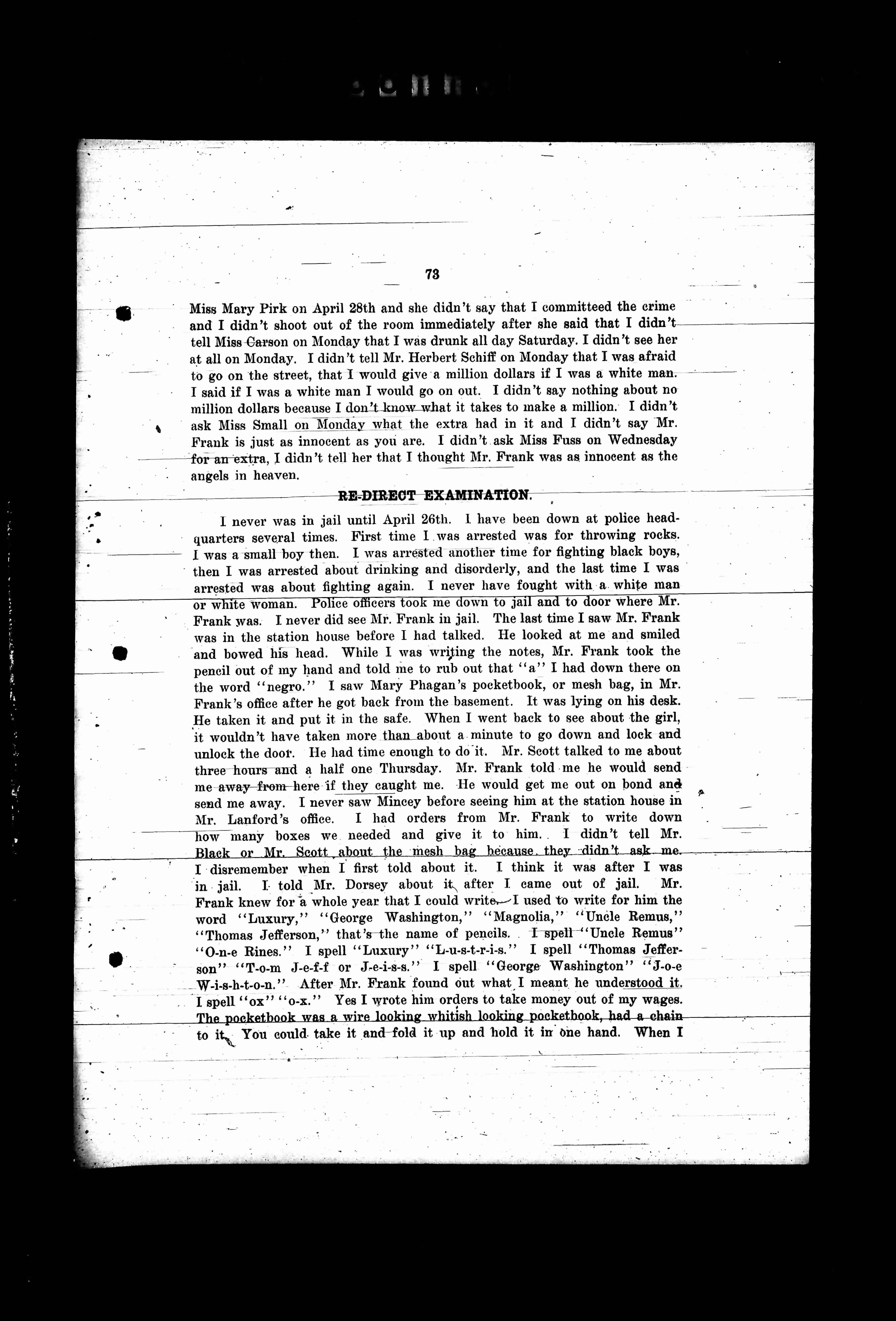 I never was in jail until April 26th. I have been down at police headquarters several times. First time I was arrested was for throwing rocks. I was a small boy then. I was arrested another time for fighting black boys, then I was arrested about drinking and disorderly, and the last time I was arrested was about fighting again. I never have fought with a white man or white woman. Police officers took me down to jail and to door where Mr. Frank was. I never did see Mr. Frank in jail. The last time I saw Mr. Frank was in the station house before I had talked. He looked at me and smiled and bowed his head. While I was writing the notes, Mr. Frank took the pencil out of my hand and told me to rub out that "a". I had down there on the word "negro." I saw Mary Phagan's pocketbook, or mesh bag, in Mr. Frank's office after he got back from the basement. It was lying on his desk. He taken it and put it in the safe. When I went back to see about the girl, it wouldn't have taken more than about a minute to go down and lock and unlock the door. He had time enough to do it. Mr. Scott talked to me about three hours and a half one Thursday. Mr. Frank told me he would send me away from here if they caught me. He should get me out on bond and send me away. I never saw Mincey before I saw him at the station house in Mr. Lanford's office. I had orders from Mr. Frank to write down how many boxes we needed and give it to him. I didn't tell Mr. Black or Mr. Scott about the mesh bag because they didn't ask me. I disremember when I first told about it. I think it was after I was in jail. I told Mr. Dorsey about it after I came out of jail. Mr. Frank knew for a whole year that I could write. I used to write for him the word "Luxury," "George Washington," "Magnolia," "Uncle Remus," "Thomas Jefferson," that's the name of pencils. I spell "Luxury" "L-u-x-u-r-y." I spell "George Washington" "G-e-o-r-g-e W-a-s-h-i-n-g-t-o-n." I spell "Magnolia" "M-a-g-n-o-l-i-a." I spell "Uncle Remus" "U-n-c-l-e R-e-m-u-s." I spell "Thomas Jefferson" "T-h-o-m-a-s J-e-f-f-e-r-s-o-n." I spell "George Washington" "G-e-o-r-g-e W-a-s-h-i-n-g-t-o-n." After Mr. Frank found out what I meant he understood it. I spell "ox" "o-x." Yes I wrote him orders to take money out of my wages. The pocketbook was a wire looking whitish looking pocketbook, had a chain to it. You could take it and fold it up and hold it in one hand. When I