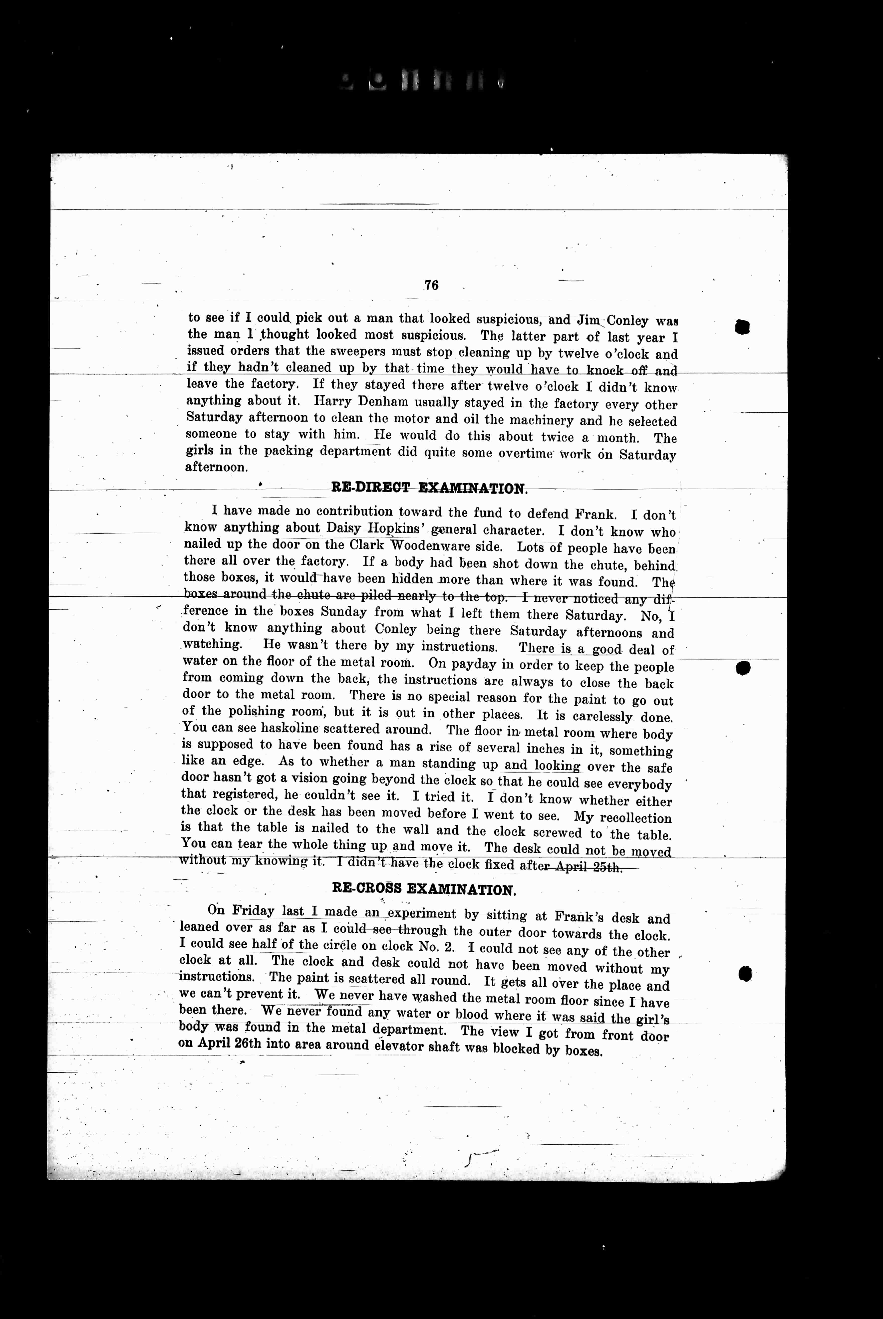 I have made no contribution toward the fund to defend Frank. I don't know anything about Daisy Hopkins' general character. I don't know who nailed up the door on the Clark Wooden's side. Lots of people have been there all over the factory. If a body had been shot down the chute, behind those boxes, it would have been hidden more than where it was found. The boxes-around-the-chute-are-piled-nearly-to-the-top. I never noticed any difference in the boxes Sunday from what I left them there Saturday. No, I don't know anything about Conley being there Saturday afternoons and watching. He wasn't there by my instructions. There is a good deal of water on the floor of the metal room. On payday in order to keep the people from coming down the back, the instructions are always to close the back door to the metal room. There is no special reason for the paint to go out of the polishing room, but it is out in other places. It is carelessly done. You can see haskoline scattered around. The floor in metal room where body is supposed to have been found has a rise of several inches in it, something like an edge. As to whether a man standing up and looking over the safe door hasn't got a vision going beyond the clock so that he could see everybody that registered, he couldn't see it. I tried it. I don't know whether either the clock or the desk has been moved before I came to see. My recollection is that the table is nailed to the wall and the clock screwed to the table. You can tear the whole thing up and move it. The desk could not be moved without my knowing it. I didn't have the clock fixed after April 25th.