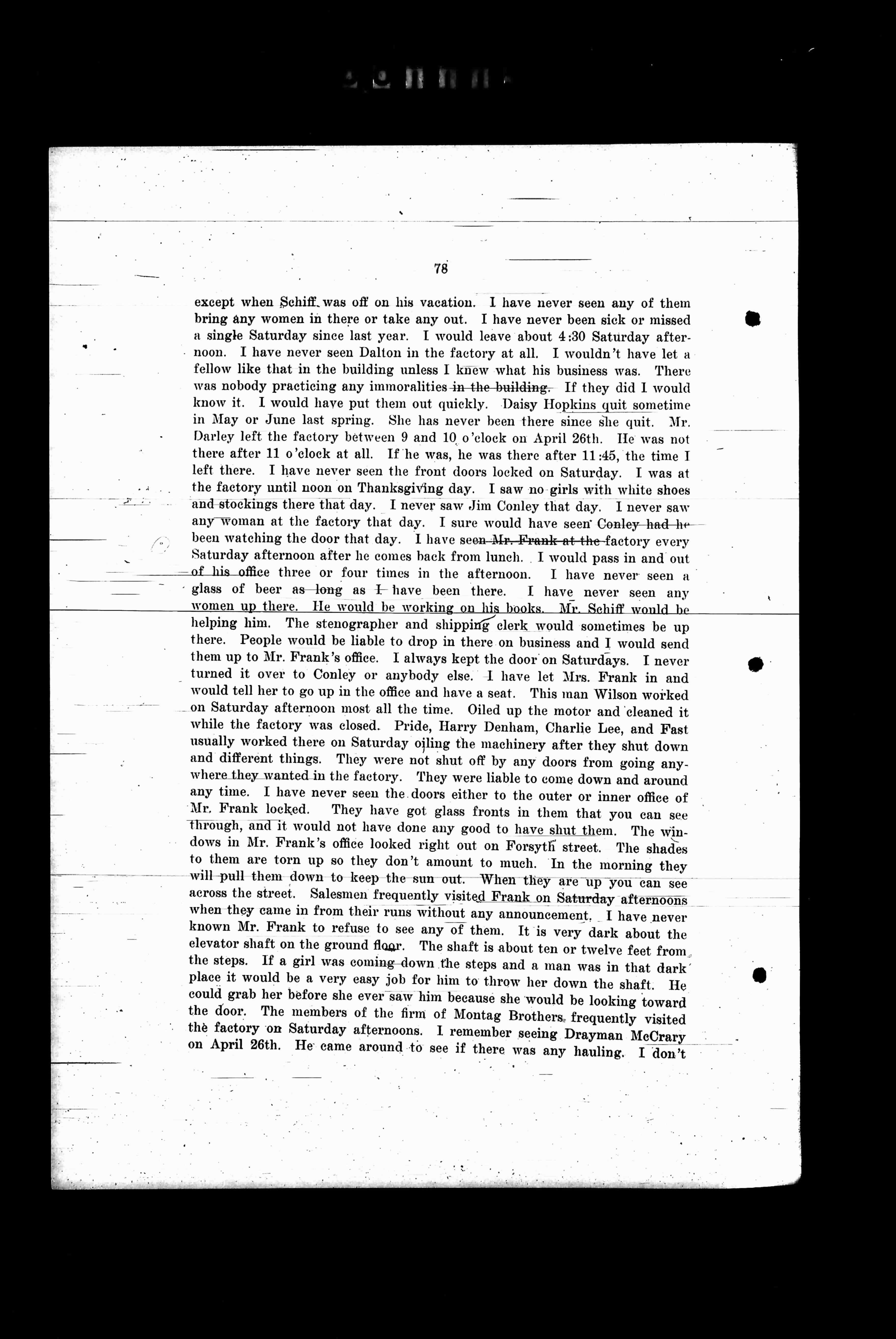 except when Schiff. was off on his vacation. I have never seen any of them bring any women in there or take any out. I have never been sick or missed a single Saturday since last year. I would leave about 4.30 Saturday after- noon. I have never seen Dalton in the factory at all. I wouldn't have let a fellow like that in the building unless I knew what his business was. There was nobody practicing any immoralities in the building. If they did I would know it. I would have put them out quickly. Daisy Hopkins quit sometime in May or June last spring. She has never been there since she quit. Mr. Darley left the factory between 9 and 10 o'clock on April 26th. He was not there after 11 o'clock at all. If he was there after 11.45, the time I left there. I have never seen the front doors locked on Saturday. I was at the factory until noon on Thanksgiving day. I saw no girls with white shoes and stockings there that day. I never saw Jim Conley that day. I never saw any woman at the factory that day. I sure would have seen Conley had he been watching the door that day. I have seen Mr. Frank at the factory every Saturday afternoon after he comes back from lunch. I would pass in and out of his office three or four times in the afternoon. I have never seen a glass of beer as -long as I have been there. I have never seen any women up there. He would be working on his books. Mr. Schiff would be helping him. The stenographer and shipping clerk would sometimes be up there. People would be liable to drop in there on business and I would send them up to Mr. Frank's office. I always kept the door on Saturdays. I never turned it over to Conley or anybody else. I have let Mrs. Frank in and would tell her to go up in the office and have a seat. This man Wilson worked on Saturday afternoon most all the time. Oiled up the motor and cleaned it while the factory was closed. Pride, Harry Denham, Charlie Lee, and Fast usually worked there on Saturday oiling the machinery after they shut down and different things. They were not shut off by any doors from going any- where they wanted in the factory. They were liable to come down and around any time. I have never seen the doors either to the outer or inner office of Mr. Frank locked. They have got glass doors in them that you can see through, and it would not have done any good to have shut them. The win- dows in Mr. Frank's office looked right out on Forsyth street. The shades to them are torn up so they don't amount to much. In the morning they will pull them down to keep the sun out. When they are up you can see across the street. Salesmen frequently visited Frank on Saturday afternoons when they came in from their runs without any announcement. I have never known Mr. Frank to refuse to see any of them. It is very dark about the elevator shaft on the ground floor. The shaft is about ten or twelve feet from the steps. If a girl was coming down the steps and a man was in that dark place it would be a very easy job for him to throw her down the shaft. He could grab her before she ever saw him because she would be looking toward the door. The members of the firm of Montag Brothers. frequently visited the factory on Saturday afternoons. I remember seeing Drayman McCrary on April 26th. He came around to see if there was any hauling. I don't