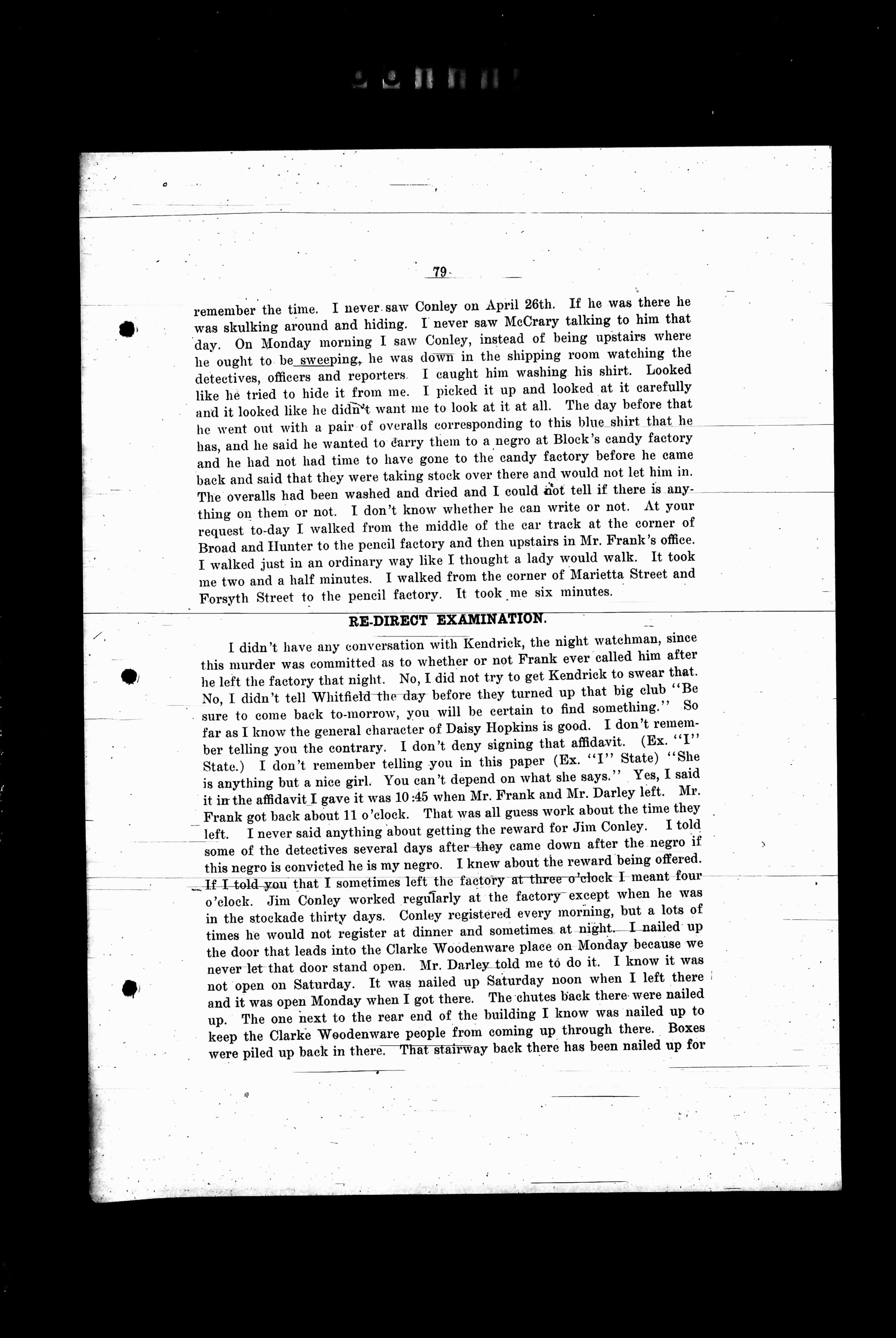 remember the time. I never saw Conley on April 26th. If he was there he was skulking around and hiding. I never saw McCrary talk to him that day. On Monday morning I saw Conley, instead of being upstairs where he ought to be sweeping, he was down in the shipping room watching the detectives, officers and reporters. I caught him washing his shirt. Looked like he tried to hide it from me. I picked it up and looked at it carefully and it looked like he didn’t want me to look at it all. The day before that he went out with a pair of overalls corresponding to this blue shirt that he has, and he said he wanted to carry them to a negro at Block’s candy factory and he had not had time to have gone to the candy factory before he came back and said that they were taking stock over there and would not let him in. The overalls had been washed and dried and I could not tell if there is anything on them or not. I don’t know whether he can write or not. At your request to-day I walked from the rear end of the car track at the corner of Broad and Hunter to the pencil factory and then upstairs in Mr. Frank’s office. I walked just in an ordinary way like I thought a lady would walk. It took me two and a half minutes. I walked from the corner of Marietta Street and Forsyth Street to the pencil factory. It took me six minutes.