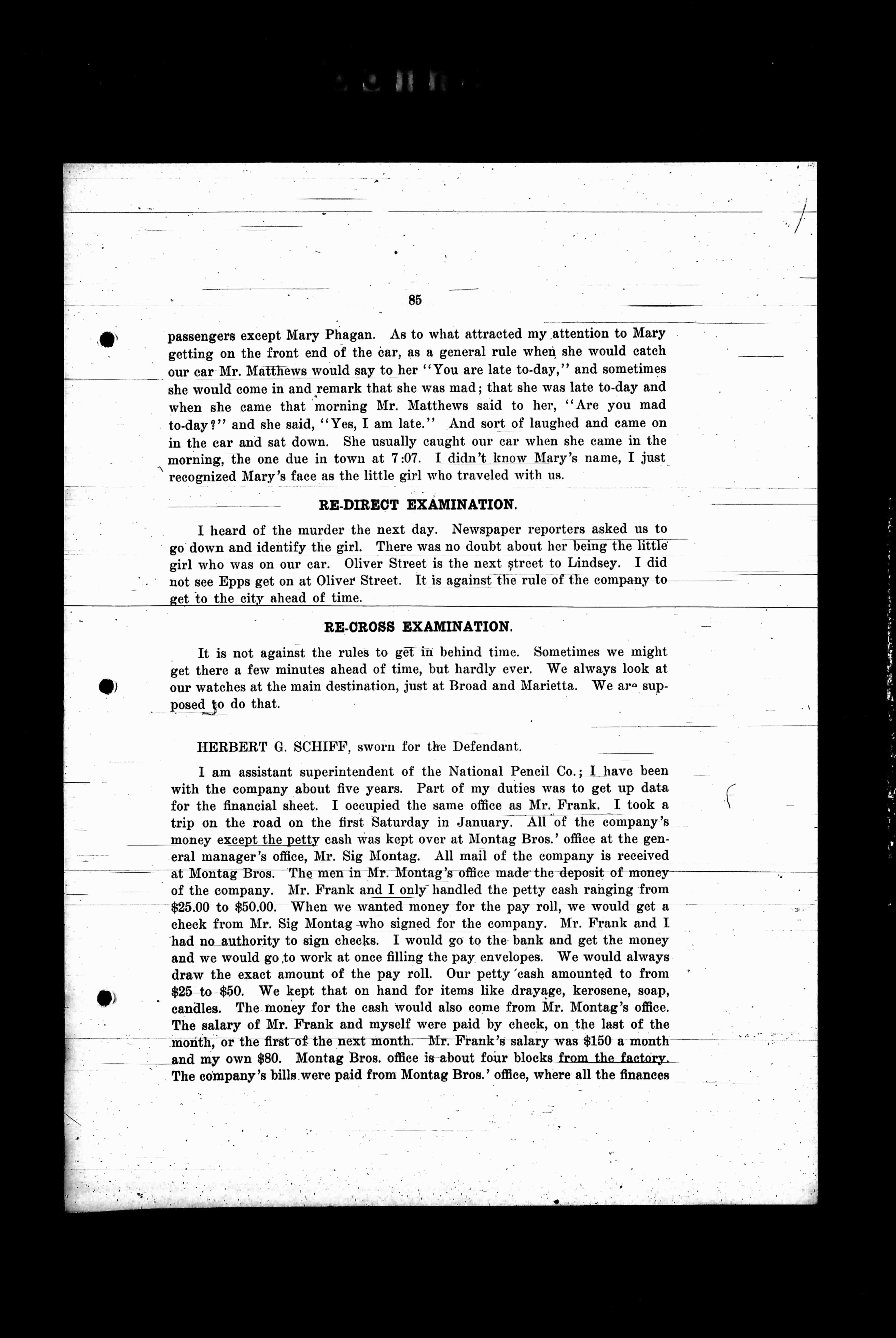 passengers except Mary Phagan. As to what attracted my attention to Mary getting on the front end of the car, as a general rule when she would catch our car Mr. Matthews would say to her "You are late to-day," and sometimes she would come in and remark that she was mad; that she was late to-day and when she came that morning Mr. Matthews said to her, "Are you mad to-day ?" and she said, "Yes, I am late." And sort of laughed and came on in the car and sat down. She usually caught our car when she came in the morning, the one due in town at 7:07. I didn't know Mary's name, I just recognized Mary's face as the little girl who traveled with us.