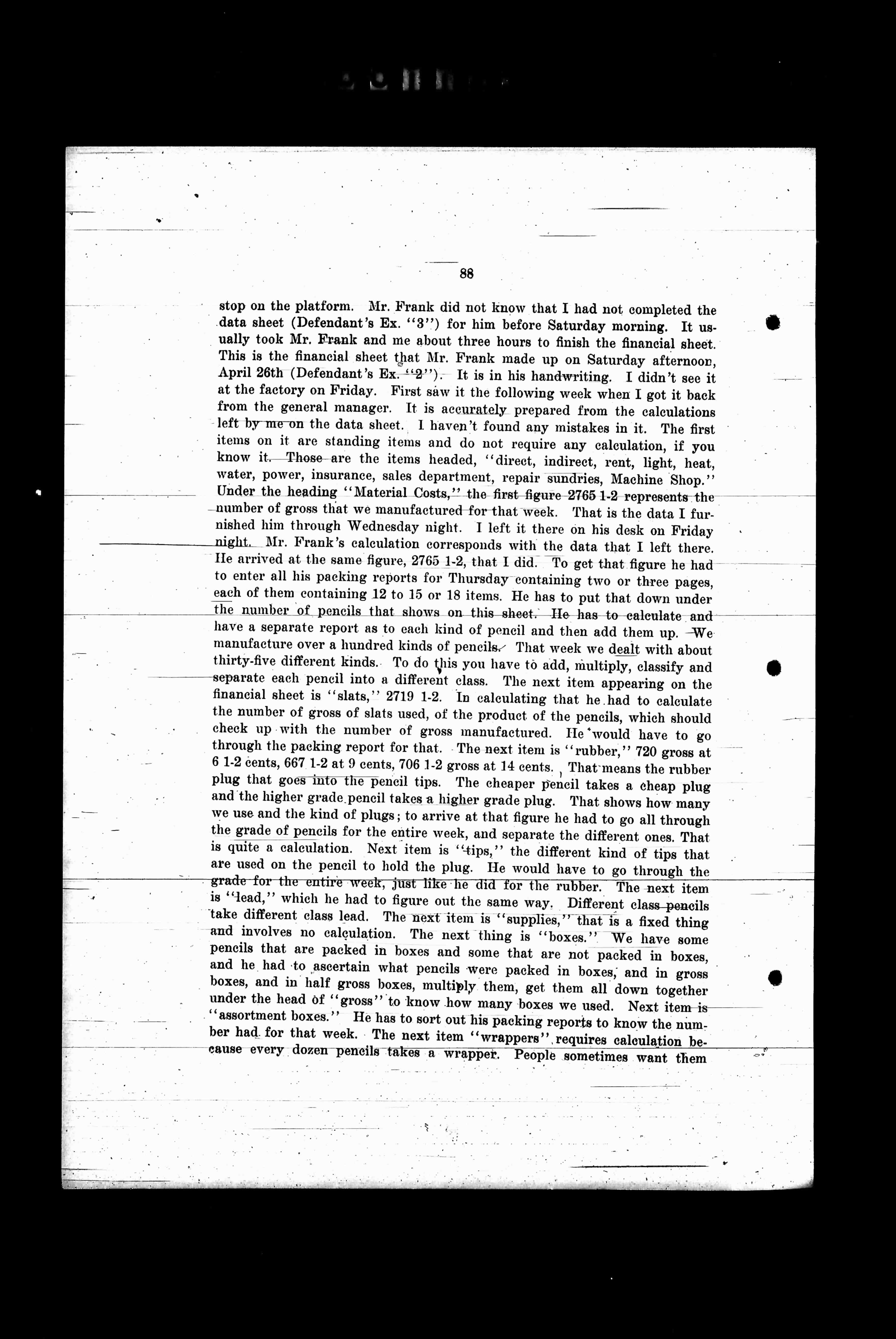 stop on the platform. Mr. Frank did not know that I had not completed the data sheet (Defendant's Ex. "8") for him before Saturday morning. It usually took Mr. Frank and me about three hours to finish the financial sheet. This is the financial sheet that Mr. Frank made up on Saturday afternoon, April 28th (Defendant's Ex. "2"). It is in his handwriting. I didn't see it at the factory on Friday. First saw it the following week when I got it back from the general manager. It is accurately prepared from the calculations left by me on the data sheet. I haven't found any mistakes in it. The first items on it are standing items and do not require any calculation, if you know it. Those are the items headed, "direct, indirect, rent, light, heat, water, power, insurance, sales department, repair sundries, Machine Shop." Under the heading "Material Cost," the first figure 2765.1-2 represents the number of gross that we manufactured for that week. It is the data I furnished him through Wednesday night. I left it there on his desk on Friday night. Mr. Frank's calculation corresponds with the data that I left there. He arrived at the same figure, 2765.1-2, that I did. To get that figure he had to enter all his packing reports for Thursday containing two or three pages, each of them containing 12 to 15 or 18 items. He has to put that down under the number of pencils that shows on this sheet. He has to calculate and have a separate report as to each kind of pencil and then add them up. We manufacture over a hundred kinds of pencils. That week we dealt with about thirty-five different kinds. To do this you have to add, multiply, classify and separate each pencil into a different class. The next item appearing on the financial sheet is "slats," 2719.1-2. In calculating that he had to calculate the number of gross of slats used, of the product of the pencils, which should check up with the number of gross manufactured. He would have to go through the packing report for that. The next item is "rubber," 720 gross at 6.1-2 cents, 667 1-2 at 9 cents, 706 1-2 gross at 14 cents. That means the rubber plug that goes into the pencil tips. The cheaper pencil takes a cheap plug and the higher grade pencil takes a high grade plug. That shows how many we use and the kind of plugs; to arrive at that figure he had to go all through the grade of pencils for the entire week and separate the different ones. That is quite a calculation. Next item is "tips," the different kind of tips that are used on the pencil to hold the plug. He would have to go through the grade for the entire week, just like he did for the rubber. The next item is "lead," which he had to figure out the same way. Different class pencils take different class lead. The next item is "supplies," that is a fixed thing and involves no calculation. The next thing is "boxes." We have some pencils that are packed in boxes and some that are not packed in boxes, and he had to ascertain what pencils were packed in boxes, and in gross boxes, and in half gross boxes, multiply them, get them all down together under the head of "gross" to know how many boxes we used. Next item is "assortment boxes." He has to sort out his packing reports to know the number had for that week. The next item "wrappers" requires calculation because every dozen pencils takes a wrapper. People sometimes want them