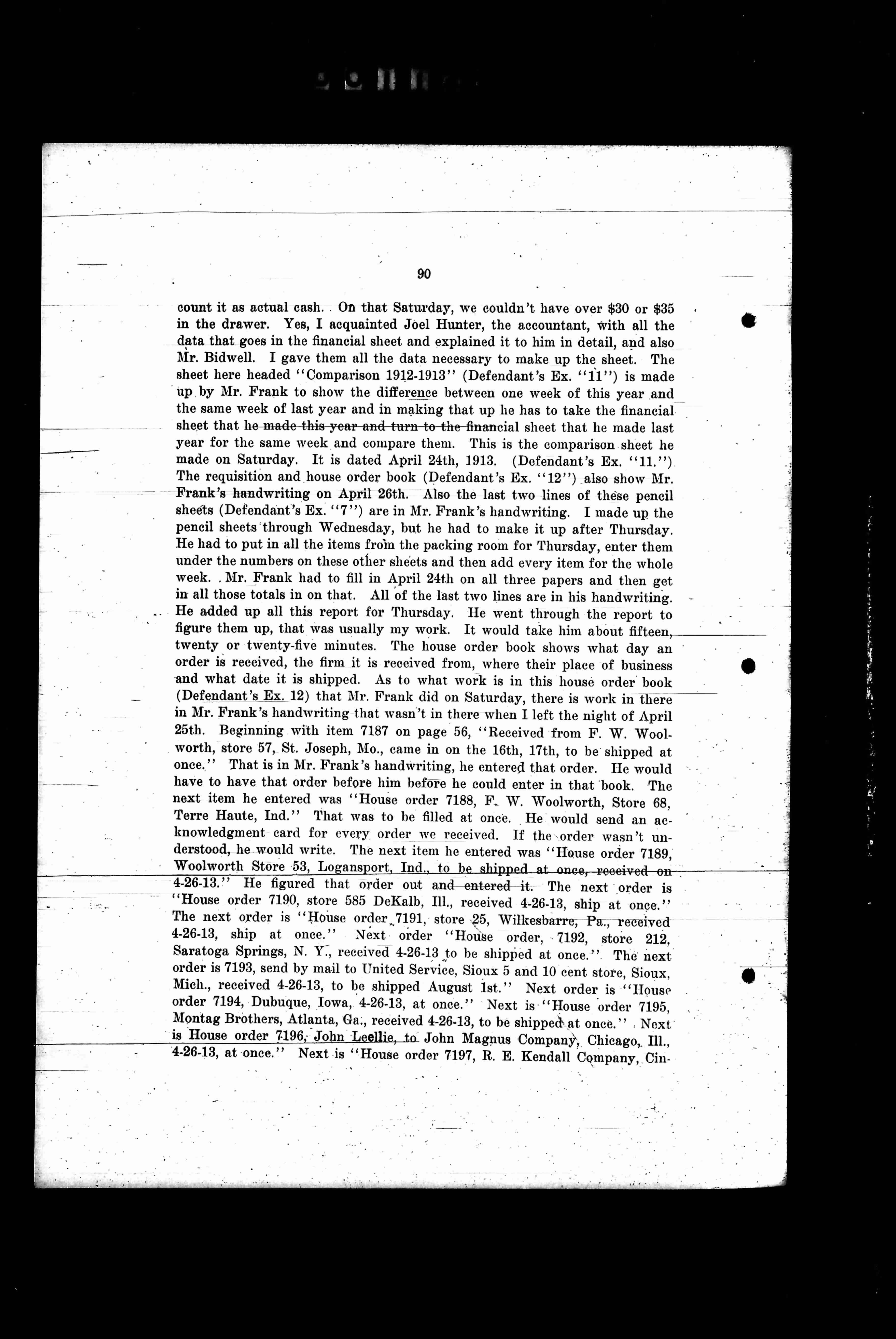 count it as actual cash. On that Saturday, we couldn't have over $30 or $35 in the drawer. Yes, I acquainted Joel Hunter, the accountant, with all the data that goes in the financial sheet and explained it to him in detail, and also Mr. Bidwell. I gave them all the data necessary to make up the sheet. The sheet here headed "Comparison 1912-1913" is Defendant's Ex. "11") is made up by Mr. Frank to show the difference between one week of this year and the same week of last year and in making that up he has to take the financial sheet that he made this year and turn to the financial sheet that he made last year for the same week and compare them. This is the comparison sheet he made on Saturday. It is dated April 24th, 1913. (Defendant's Ex. "11"). The requisition and house order book (Defendant's Ex. "12") also show Mr. Frank's handwriting on April 26th. Also the last two lines of these pencil sheets (Defendant's Ex. "7") are in Mr. Frank's handwriting. I made up the pencil sheets through Wednesday, but he had to make it up after Thursday. He had to put in all the items from the packing room for Thursday, enter them under the numbers on these other sheets and then add every item for the whole week. Mr. Frank had to fill in April 24th on all three papers and then get in all those totals in on that. All of the last two lines are in his handwriting. He added up all this report for Thursday. He went through the report to figure them up, that was usually my work. It would take him about fifteen, twenty or twenty-five minutes. The house order book shows what day an order is received, the firm it is received from, where their place of business and what date it is shipped. As to what work is in this house order book (Defendant's Ex. 12) that Mr. Frank did on Saturday, there is work in there in Mr. Frank's handwriting that wasn't in there when I left the night of April 25th. Beginning with item 1187 on page 56, "Received from F. W. Woolworth, store 57, St. Joseph, Mo., came in on the 16th, 17th, to be shipped at once." That is in Mr. Frank's handwriting, he entered that order. He would have to have that order before he could enter in that book. The next item he entered was "House order 7198, W. H. Woolworth, Store 68, Terre Haute, Ind." That was to be filled at once. He would send an acknowledgment card for every order we received. If the order wasn't understood, he would write. The next item he entered was "House order 7189, Woolworth Store 53, Logansport, Ind., to be shipped at once, received on 4-26-13." He figured that order out and entered it. The next order is "House order 7190, store 585 DeKalb, Ill., received 4-26-13, ship at once." The next order is "House order 7191, store 25, Wilkesbarre, Pa., received 4-26-13, ship at once." Next order is "House order 7192, store 212, Saratoga Springs, N. Y., received 4-26-13 to be shipped at once." The next order is 7193, send by mail to United Service, Sioux 5 and 10 cent store, Sioux, Mich., received 4-26-13, to be shipped August 1st." Next order is "House order 7194, Dubuque, Iowa, 4-26-13, at once." Next is "House order 7195, Montag Brothers, Atlanta, Ga., received 4-26-13, to be shipped at once." Next is "House order 7196, John Leedlie, to John Magnus Company, Chicago, Ill., 4-26-13, at once." Next is "House order 7197, R. E. Kendall Company, Cin-