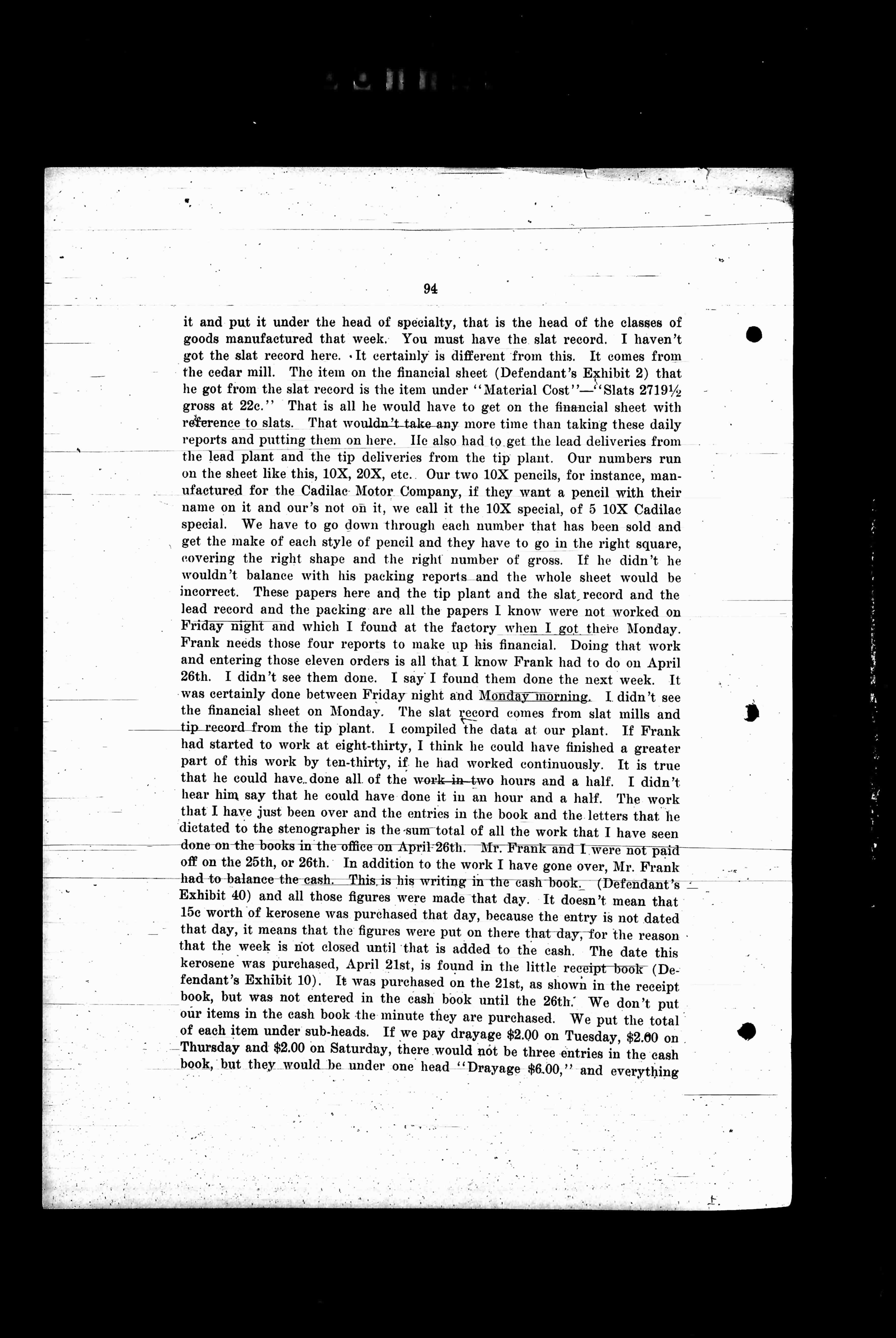 it and put it under the head of specialty, that is the head of the classes of goods manufactured that week. You must have the slat record. I haven't got the slat record here. It certainly is different from this. It comes from the cedar mill. The item on the financial sheet "Defendant's Exhibit 2) that he got from the slat record is the item under "Material Cost" -- "Slats 2719½ gross at 22c." That is all he would have to get on the financial sheet with reference to slats. That wouldn't take any more time than taking these daily reports and putting them on here. He also had to get the lead deliveries from the lead plant and the tip deliveries from the tip plant. Our numbers run on the sheet like this, 10X, 20X, etc. Our two 10X pencils, for instance, manufactured for the Cadillac Motor Company, if they want a pencil with their name on it and ours not on it, we call it the 10X special, of 5 10X Cadillac special. We have to go down through each number that has been sold and get the make of each style of pencil and they have to go in the right square, covering the right shape and the right number of gross. If he didn't he wouldn't balance with his packing reports and the whole sheet would be incorrect. These papers here and the tip plant and the slat record and the lead record and the packing are all the papers I know were not worked on Friday night and which I found at the factory when I got there Monday. Frank needs those four reports to make up his financial. Doing that work and entering those eleven orders is all that I know Frank had to do on April 26th. I didn't see them done. I say I found them done the next week. It was certainly done between Friday night and Monday morning. I didn't see the financial sheet on Monday. The slat record comes from slat mills and tip record from the tip plant. I compiled the data at our plant. If Frank had started to work at eight-thirty, I think he could have finished a greater part of this work by ten-thirty, if he had worked continuously. It is true that he could have, done all of the work-in-two hours and a half. I didn't hear him say that he could have done it in an hour and a half. The work that I have just been over and the entries in the book and the letters that he dictated to the stenographer is the sum total of the work that I have seen done on the books in the office on April 26th. Mr. Frank and I were not paid off on the 25th, or 26th. In addition to the work I have gone over, Mr. Frank had to balance the cash. This is his writing in the cash book. (Defendant's Exhibit 40) and all those figures were made that day. It doesn't mean that 15c worth of kerosene was purchased that day, because the entry is not dated that day, it means that the figures were put on there that day, for the reason that the week is not closed until that is added to the cash. The date this kerosene was purchased, April 21st, is found in the little receipt book (Defendant's Exhibit 10). It was purchased on the 21st, as shown in the receipt book, but was not entered in the cash book until the 26th. We don't put our items in the cash book the minute they are purchased. We put the total of each item under sub-heads. If we pay drayage $2.00 on Tuesday, $2.00 on Thursday and $2.00 on Saturday, there would be three entries in the cash book, but they would be under one head "Drayage $6.00," and everything