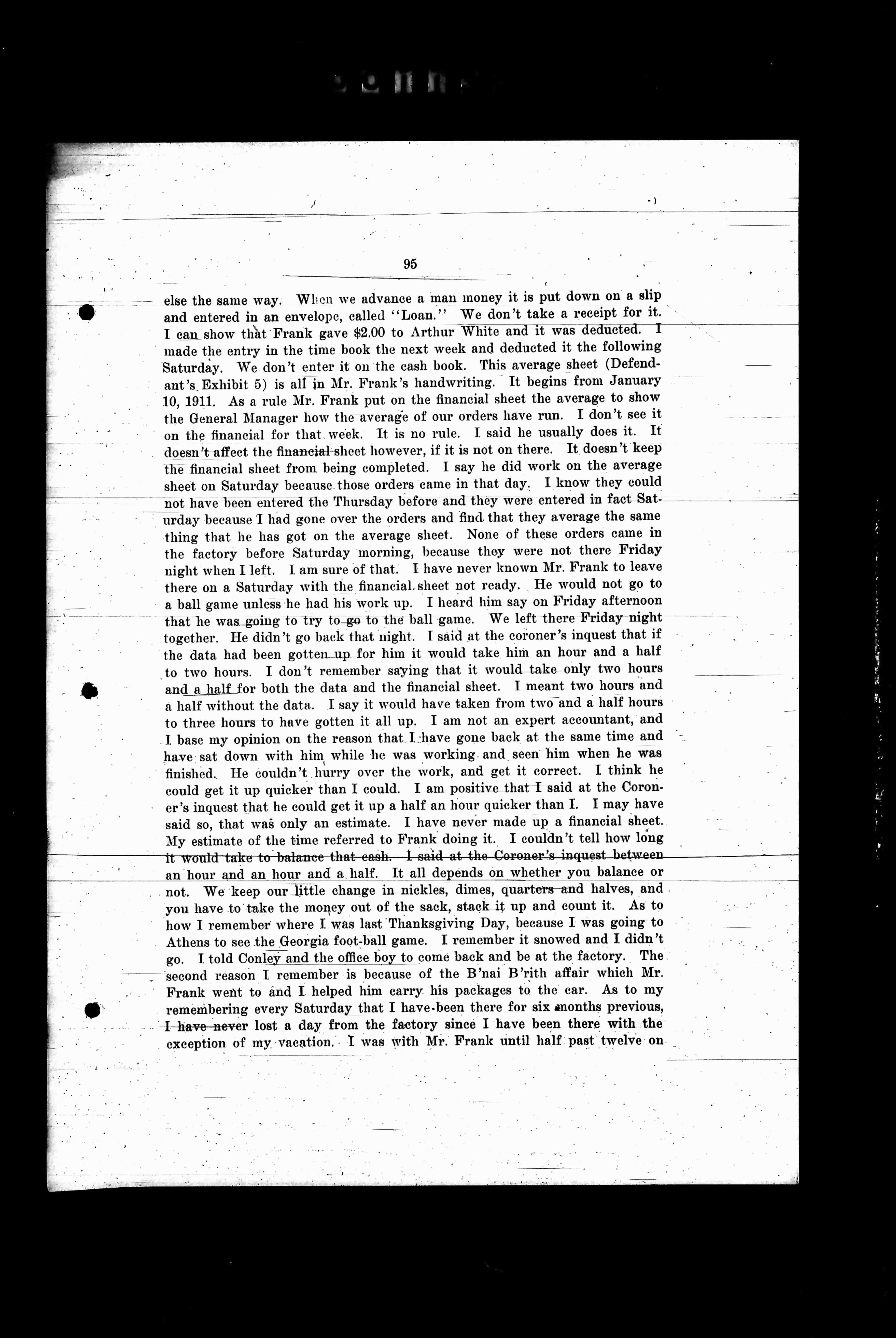 else the same way. When we advance a man money it is put down on a slip and entered in an envelope, called "Loan." We don't take a receipt for it. I can show that Frank gave $2.00 to Arthur White and it was deducted. I made the entry in the time book the next week and deducted it the following Saturday. We don't enter it on the cash book or average sheet (Defendant's Exhibit 5) as all in Mr. Frank's handwriting. It begins from January 10, 1911. As a rule Mr. Frank put on the financial sheet the average to show the General Manager how the average of our orders have run. I don't see it on the financial for that week. It is no rule. I said he usually does it. It doesn't affect the financial sheet however, if it is not on there. It doesn't keep the financial sheet from being completed. I say he did work on the average sheet on Saturday because those orders came in that day. I know they could not have been entered the Thursday before and they were entered in fact Saturday because I had gone over the orders and find that they average the same thing that he has got on the average sheet. None of these orders came in the factory before Saturday morning, because they were not there Friday night when I left. I am sure of that. I have never known Mr. Frank to leave there on a Saturday with the financial sheet not ready. He would not go to a ball game unless he had his work up. I heard him say on Friday afternoon that he was going to try to-go to the ball game. We left there Friday night together. He didn't go back that night. I said at the coroner's inquest that if the data had been gotten up for him it would take him an hour and a half to two hours. I don't remember saying that it would take only two hours and a half for both the data and the financial sheet. I meant two hours and a half without the data. I say it would have taken from two and a half hours to three hours to have gotten it all up. I am not an expert accountant, and I base my opinion on the reason that I have gone back at the same time and have sat down with him while he was working and seen him when he was finished. He couldn't hurry over the work, and get it correct. I think he could get it up quicker than I could. I am positive that I said at the Coroner's inquest that he could get it up a half an hour quicker than I. I may have said so, that was only an estimate. I have never made up a financial sheet. My estimate of the time referred to Frank doing it. I couldn't tell how long it would take to balance that each-I said at the Coroner's inquest between an hour and an hour and a half. It all depends on whether you balance or not. We keep our little change in nickles, dimes, quarters and halves, and you have to take the money out of the sack, stack it up and count it. As to how I remember where I was last Thanksgiving Day, because I was going to Athens to see the Georgia foot-ball game. I remember it snowed and I didn't go. I told Conley and the office boy to come back and be at the factory. The second reason I remember is because on the 8th of April which Mr. Frank went to and I helped him carry his packages to the car. As to my remembering every Saturday that I have been there for six months previous, I have never lost a day from the factory since I have been there with the exception of my vacation. I was with Mr. Frank until half past twelve on