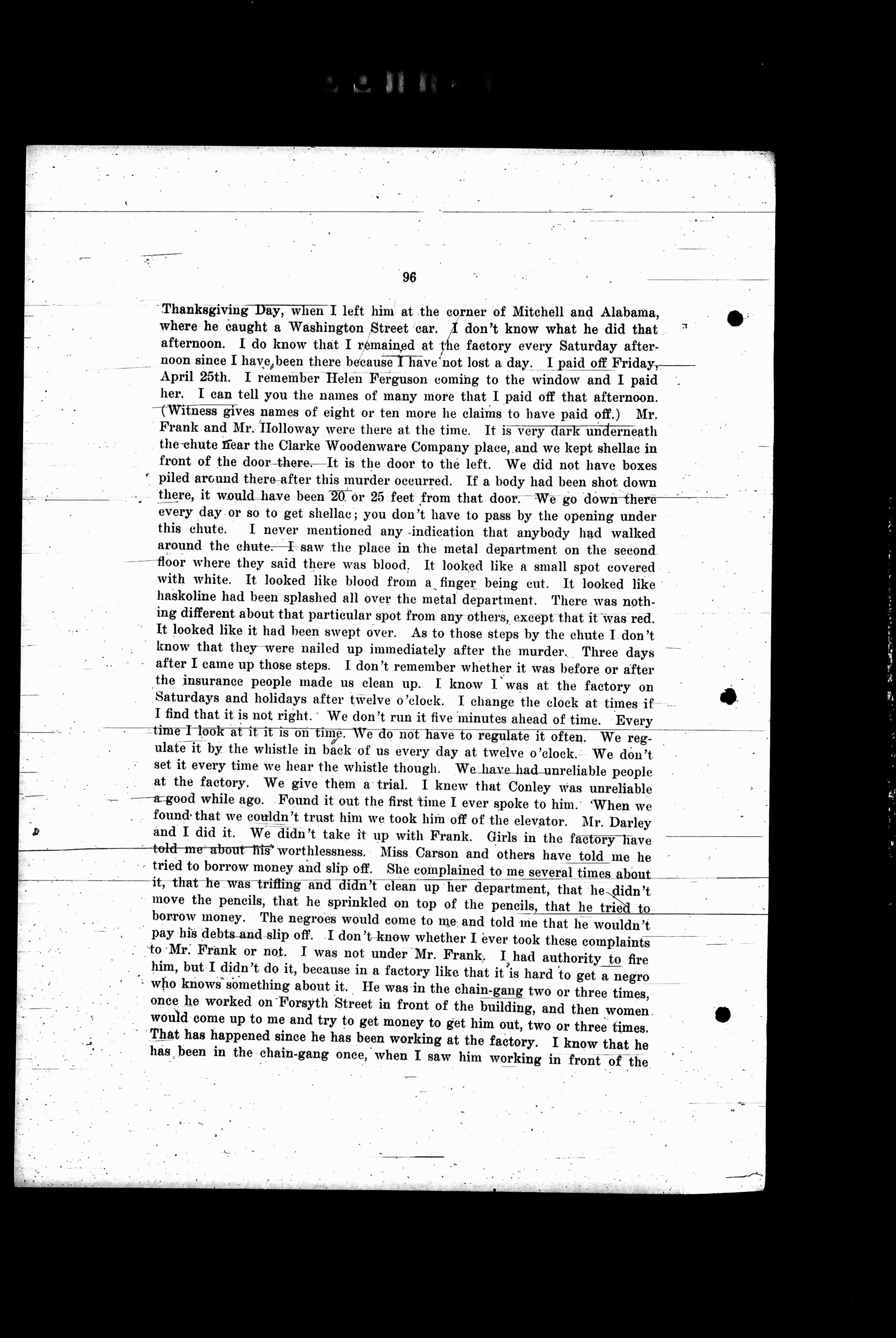 Thanksgiving Day, when I left him at the corner of Mitchell and Alabama, where he caught a Washington Street car. I don't know what he did that afternoon. I do know that I remained at the factory every Saturday afternoon since I have been there because I have nothing else to do. I paid off, April 25th. I remember Helen Ferguson coming to the window and I paid her. I can tell you the names of many more that I paid off that afternoon. (Witness gives names of eight or ten more he claims to have paid off.) Mr. Frank and Mr. Holloway were there at the time. It is very dark underneath the chute near the Clarke Woodenware Company place, and we kept shellac in front of the door-there- It is the door to the left. We did not have boxes piled around there after this murder occurred. If a body had been shot down there, it would have been 20 or 25 feet from that door. We go down there every day or so to get shellac; you don't have to pass by the opening under this chute. I never mentioned any indication that anybody had walked around the chute.- I saw the place in the metal department on the second floor where they said there was blood. It looked like a small spot covered with white. It looked like blood from a finger being cut. It looked like haskoline had been splashed all over the metal department. There was nothing different about that particular spot from any others, except that it was red. It looked like it had been swept over. As to those steps by the chute I don't know that they were nailed up immediately after the murder. Three days after I came up those steps. I don't remember whether it was before or after the insurance people made us clean up. I know I was at the factory on Saturdays and holidays after twelve o'clock. I change the clock at times if I find that it is not right. We don't run five minutes ahead of time. Every time I look at it it is on time.- We do not have to regulate it often. We regulate it by the whistle in back of us every day at twelve o'clock. We don't set it every time we hear the whistle though. We have had unreliable people at the factory. We give them a trial. I knew that Conley was unreliable a-good while ago. Found it out the first time I ever spoke to him. "When we found that we couldn't trust him we took him off the elevator. Mr. Darley and I did it. We didn't take it up with Frank or ask him. When we told me about me" he worthlessmess. Miss Carson and others have told me he tried to borrow money and slip off. She complained to me several times about it, that he was trifling and didn't clean up her department, that he didn't move the pencils, that he sprinkled on top of the pencils, that he tried to borrow money. The negroes would come to me and told me that he wouldn't pay his debts-and slip off. I don't know whether I ever took these complaints to Mr. Frank or not. I was not under Mr. Frank. I had authority to fire him, but I didn't do it, because in a factory like that it is hard to get a negro who knows something about it. He was in the chain-gang two or three times, once he worked on Forsyth Street in front of the building, and then women would come up to me and try to get money to get him out, two or three times. That has happened since he has been working at the factory. I know that he has been in the chain-gang once, when I saw him working in front of the