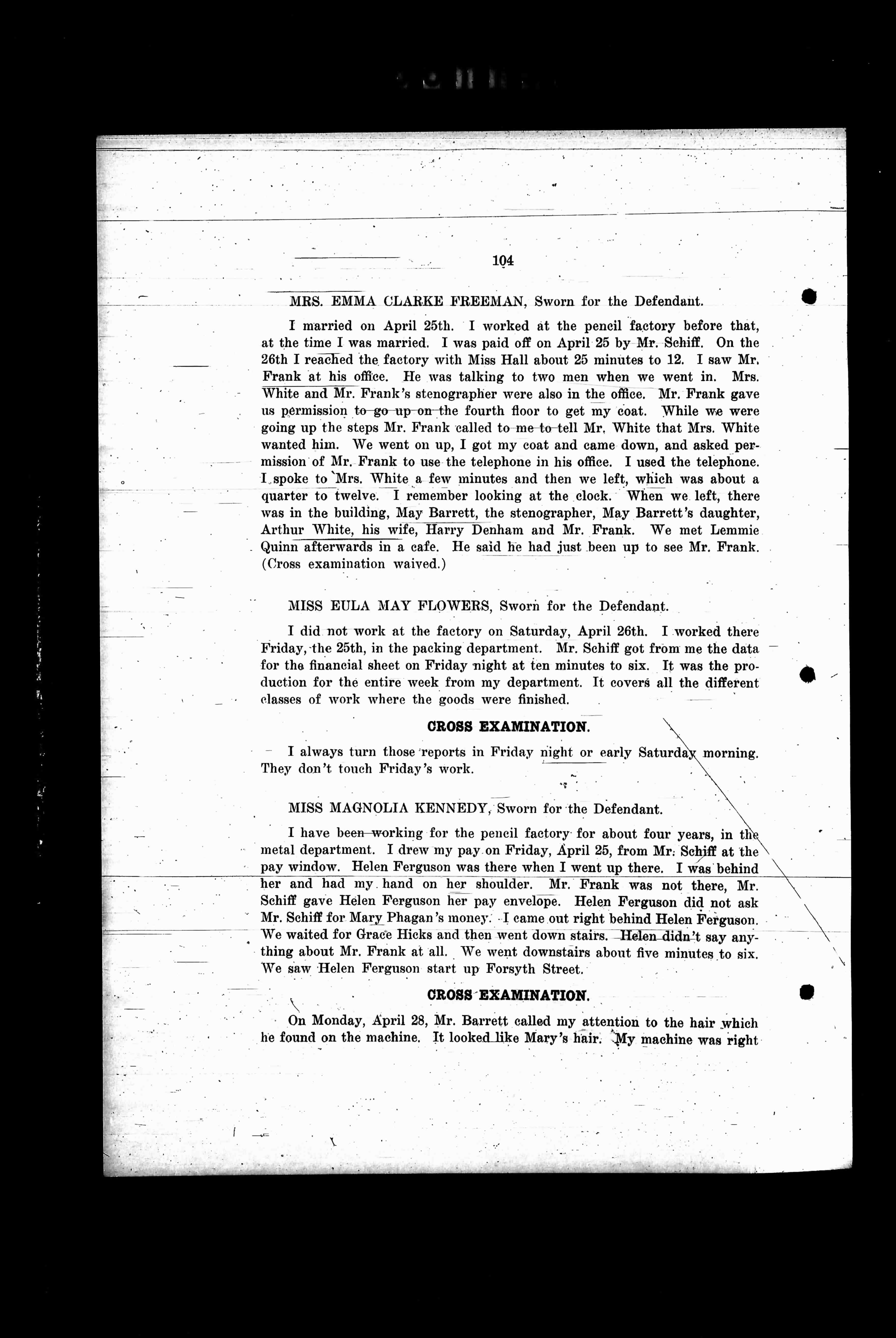 I married on April 25th. I worked at the pencil factory before that, at the time I was married. I was laid off on April 25 by Mr. Schiff. On the 26th I reached the factory when the bell about 25 minutes to 12. I saw Mr. Frank at his office. He was talking to two men when we went in. Mrs. White and Mr. Frank’s stenographer were also in the office. Mr. Frank gave us permission to go up on the fourth floor to get my coat. While we were going up the steps Mr. Frank called to me to tell Mr. White that Mrs. White wanted him. We went on up, I got my coat and came down, and asked permission of Mr. Frank to use the telephone in his office. I used the telephone. I spoke to Mrs. White a few minutes and then we left, which was about a quarter to twelve. I remember looking at the clock. When we left, there was in the building, May Barrett, the stenographer, May Barrett’s daughter, Arthur White, his wife, Darley Denham and Mr. Frank. We met Lemmie Quinn afterwards in a cafe. He said he had just been up to see Mr. Frank. (Cross examination waived.)