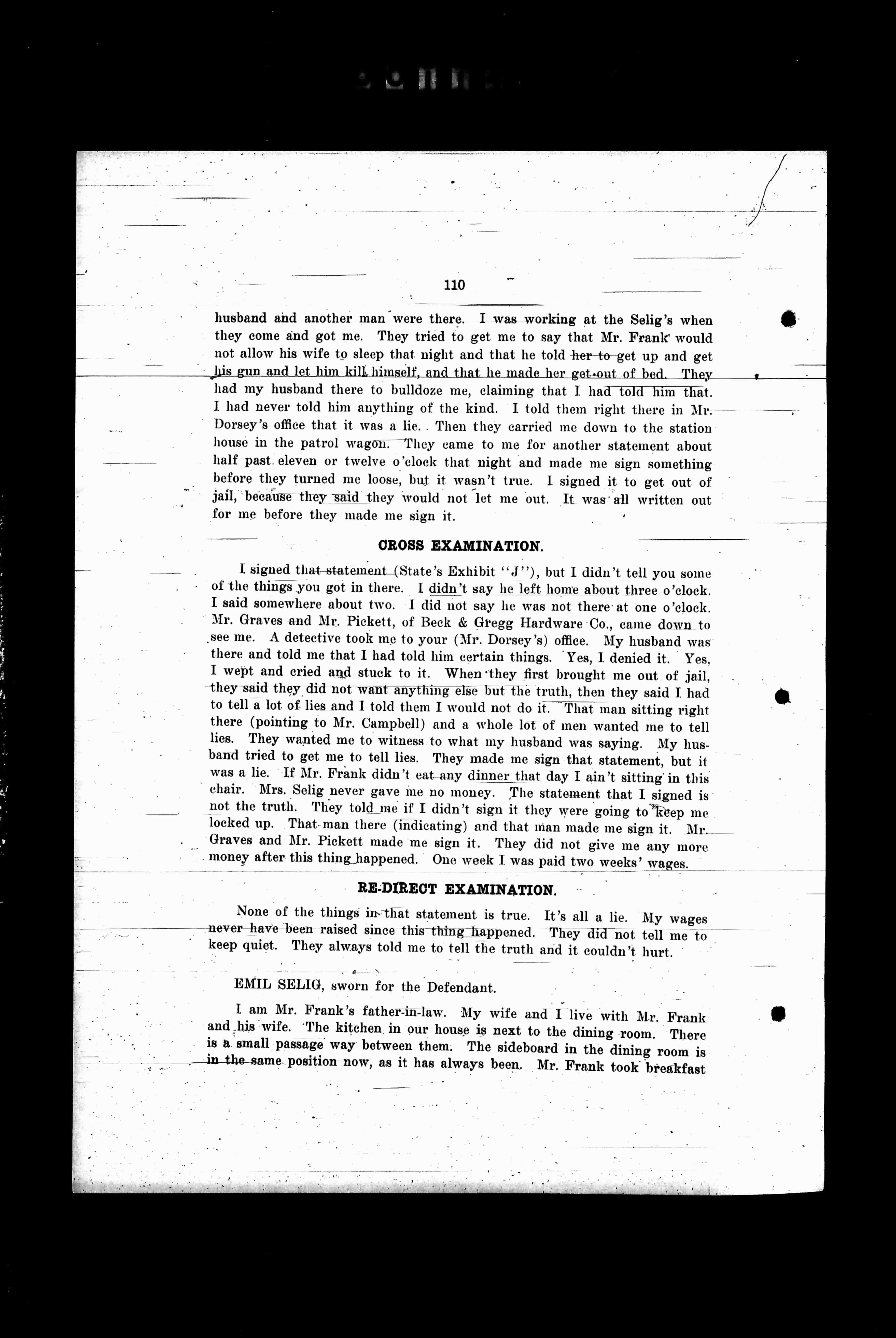 I signed that statement (State's Exhibit "J"), but I didn't tell you some of the things you got in there. I didn't say he left home about three o'clock. I said somewhere about two. I did not say he was not there at one o'clock. Mr. Graves and Mr. Pickett, of Beck & Gregg Hardware Co., came down to see me. A detective took me to your (Mr. Dorsey's) office. My husband was there and told me that I had told him certain things. Yes, I denied it. Yes, I wept and cried and stuck to it. When they first brought me out of jail, they said they did not want anything else but the truth, then they said I had to tell a lot of lies and I told them I would not do it. That man sitting right there (pointing to Mr. Campbell) and a whole lot of men wanted me to tell lies. They wanted me to witness to what my husband was saying. My husband tried to get me to tell lies. They made me sign that statement, but it was a lie. If Mr. Frank didn't eat any dinner that day I ain't sitting in this chair. Mrs. Selig never gave me no money. The statement that I signed is not the truth. They told me if I didn't sign it they were going to keep me locked up. That man there (indicating) and that man made me sign it. Mr. Graves and Mr. Pickett made me sign it. They did not give me any more money after this thing happened. One week I was paid two weeks' wages.